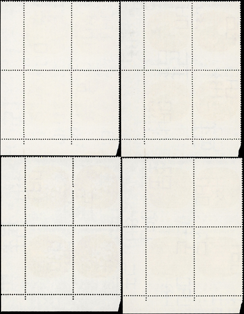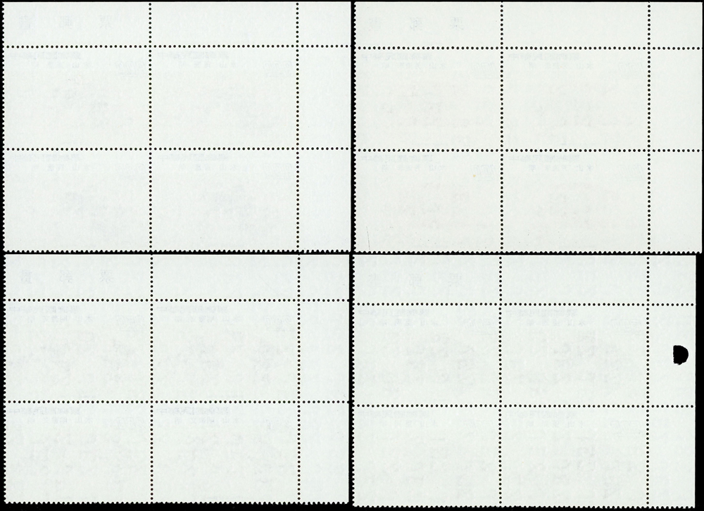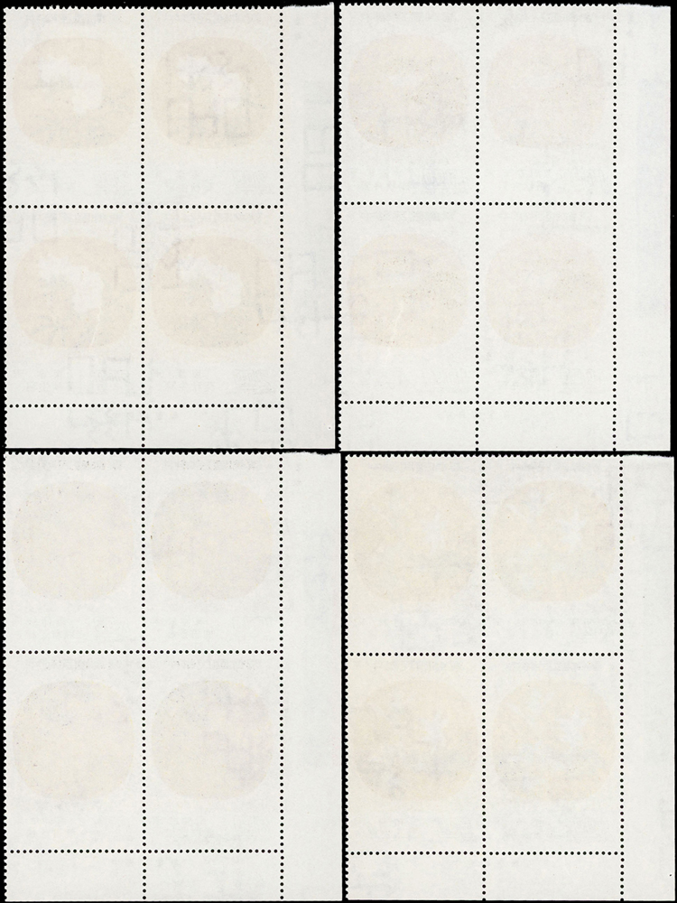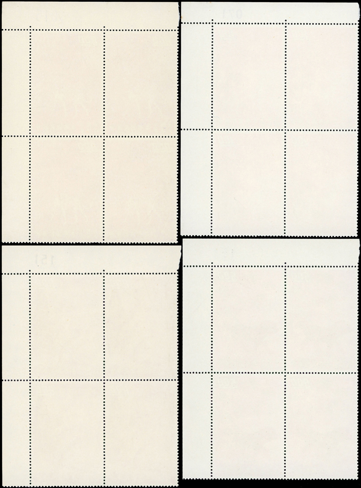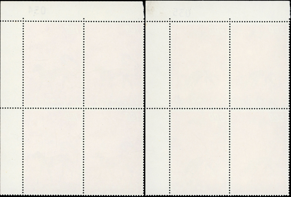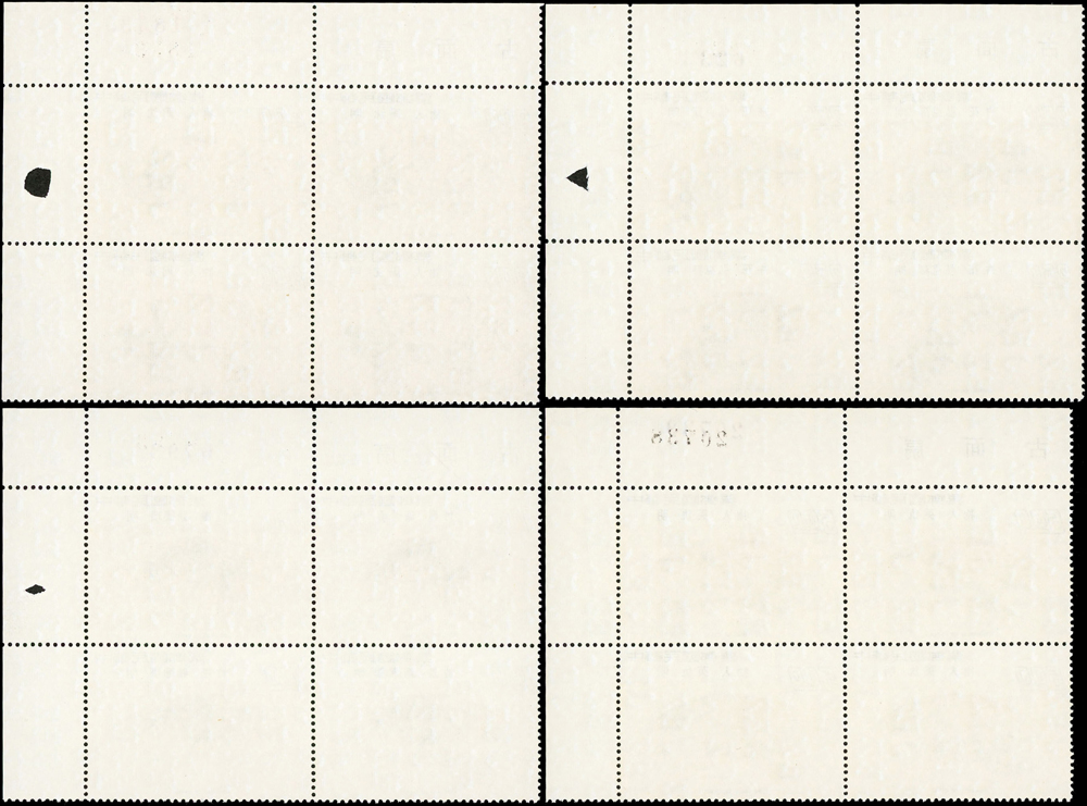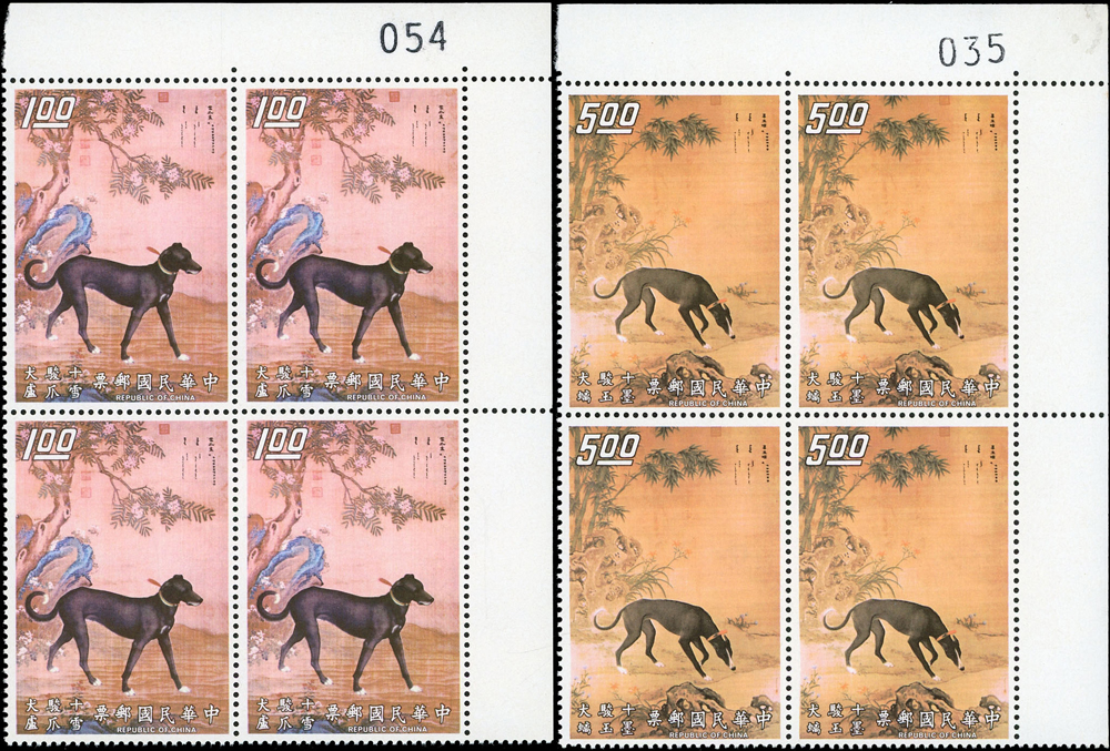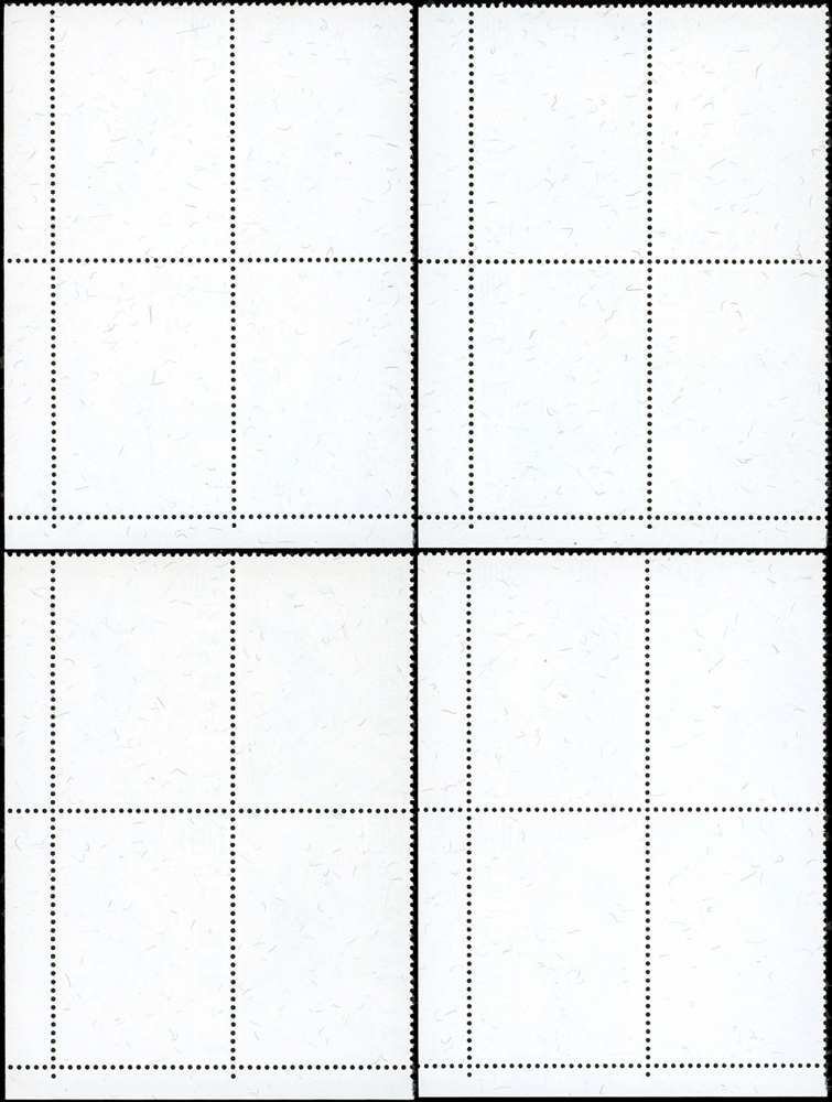 故宮古畫4方連新票7組,共28套,均帶雙邊紙,部分兼帶廠銘或張號,包括有:十駿犬(帶同位右上角雙邊紙張號).人物圖.歲寒三友.扇面古畫(一).(三).(四).(五)輯,均原膠無黃斑,其中十駿犬些許原紙壓痕,其餘VF