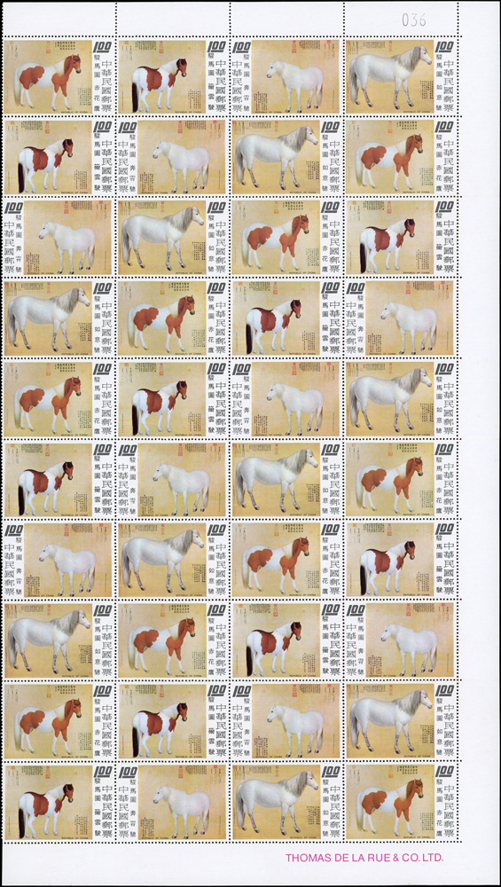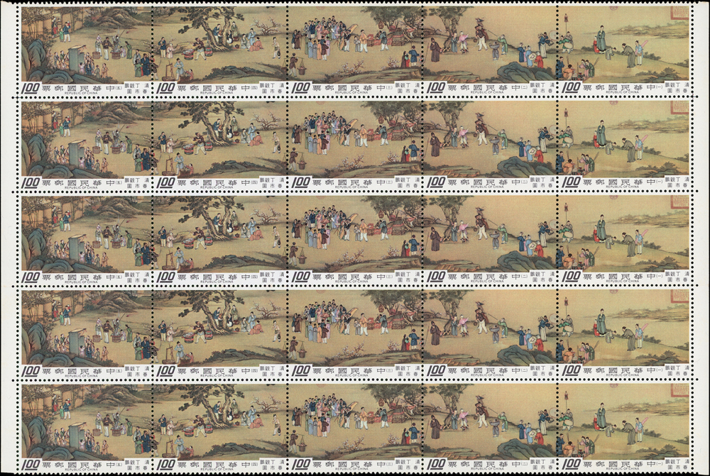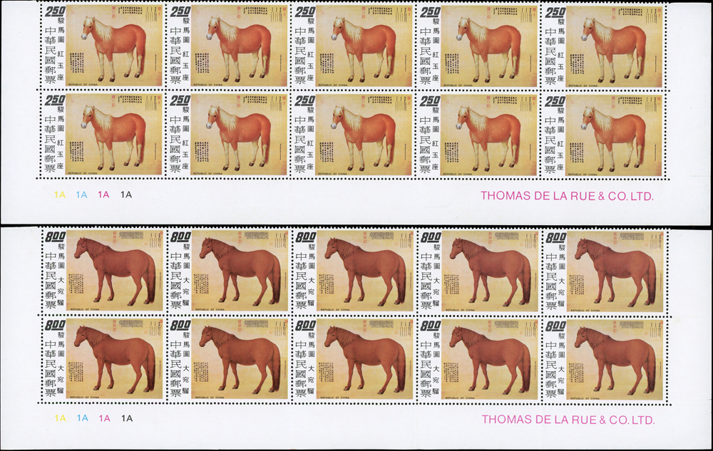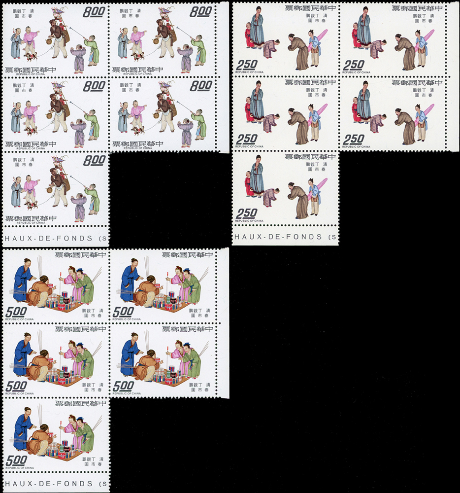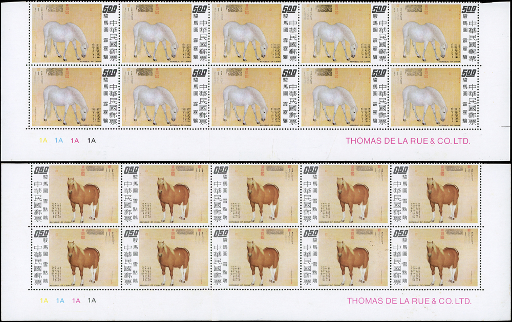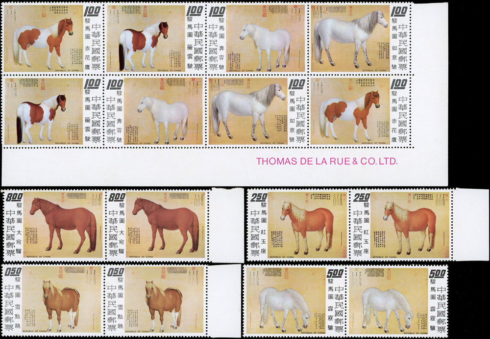 故宮古畫新票:(1)專97.駿馬圖古畫8全10方連及雙連,共12套,均帶邊紙,其中5元10方連一道原紙斜摺痕,其餘皆有少許淡斑點及軟印痕,VF-F;(2)專109.清丁觀鵬春市圖古畫8全5方連帶邊紙,連刷票齒折,局部齒緣淡黃,VF-F;歡迎至官網瀏覽全貌