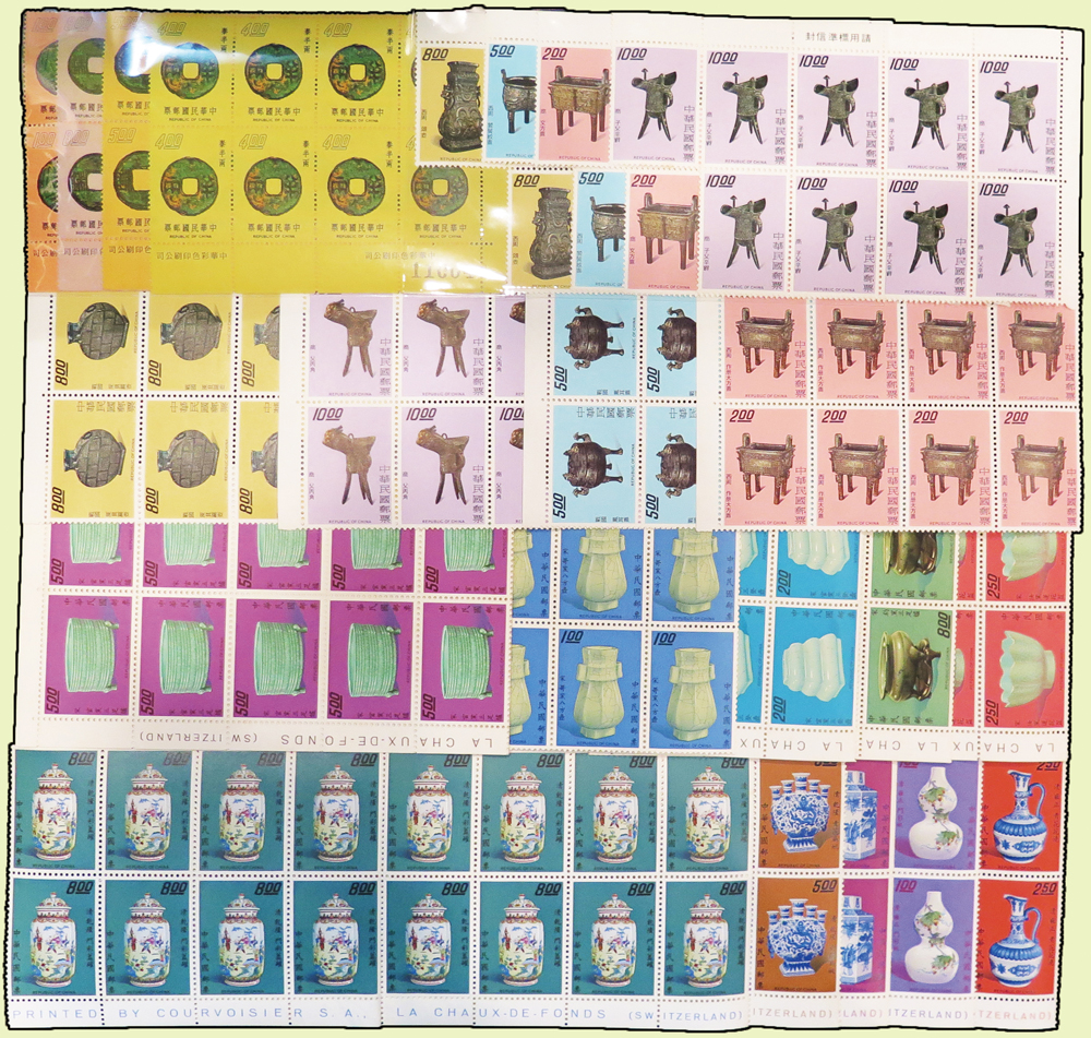 故宮古物新票:(1)專99.宋瓷5全20方連帶三邊紙,其中8元及2.5元背面淡斑點,VF-F;(2)專83.清瓷5全16方連帶邊紙,其中2.5元.2元.1元背面較多淡黃斑,VF-F;(3)專118.古代銅器(64年版)4全8方連,帶同位左上角雙邊紙張號,少數齒淡黃,VF-F;(4)專125.古代銅器(65年版)4全9方連,帶同位右上角雙邊紙,少數齒淡黃,VF-F;(5)專112.古代錢幣(64年版)4全8方連,帶同位右下角雙邊紙張號,少數齒淡黃,VF-F