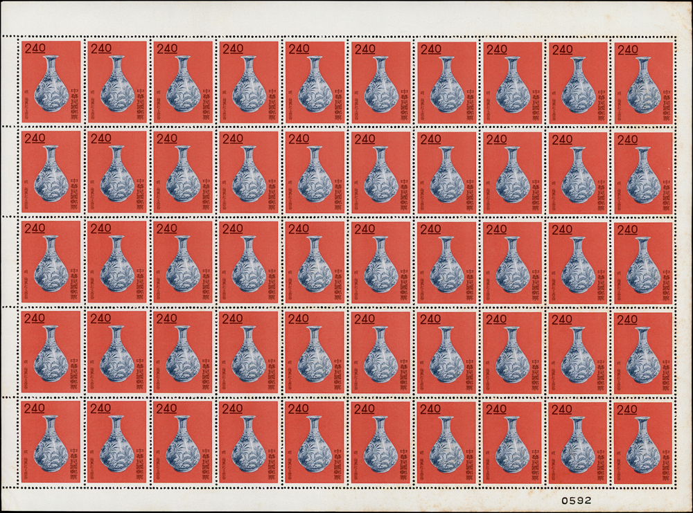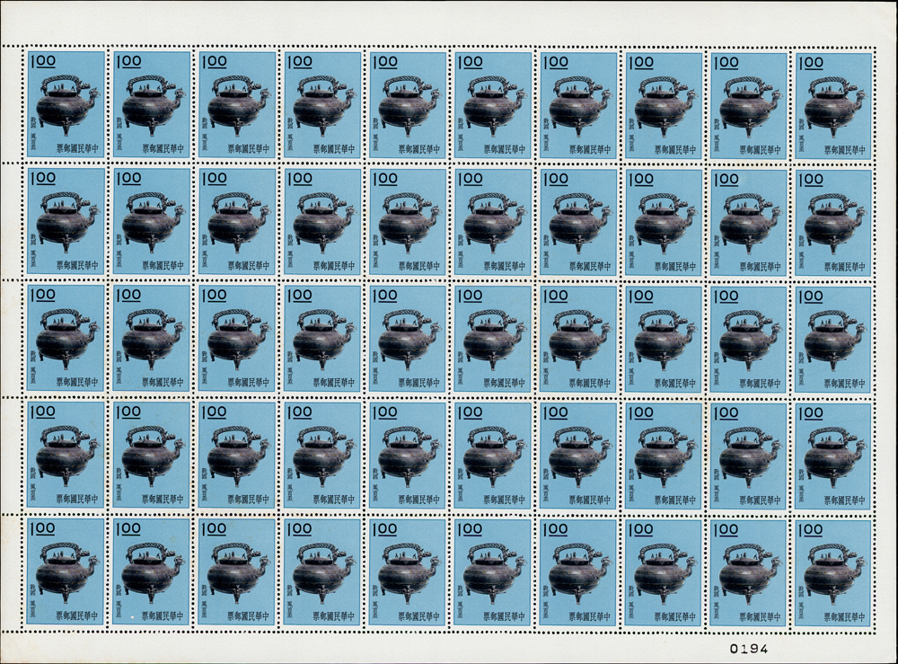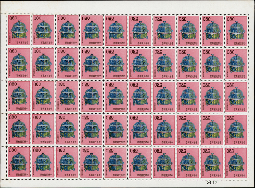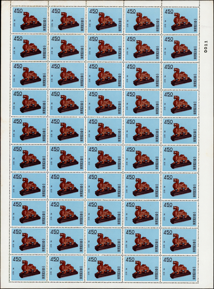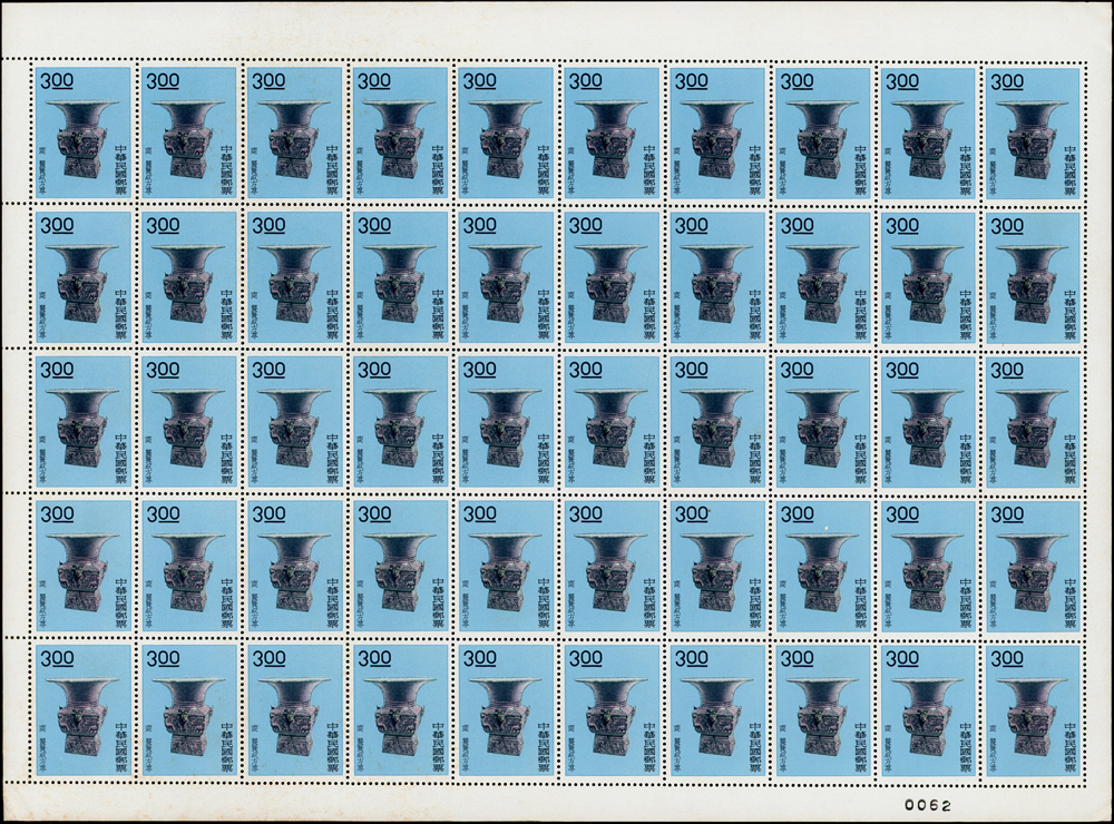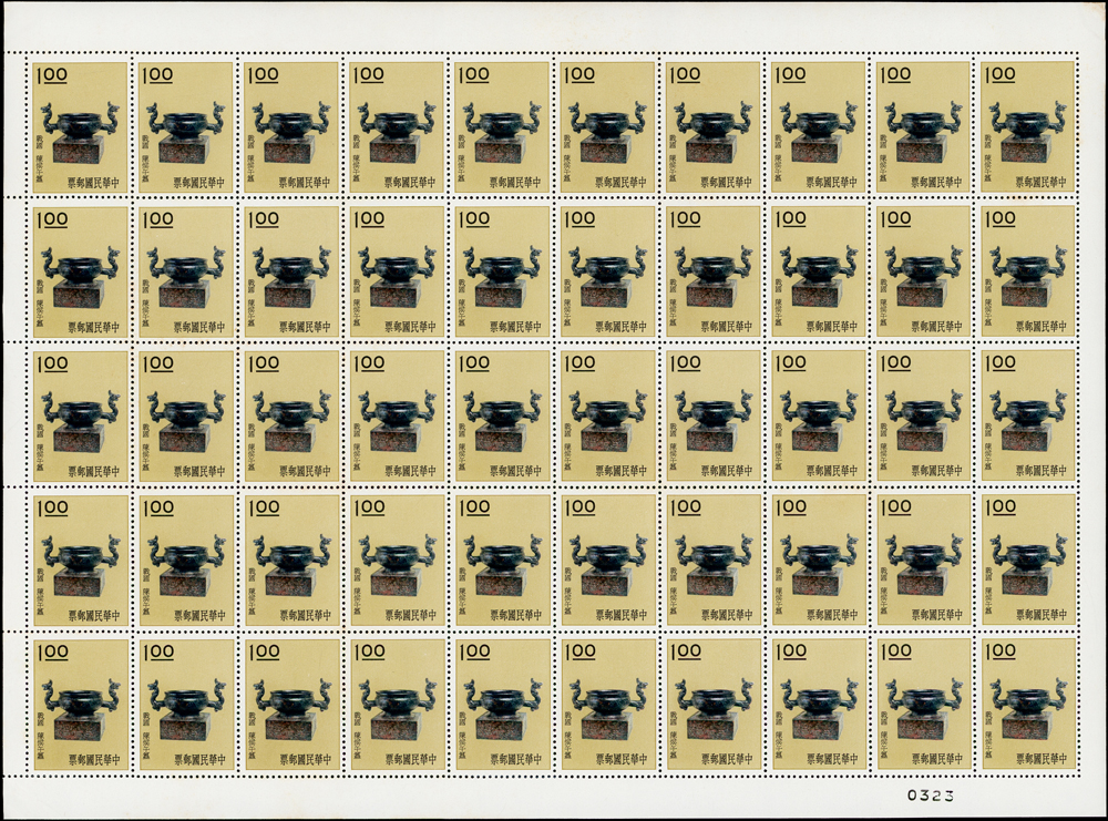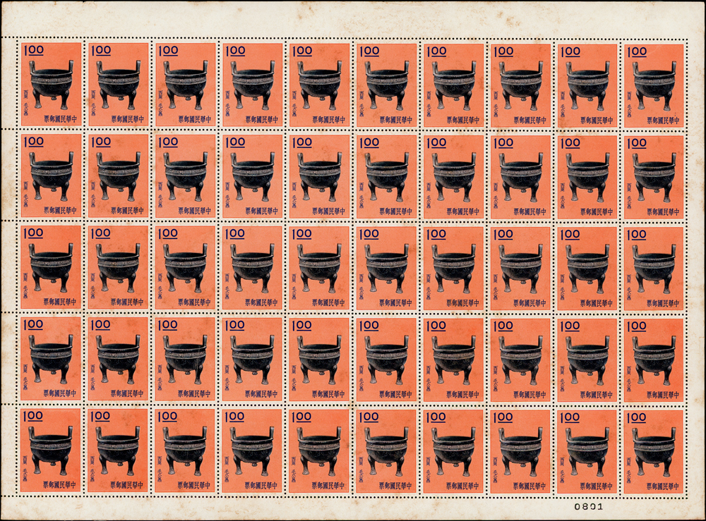 專19.故宮古物前十八寶新票18全一全張50套,原膠折版,其中西周毛公鼎正背面大面積黃斑,其餘均正背面局部淡斑點或齒緣淡黃,西周散盤右側二道壓痕,F-VF(Page 83)