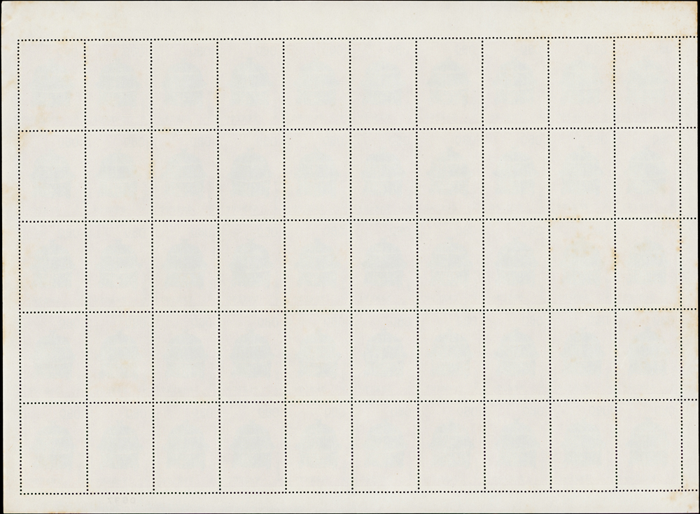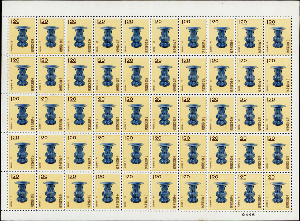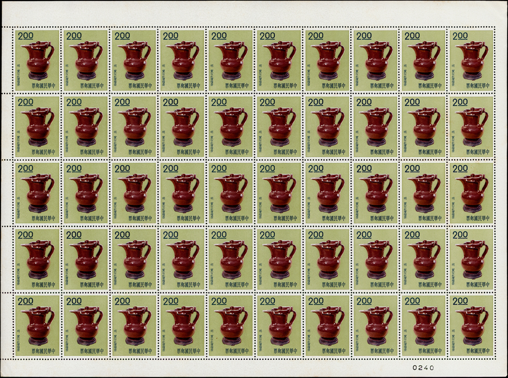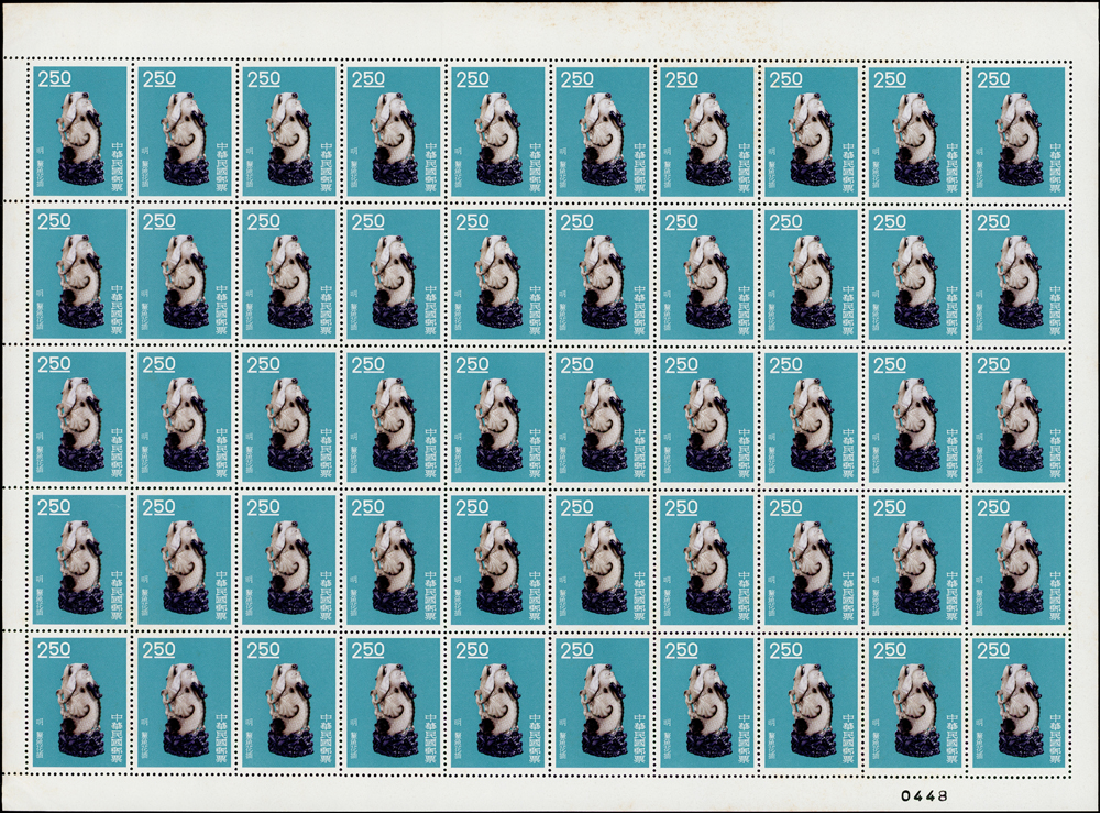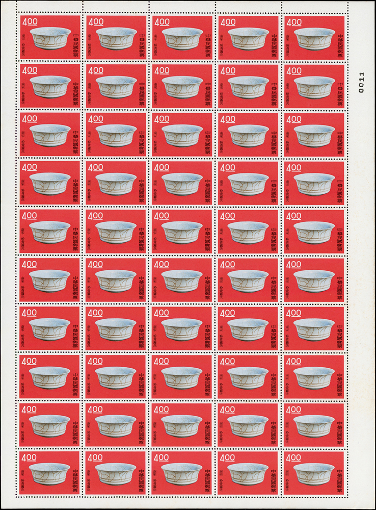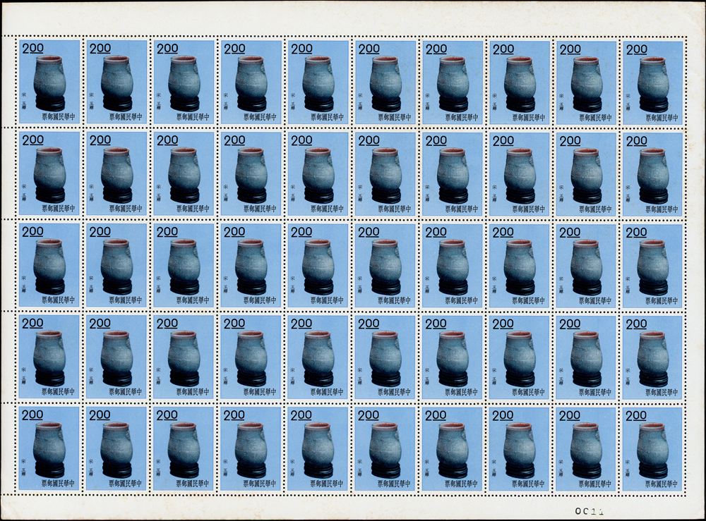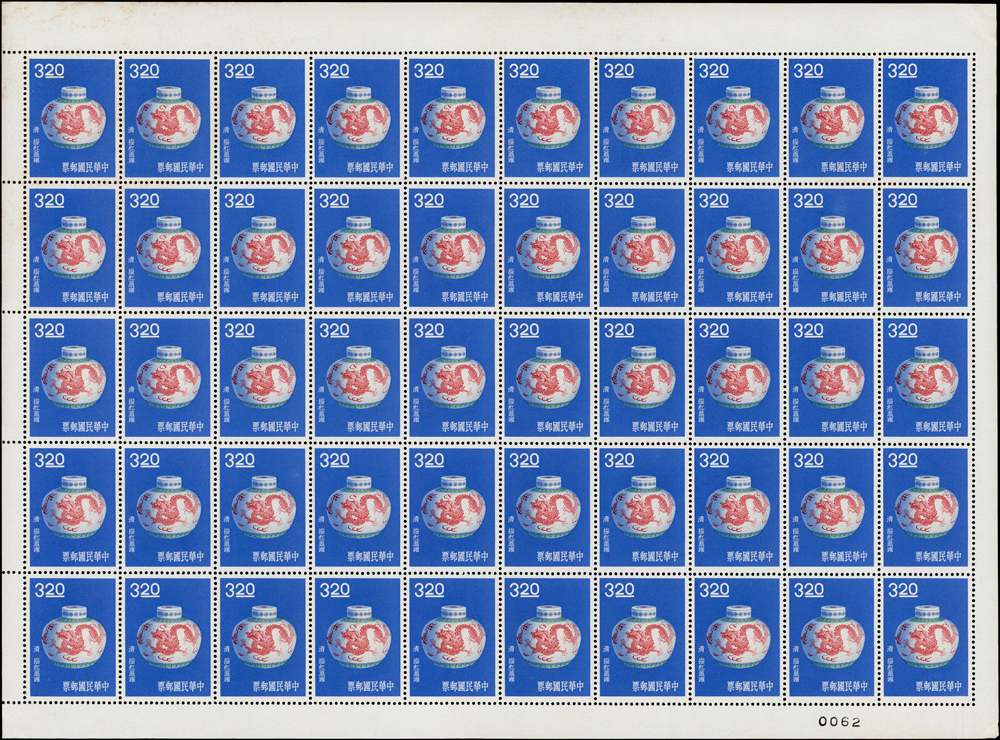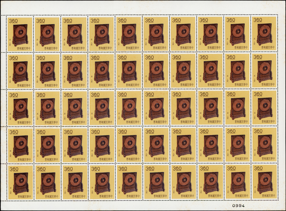 專19.故宮古物前十八寶新票18全一全張50套,原膠折版,其中西周毛公鼎正背面大面積黃斑,其餘均正背面局部淡斑點或齒緣淡黃,西周散盤右側二道壓痕,F-VF(Page 83)