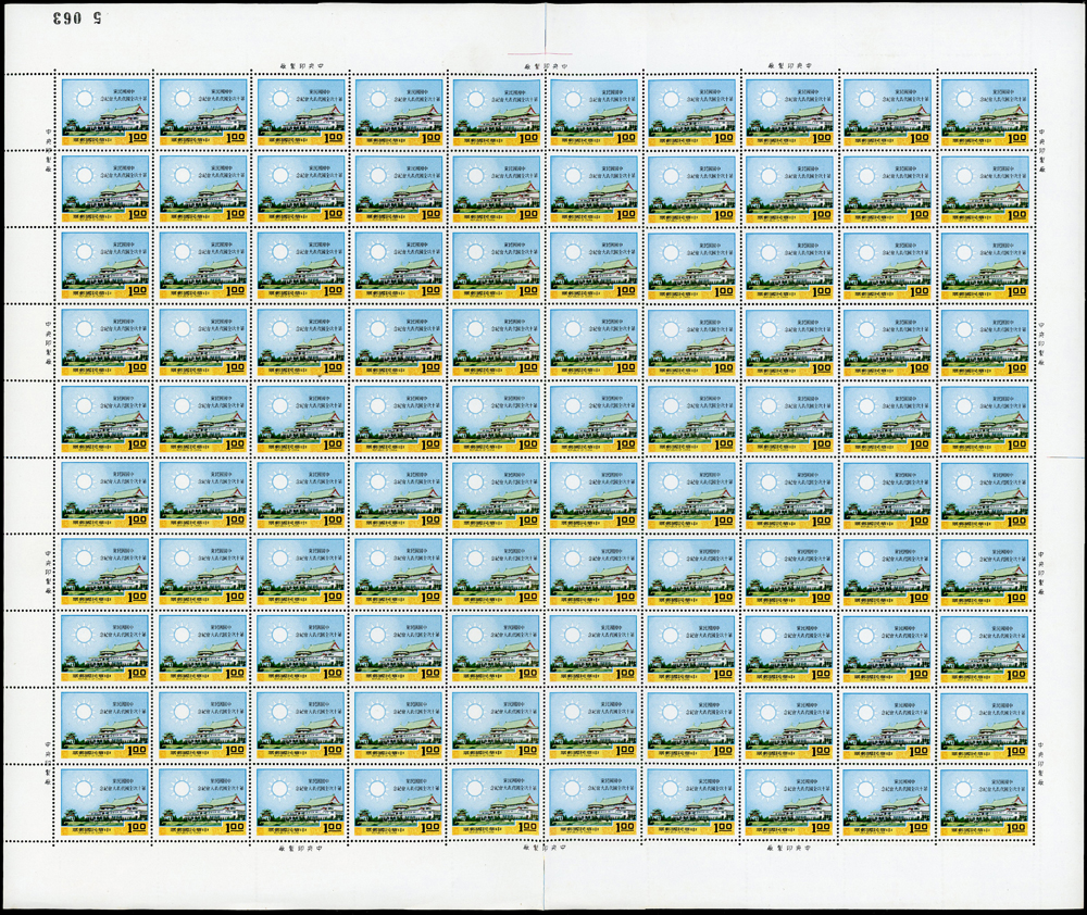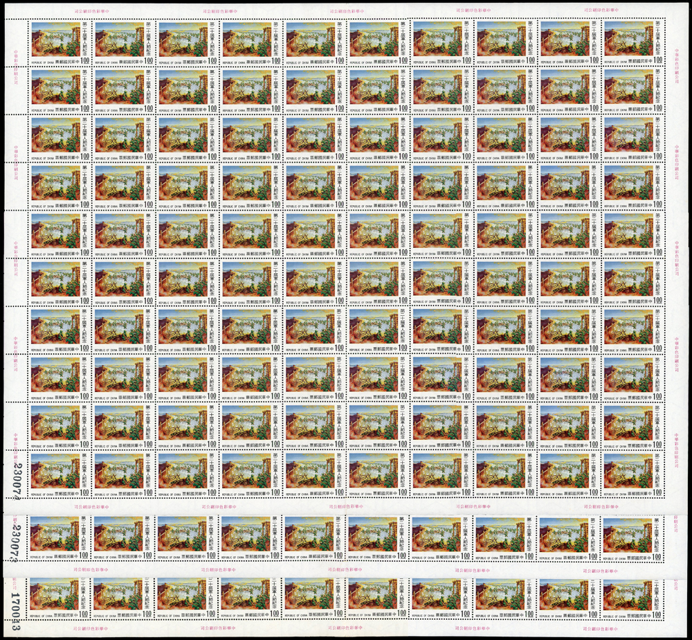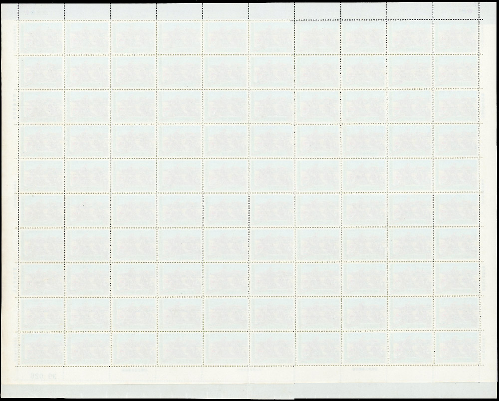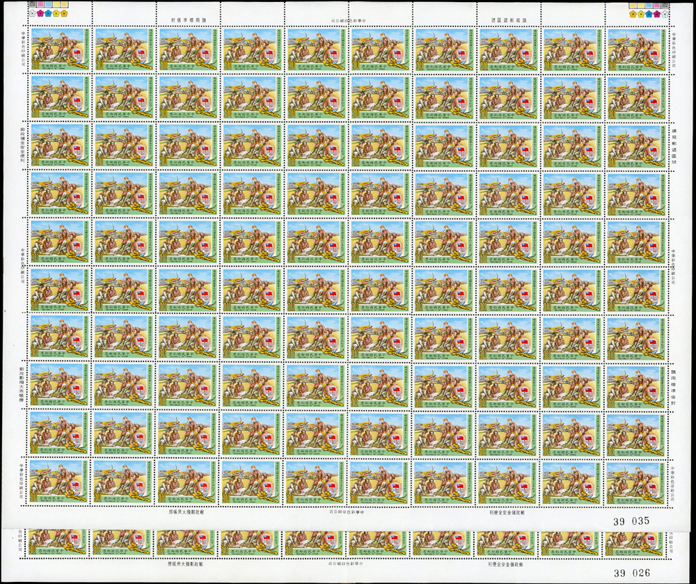 台灣中期新票版張6版,均原膠折版,包括:(1)紀126.中國國民黨第十次全國代表大會紀念1全1版100套,背面左上輕微污痕及墨痕,VF-F;(2)紀233.飛虎隊志願來華五十年1全2版,共200套,VF;(3)紀153.第二十屆軍人節紀念1全3版,共300套,其中1版背面局部霉斑或脫膠,另2版無黃斑,VF