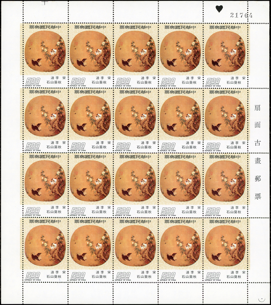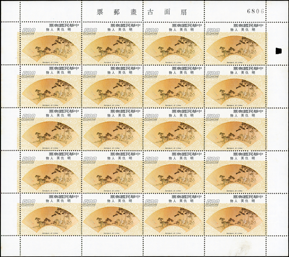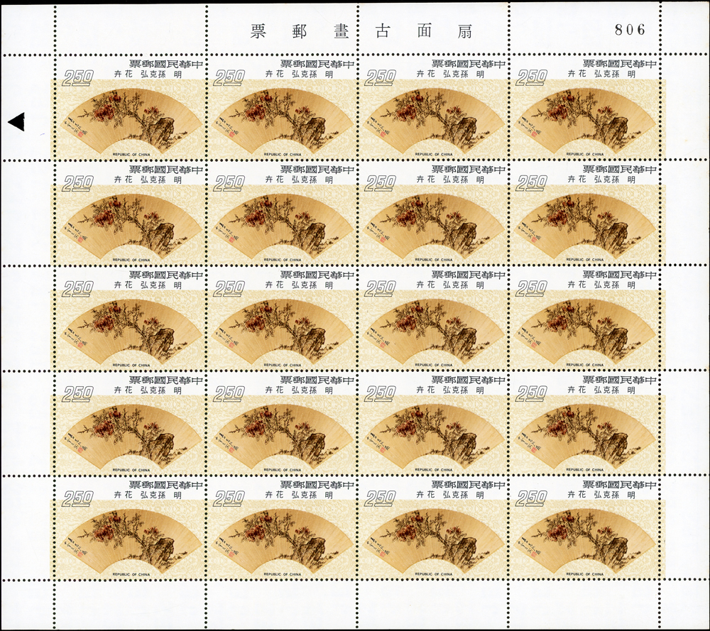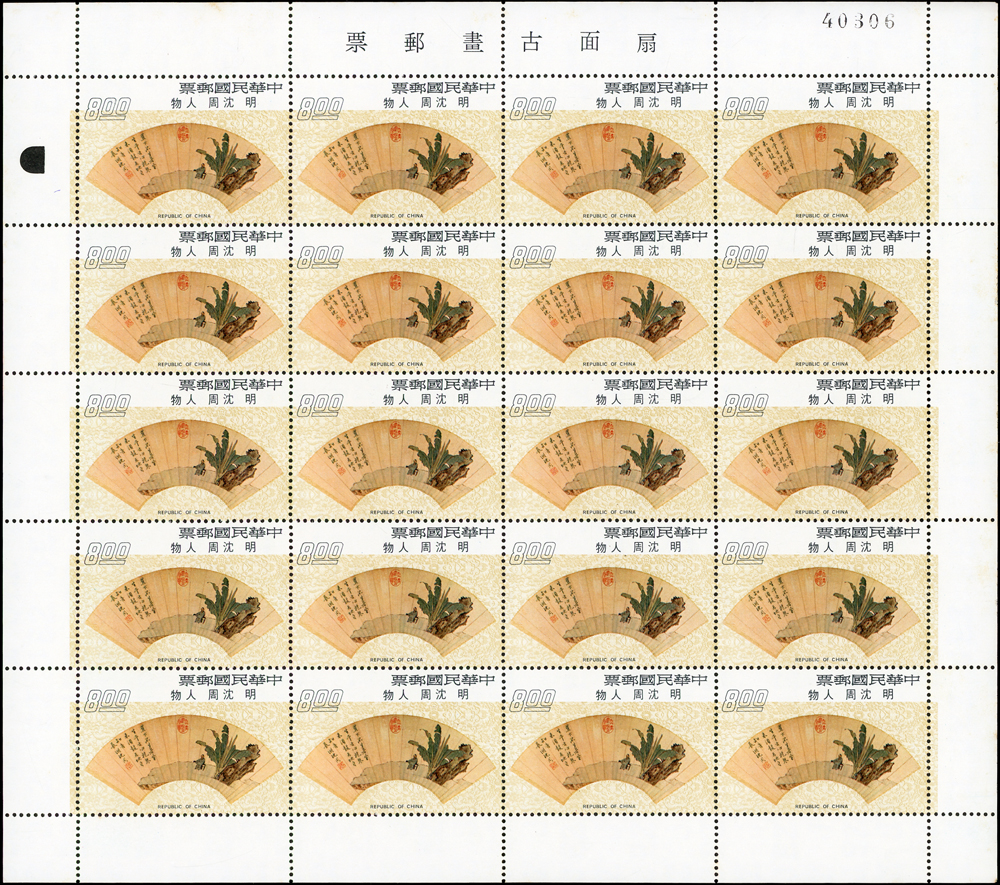 扇面古畫郵票二版,均原膠,包括:(1)專95.摺扇(62年版)4全1版20套,挺版,8元及1元背面各1個淡斑點,VF-F;(2)專104.紈扇(63年版)4全1版20套,折版,右上角多道壓痕損票1枚,正背面均有些許淡黃點或齒緣淡黃,F-VF(Page 89)