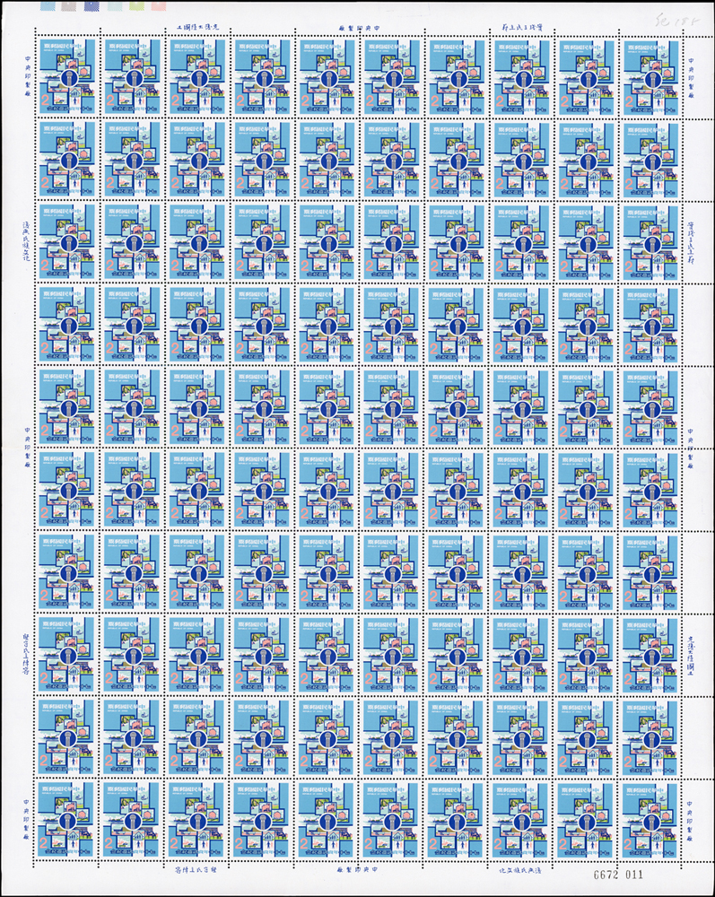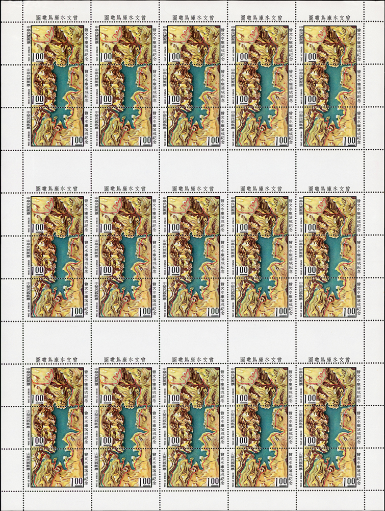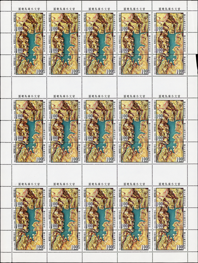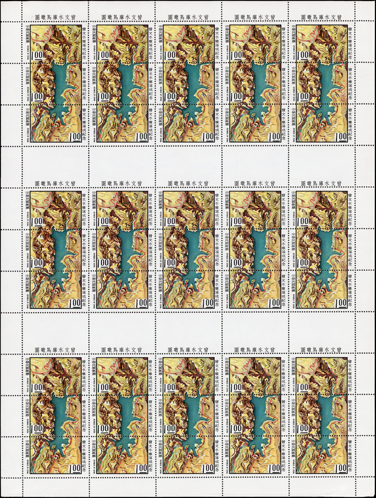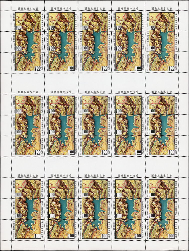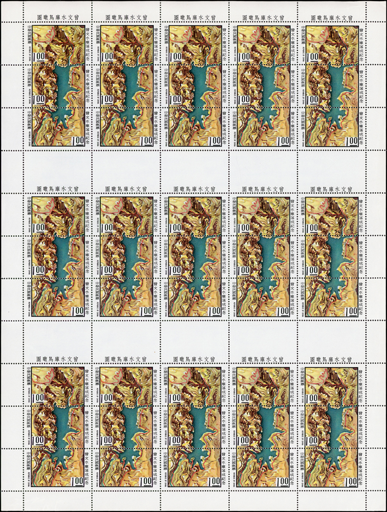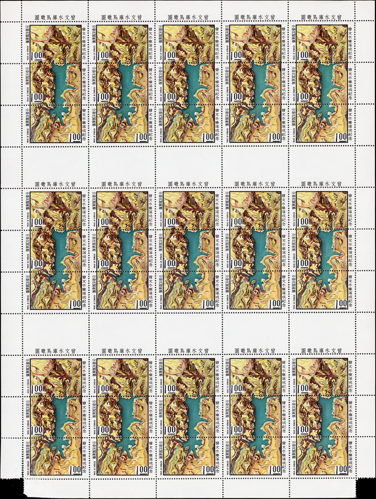 台灣中期郵票版張,均為新票,包括:(1)紀150.曾文水庫落成紀念1元連刷票7版,共105組,原膠無黃斑,每版四邊緣皺痕,其中1版邊紙小缺損,VF-F;(2)紀185.中華民國七十年資訊週紀念1全一全張100套,原膠折版,無黃斑,VF(Page 89)