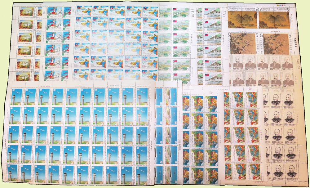 台灣中期新票:(1)專150.宋人嬰戲圖古畫4全一大全張10套,原膠,左側二套嚴重霉斑沾黏皺褶,F;(2)專166.明仇英山水畫古畫4全一大全張10套,原膠,左側二套嚴重霉斑皺褶,F;(3)專174.中國童話-牛郎織女4全左半版50方連,原膠霉斑,F-VF;(4)紀172.桃園國際機場落成紀念2全50方連帶三邊紙,原膠霉斑,F;(5)紀171.中沙大橋落成紀念2全右半版50方連,原膠霉斑,F;(6)專96.丘逢甲1全下半版50方連,原膠,VF;(7)專93.林則徐1全下半版50方連,原膠壓痕,VF-F;(8)紀153.第二十屆軍人節紀念1全左半邊40方連,原膠淡斑點,VF-F