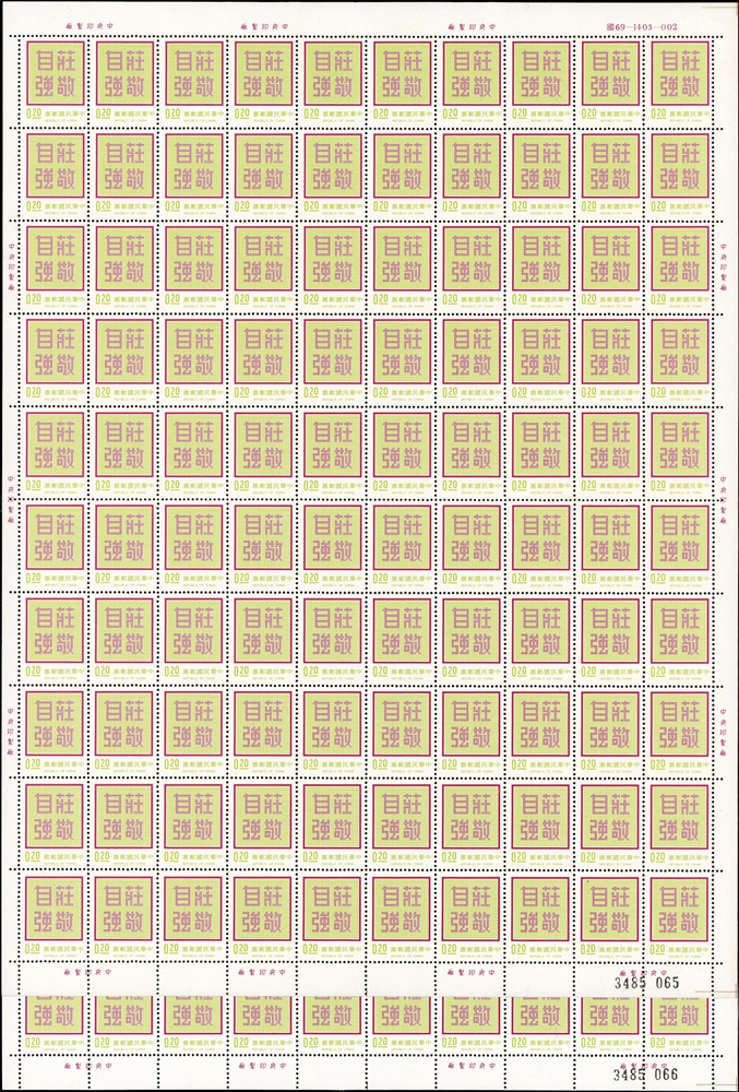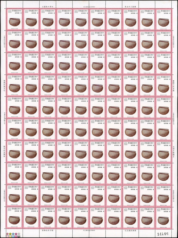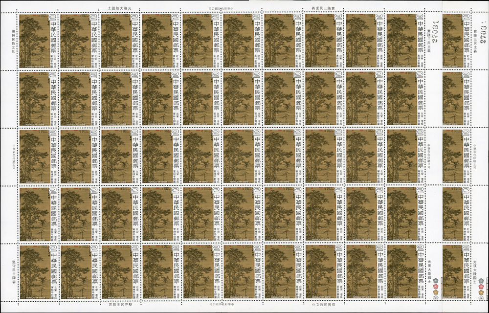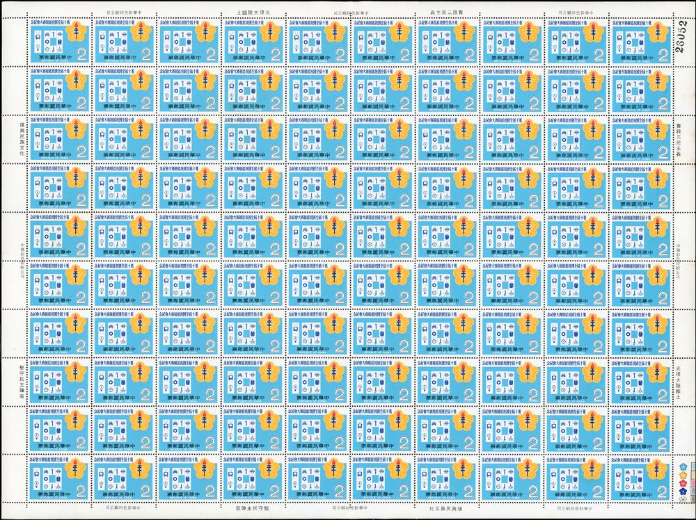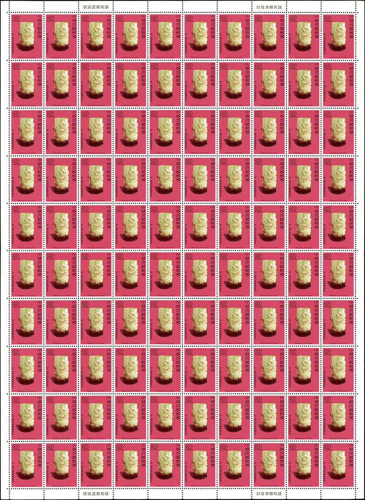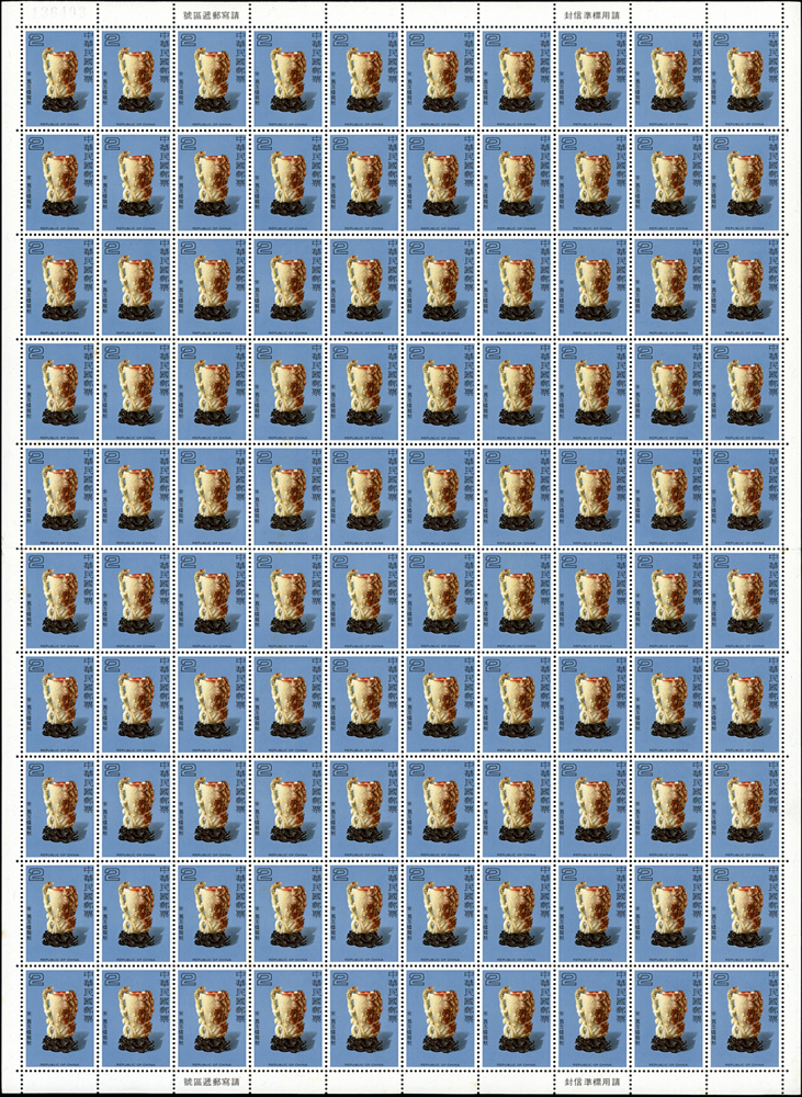 台灣不成套新票版張:(1)百枚版張16版,含:古代玉器(68.69年版)2元.古代陶器2元.臺灣風景(69年版)2元.節約能源2元.第十屆國民儲蓄日2元.六十九年臺閩地區戶口及住宅普查2元.唐三彩2元.航空(69年版)5元.國際扶輪社七十五週年2元.第十屆全國技能競賽大會2元.國際兒童年2元.郵政儲金創辦六十週年紀念2元.環境保護2元.莊敬自強2角2版;(2)50枚版張4版,含:松竹圖古畫及蔣公逝世五週年紀念2元各2版;品像混合,少數背淡斑點,多數保存佳,VF-F;歡迎至官網瀏覽全貌