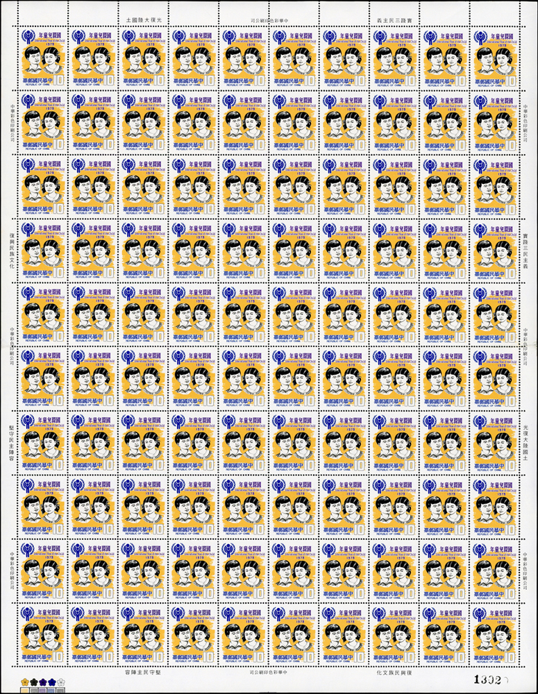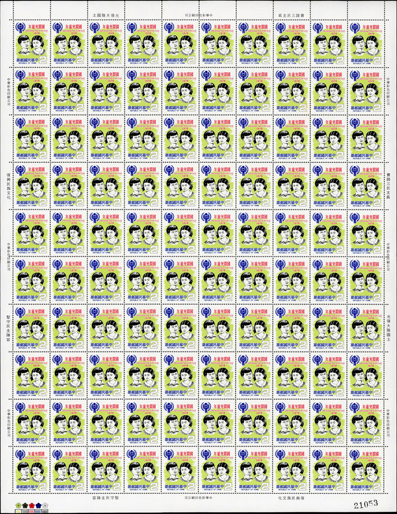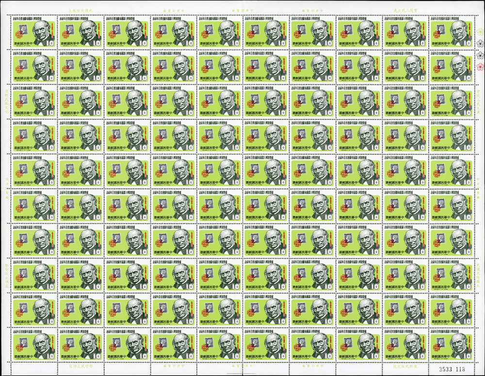 台灣中期新票版張二版:(1)專156.國際兒童年2全1版100套,10元原廠機器壓痕,VF;(2)紀174.郵票發明人羅蘭希爾逝世百年紀念1全1版100套,背面少許白斑,VF-F