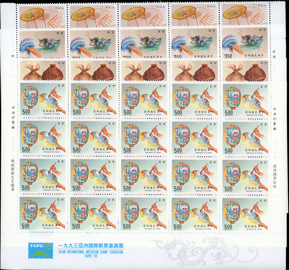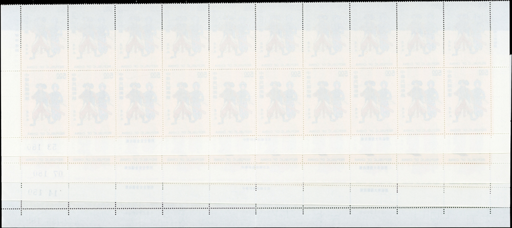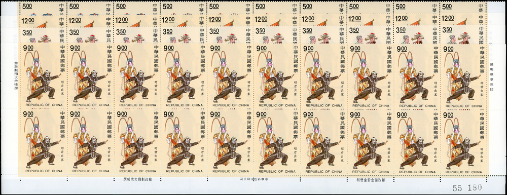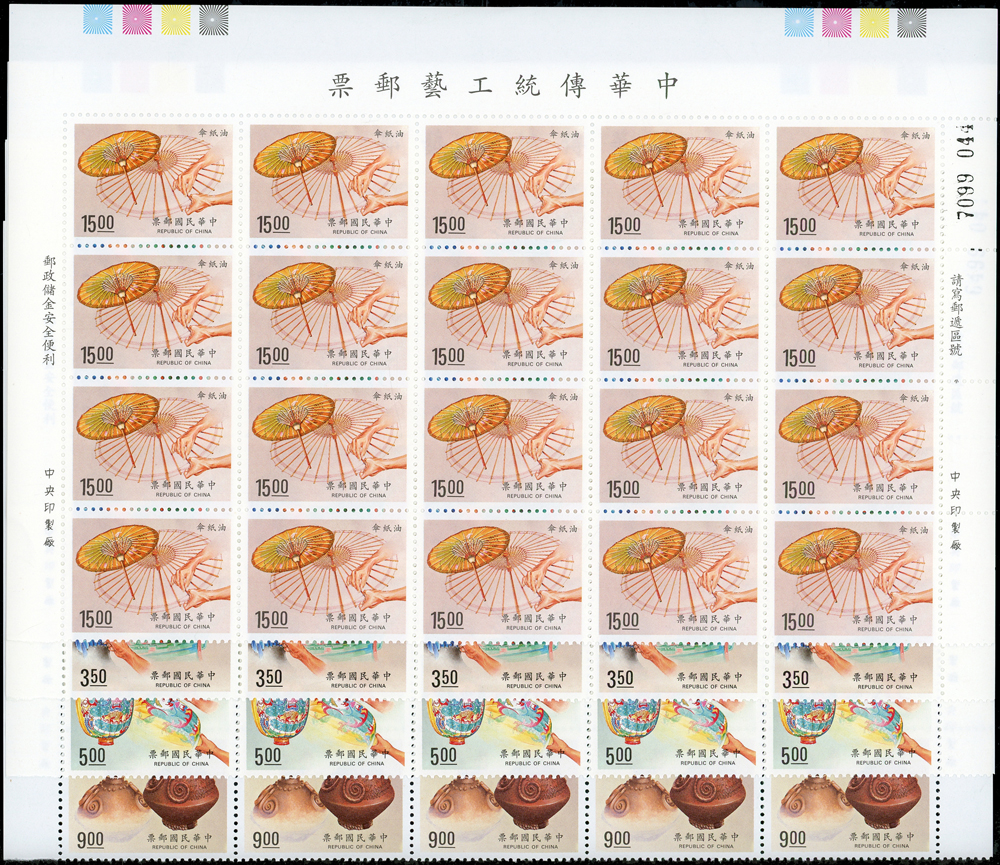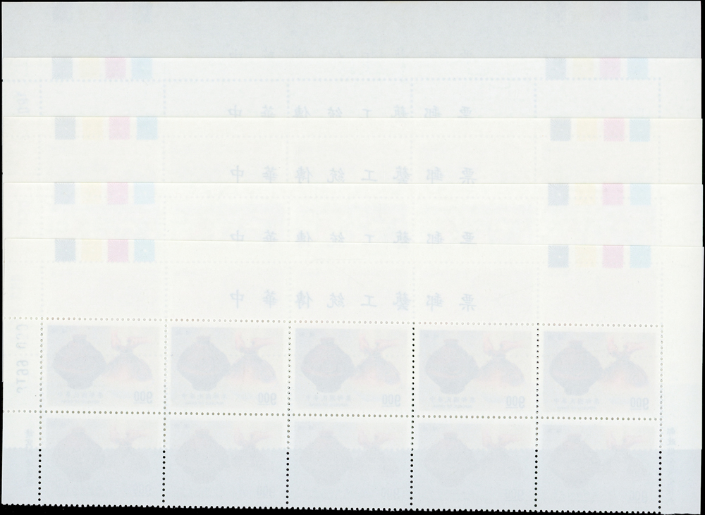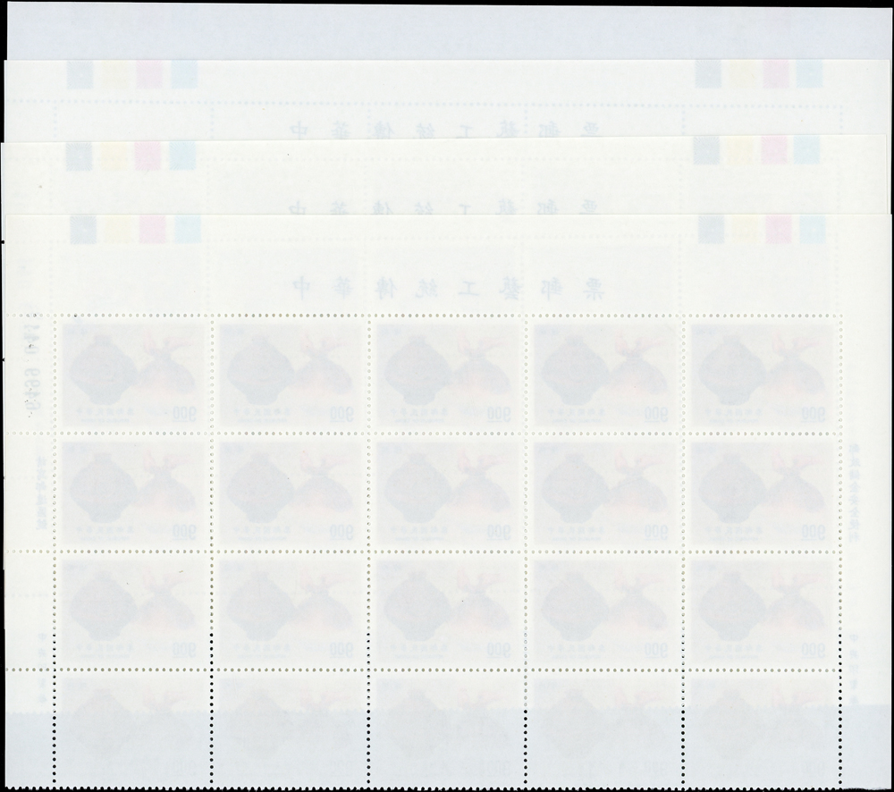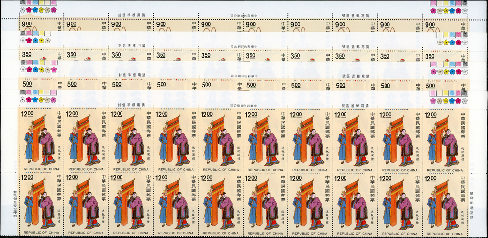 台灣近期新票一組,多數成套,大部分為大方連,總面值共計NT$6910元,包括有:中國戲劇(81年版).湯若望誕生四百週年.故宮明成化瓷.創世神話.中華傳統工藝等,多數保存佳,VF-F