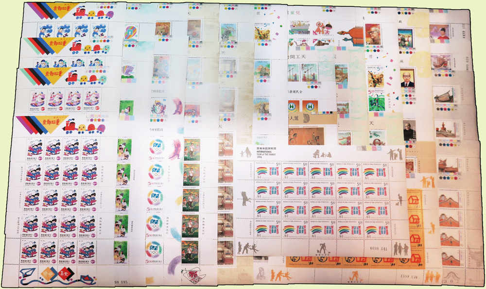 台灣近期新票版張,包括:兒童畫(85年版).天工開物-灌溉.造紙.全民健康保險開辦.體育(82年版).中國石獅.鄉土生活(83年版).國際家庭年.國際奧林匹克委員會成立百週年.保護智慧財產權等等,總面值共計NT$9630元,VF-F