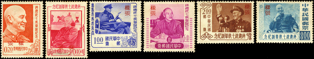 趣味品及樣張一組:(1)專4.蔣總統像影寫版4角4方連帶右下角雙邊紙,第50號票位『民』字修飾;(2)專4.蔣總統像影寫版4角6方連帶右上角雙邊紙,第20號票位『中』字旁多一點;背均勻微黃,VF-F;(3)樣票:紀50.蔣總統七秩華誕紀念6全,加蓋紅色『樣張』,無膠背黃;F-VF(Page 103)