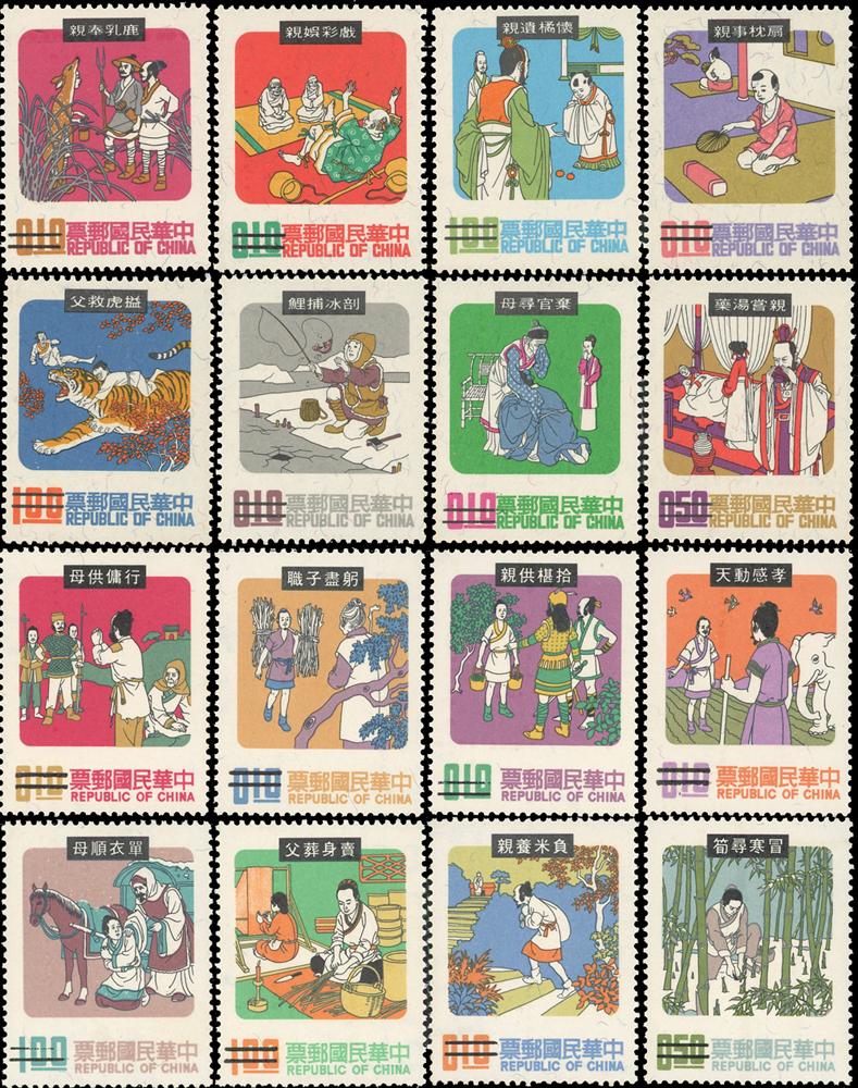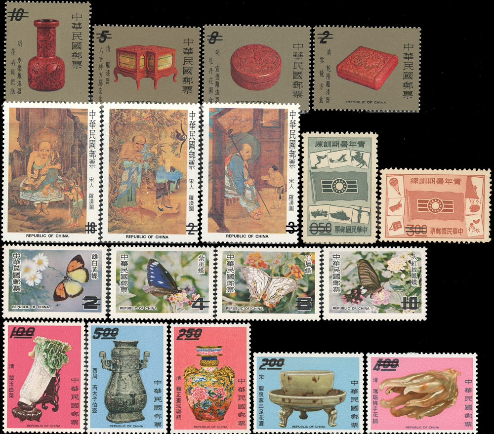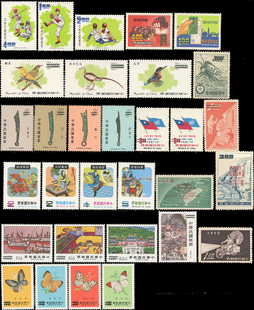 台灣中早期樣票20套,包括:青年暑期訓練.限時專送.美國艾森豪總統蒞華訪問紀念.錄音郵件.郵購服務.故宮古物(57年版,背貼).羅漢圖.中國民間故事(59.60.67年版).臺灣蝴蝶(66.67年版).古代雕漆器(67年版).兒童畫(66年版).古代錢幣(67年版).臺灣鳥類(66年版).國民儲蓄.體育(60年版)各1套,聯合國25週年紀念2套,多數背黃或淡黃,F-VF(Page 104)