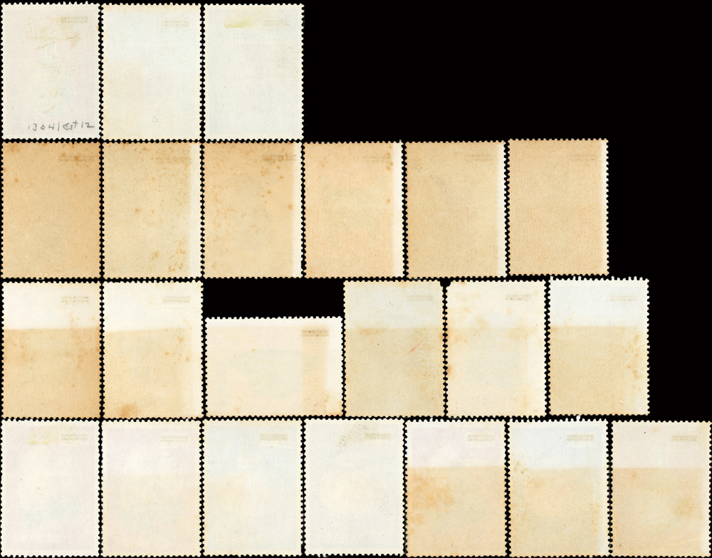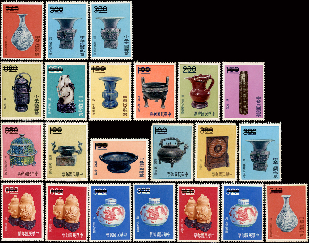 樣票22枚:專19.故宮古物前十八寶15枚,缺宋玉觶2元.南宋粉青圓洗4元.漢辟邪4.5元成套,其中漢玉壁3.6元及戰國鳳首盉1元左右各1個角尖缺角,原膠背黃;另多商饕餮紋方尊3元.清龍鳳尊8角.清描紅蓋罐3.2元各2枚.明 釉裹紅玉壺春2.4元1枚,部分背貼;F-VF(Page 104)