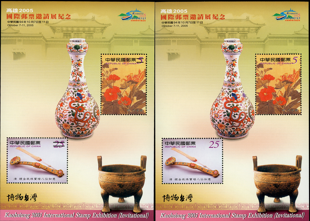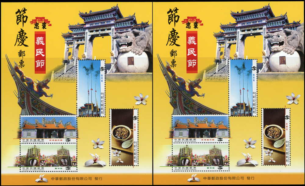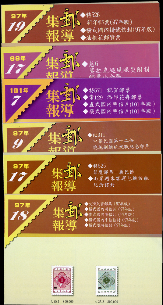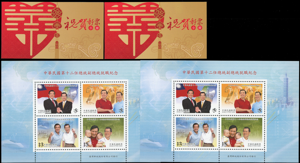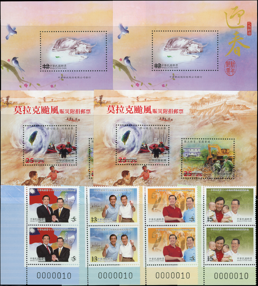 民國94年,97年,98年及101年樣票雙連一組,含(1)94年:紀304.高雄2005年國際郵展小全張2枚;(2)97年:紀311.第12任總統就職4全直雙連及小全張2枚,特525.義民節小全張2枚,欠25.欠資郵票(97年版)5全橫雙連,特526.新年生肖牛2全橫雙連及小全張2枚;(3)98年:慈6.莫拉克颱風賑災附捐小全張2全,常129-1.花卉郵票第一輯4全橫雙連,常129-2.花卉郵票第二輯1元及10元橫雙連,常129-3.花卉郵票第三輯7元,20元及34元橫雙連各一件,15元單枚;(4)101年特571.祝賀郵票小冊2本,VF(Page 104)