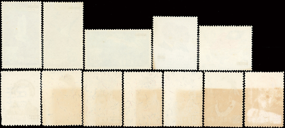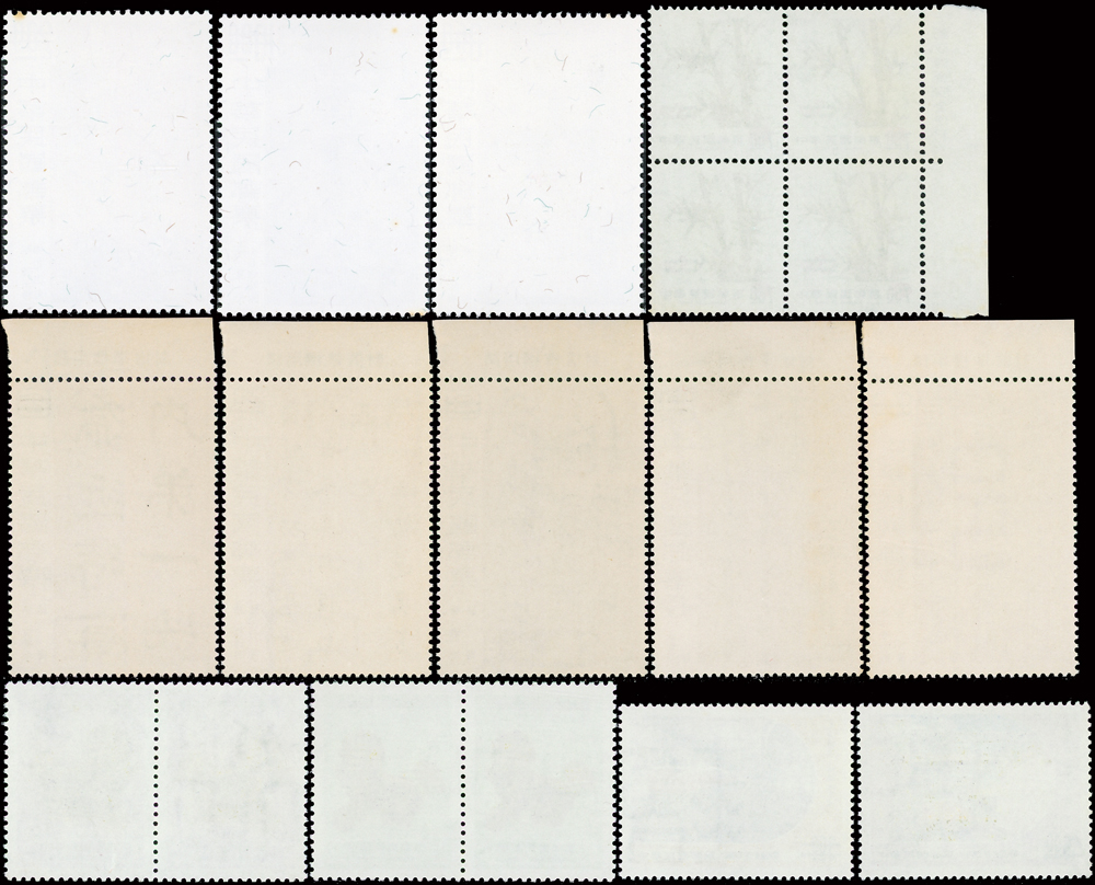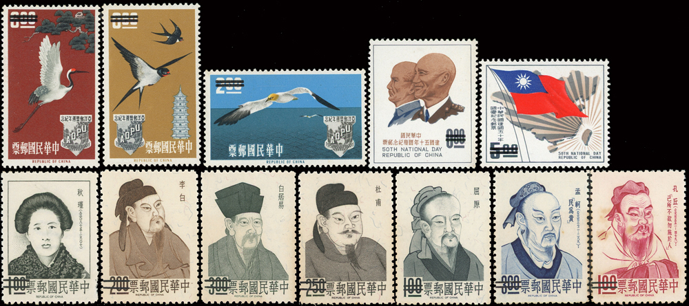 樣票:台灣中近期套票15套,包括:中華民國建國五十年國慶紀念,書法藝術,宋人十八學士圖古畫,歲寒三友圖古畫,秋瑾,孔子、孟子,中國詩人,亞洋郵盟週年,交通建設-鐵路地下化各1套,無面值郵票2套,松竹梅改值4方連,多數背面淡黃或齒緣淡黃,VF-F(Page 105)