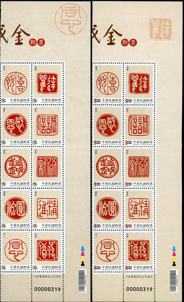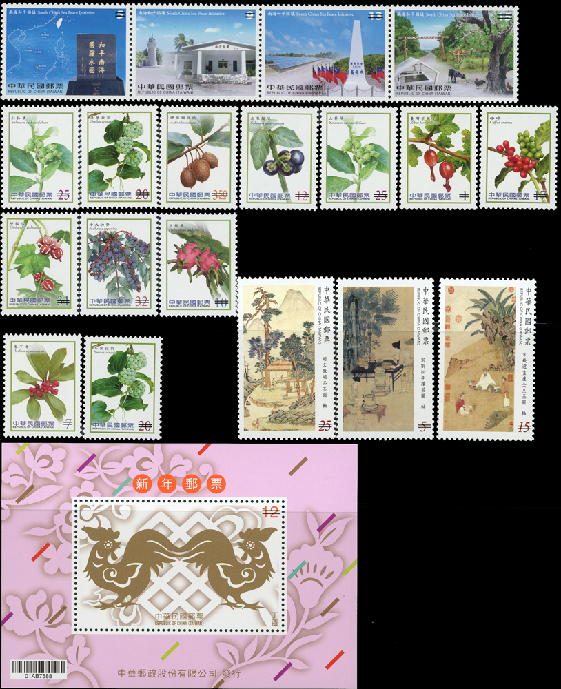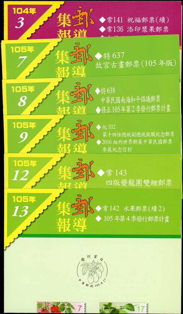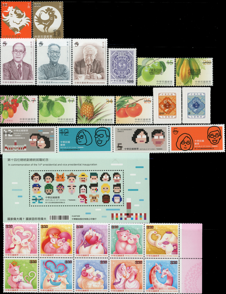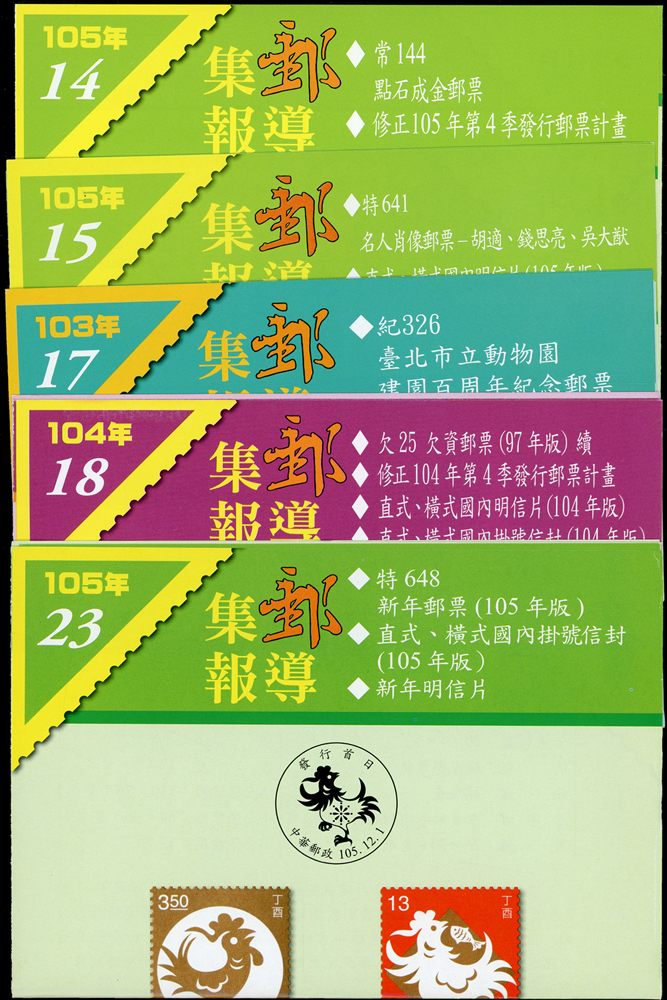 民國103年,104年及105年樣票一組,含:(1)103年:常136.醬果郵票添印12枚;(2)104年:常141.祝福郵票(續)10全,欠25.欠資郵票(97年版)續2全;(3)105年:常142.水果郵票(續)2.5元及15元各一枚,常143.四版夔龍圖100元1全,特637.故宮古畫郵票(105年版)3全,特638.中華民國南海和平倡議4全,紀332.第14任總統就職4全及小全張1枚,常142.水果郵票(續2)4全,常144.點石成金20全,特641.名人肖像-胡適,錢思亮,吳大猷3全,特648.新年生肖雞2全及小全張1枚,VF(Page 105)