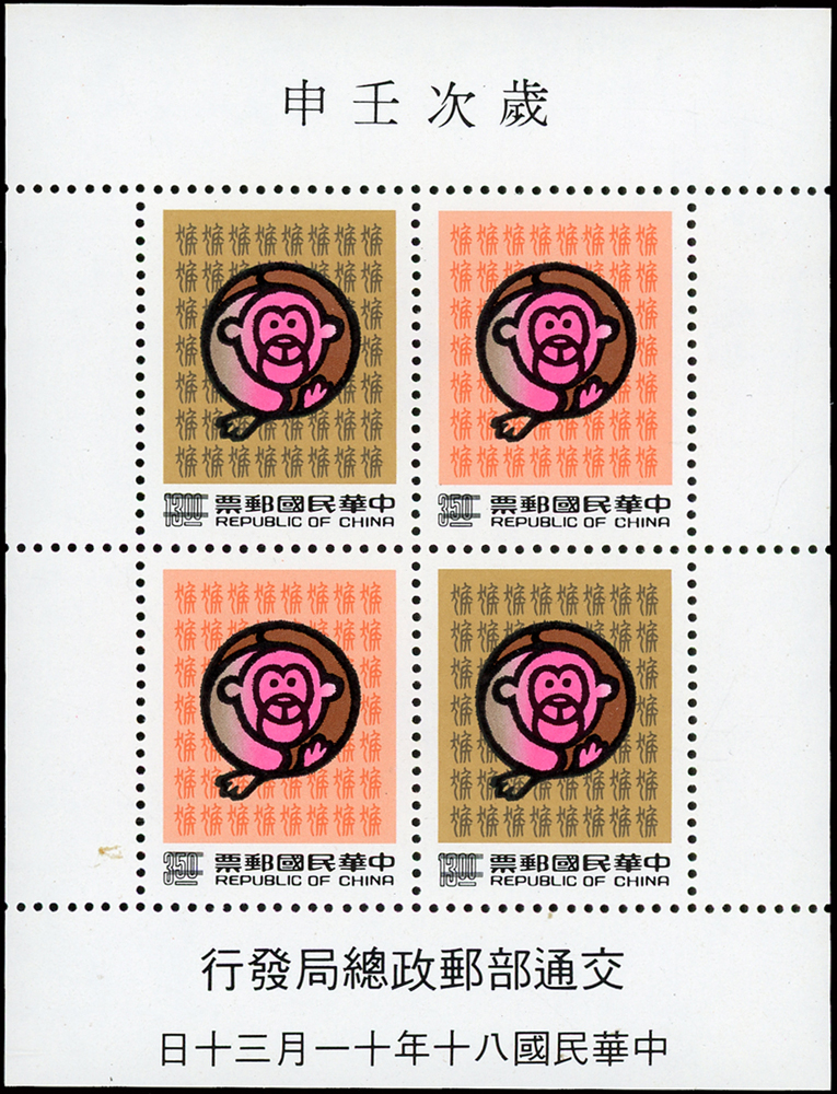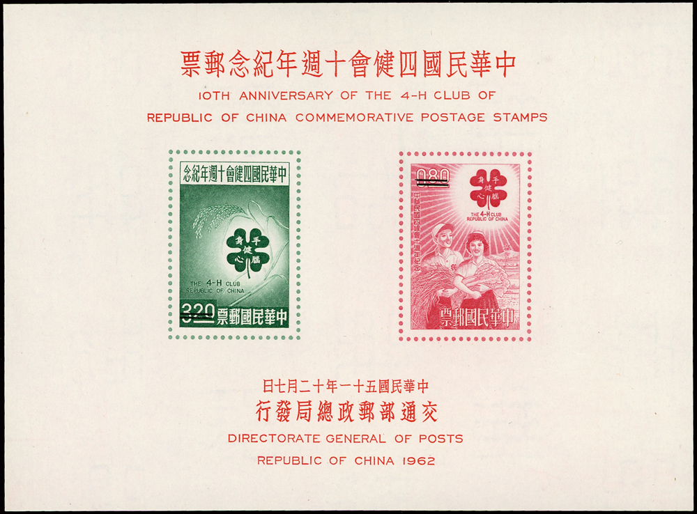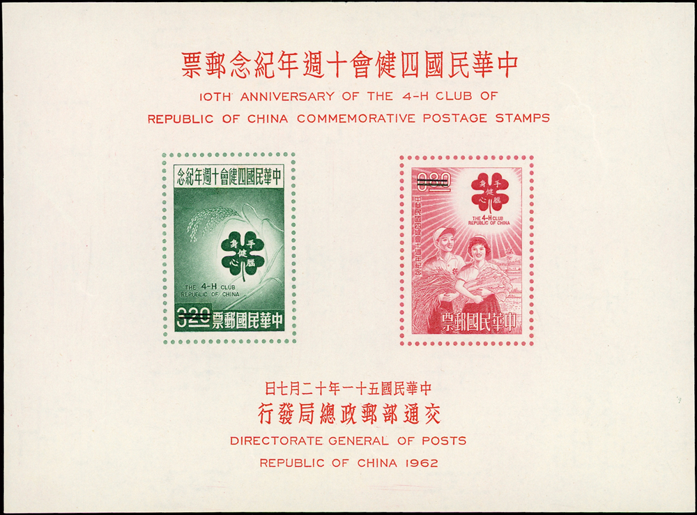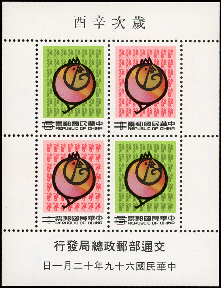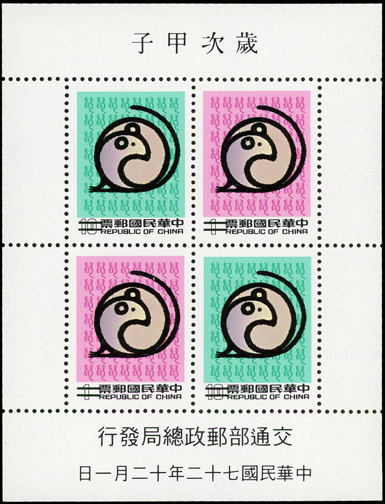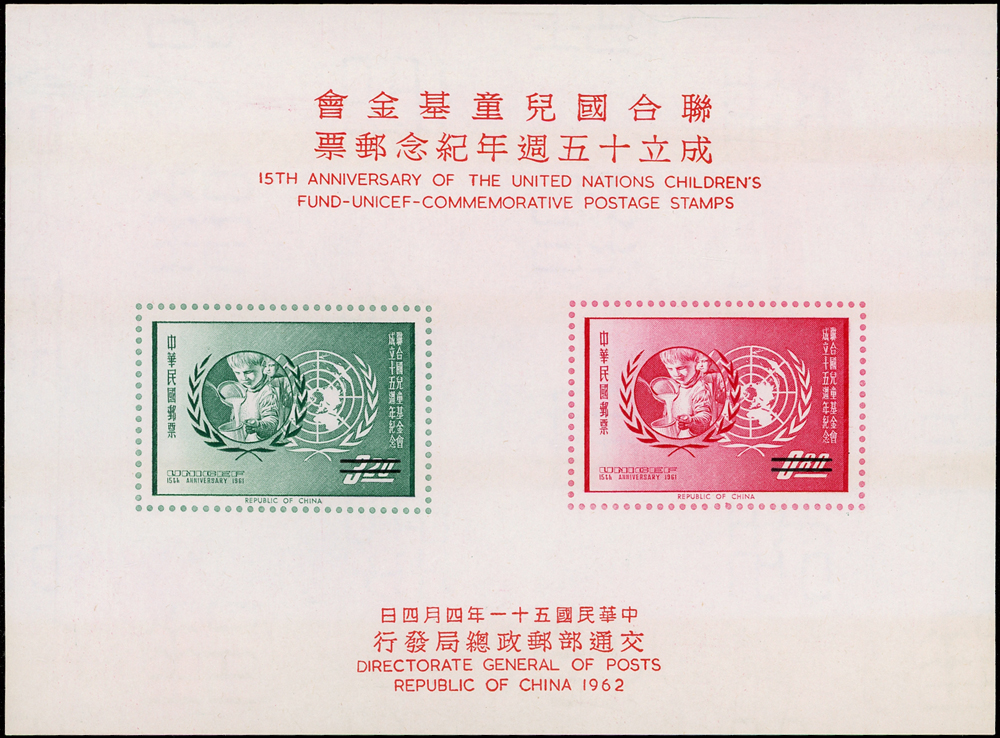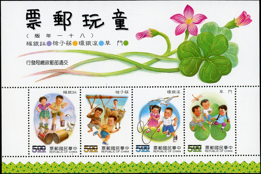 樣票:台灣小全張13枚,包括:中華民國四健會十週年2枚,聯合國兒童基金會成立15週年1枚(背局部黃),宋人羅漢圖古畫1枚,郵政九十週年1枚,郵政博物館新廈落成1枚,童玩(二)1枚,二輪雞.鼠.兔.龍.羊.猴各1枚,除註明外,其餘VF
