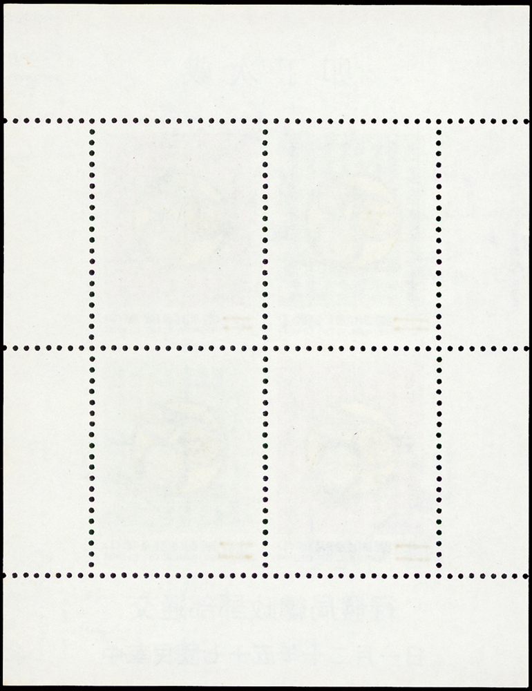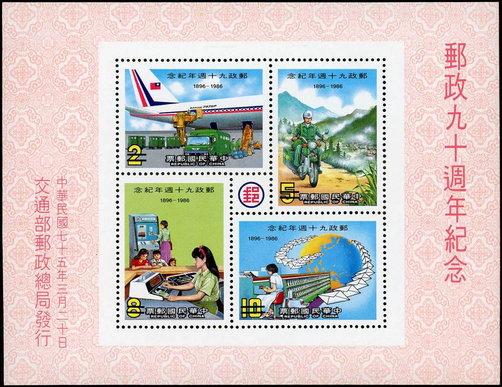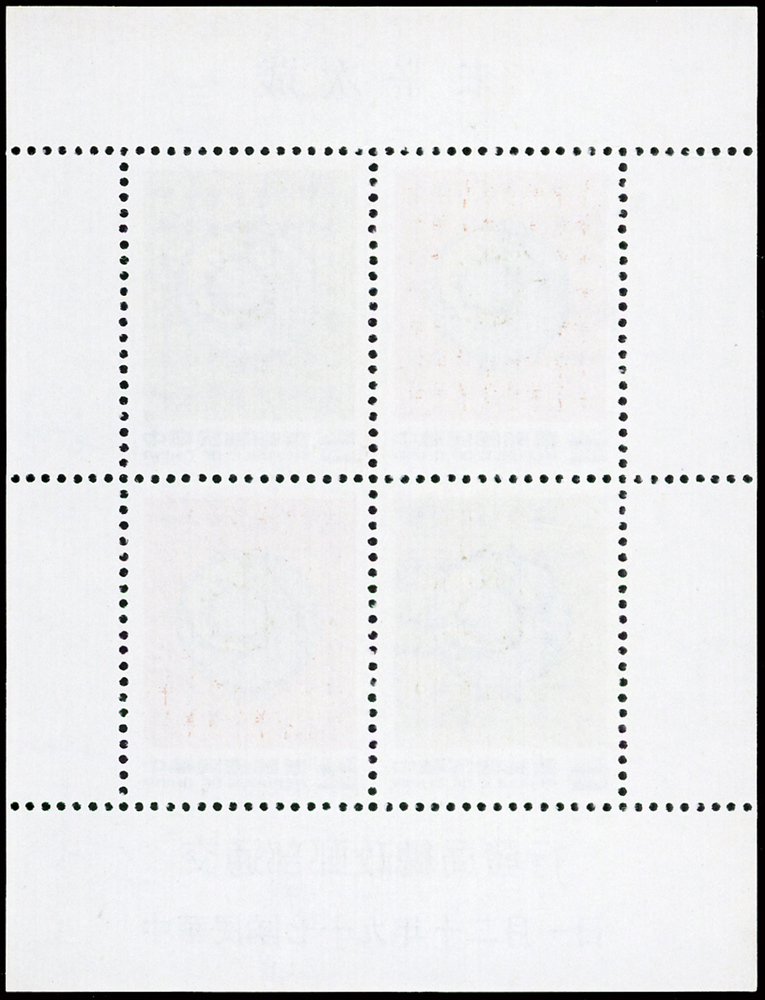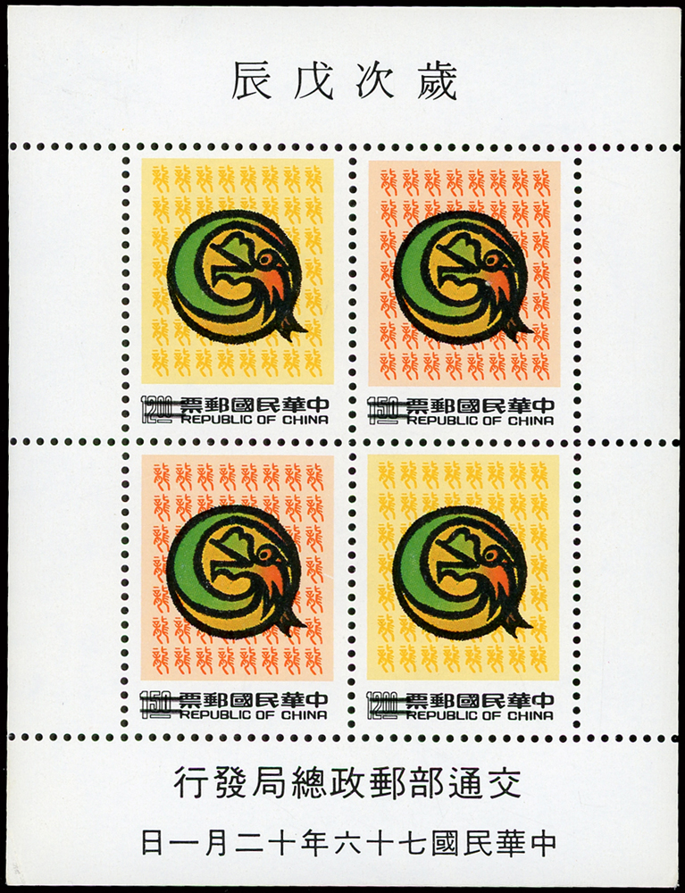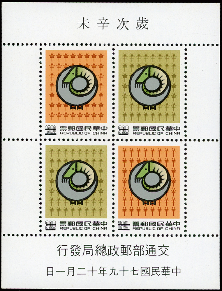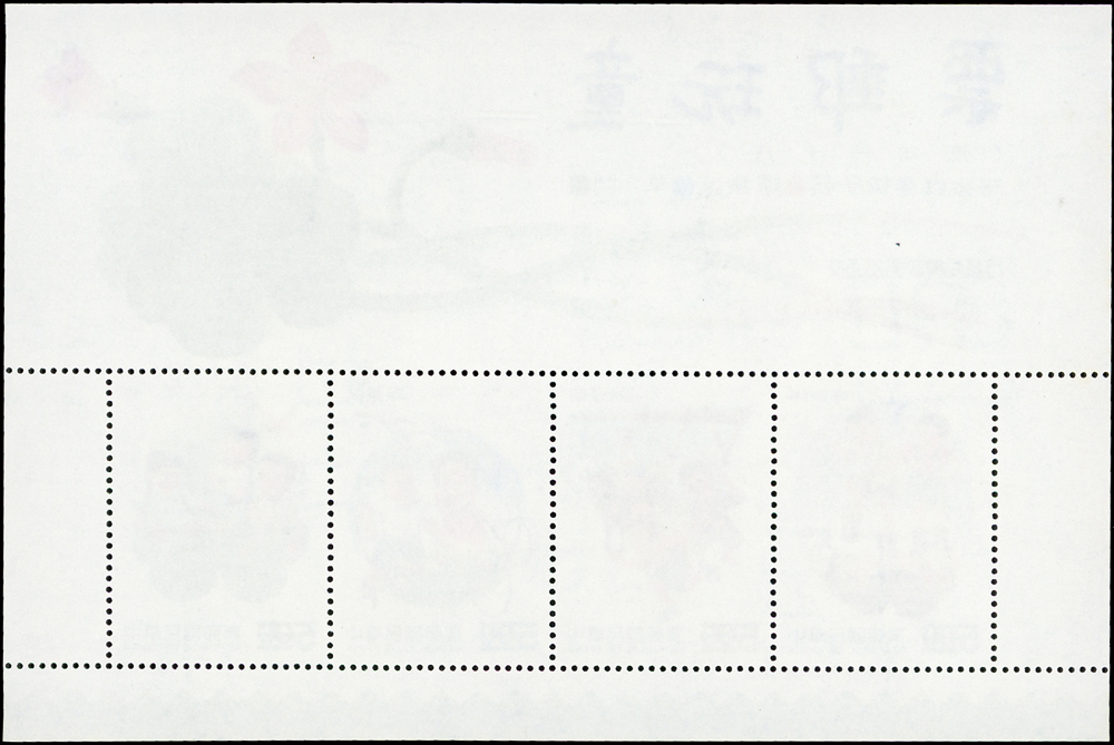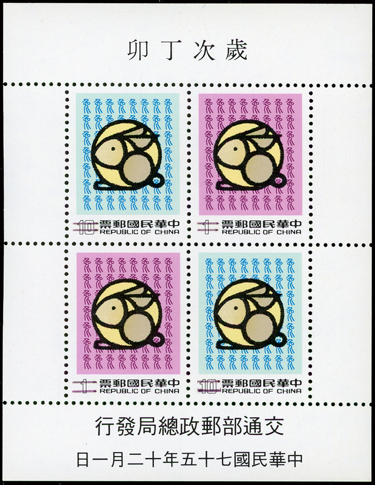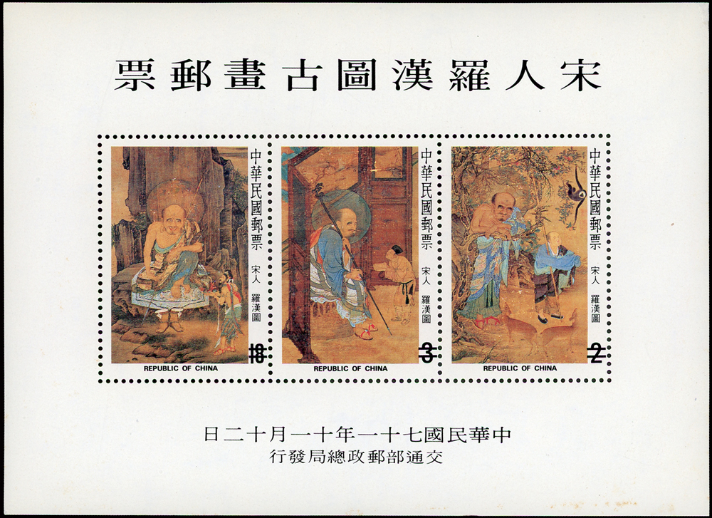 樣票:台灣小全張13枚,包括:中華民國四健會十週年2枚,聯合國兒童基金會成立15週年1枚(背局部黃),宋人羅漢圖古畫1枚,郵政九十週年1枚,郵政博物館新廈落成1枚,童玩(二)1枚,二輪雞.鼠.兔.龍.羊.猴各1枚,除註明外,其餘VF