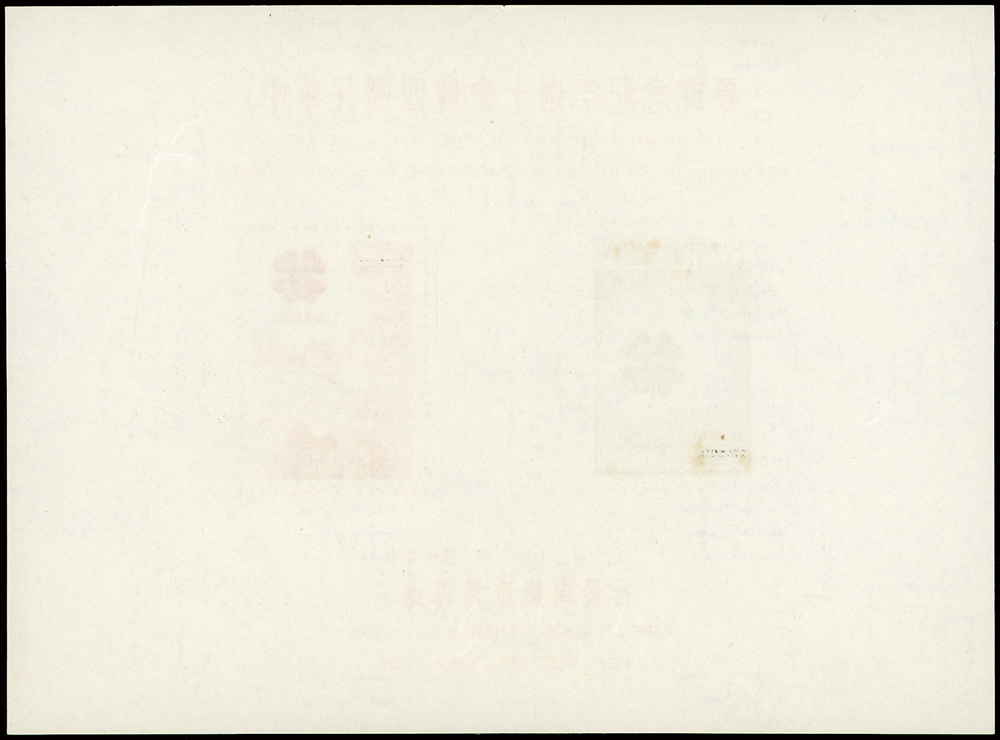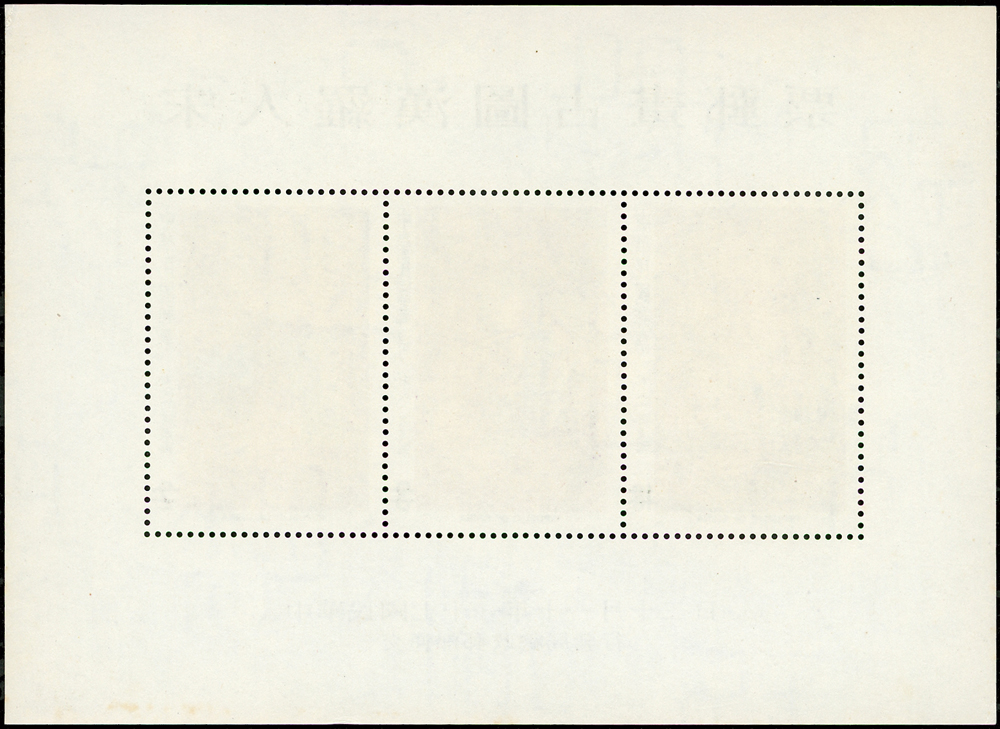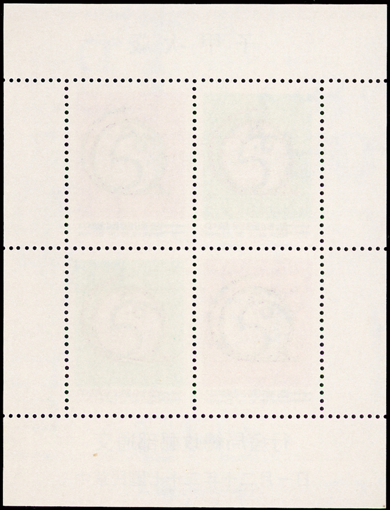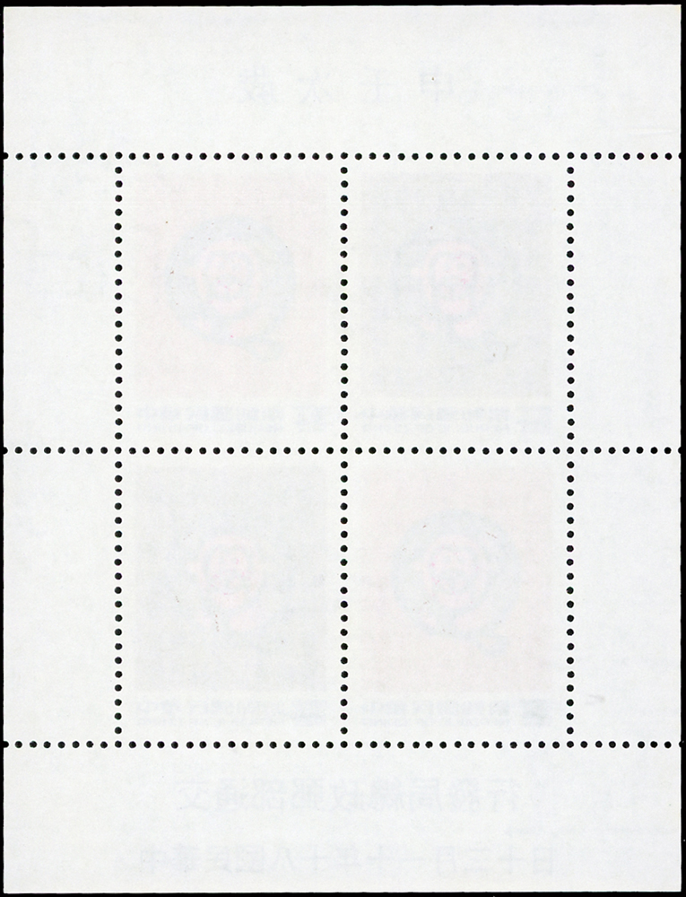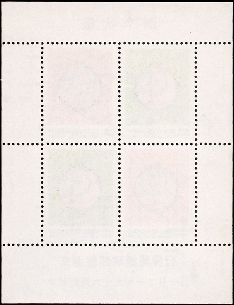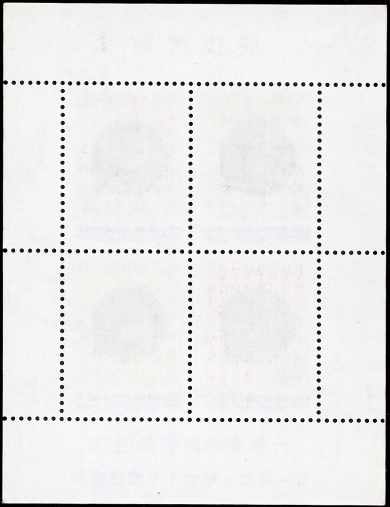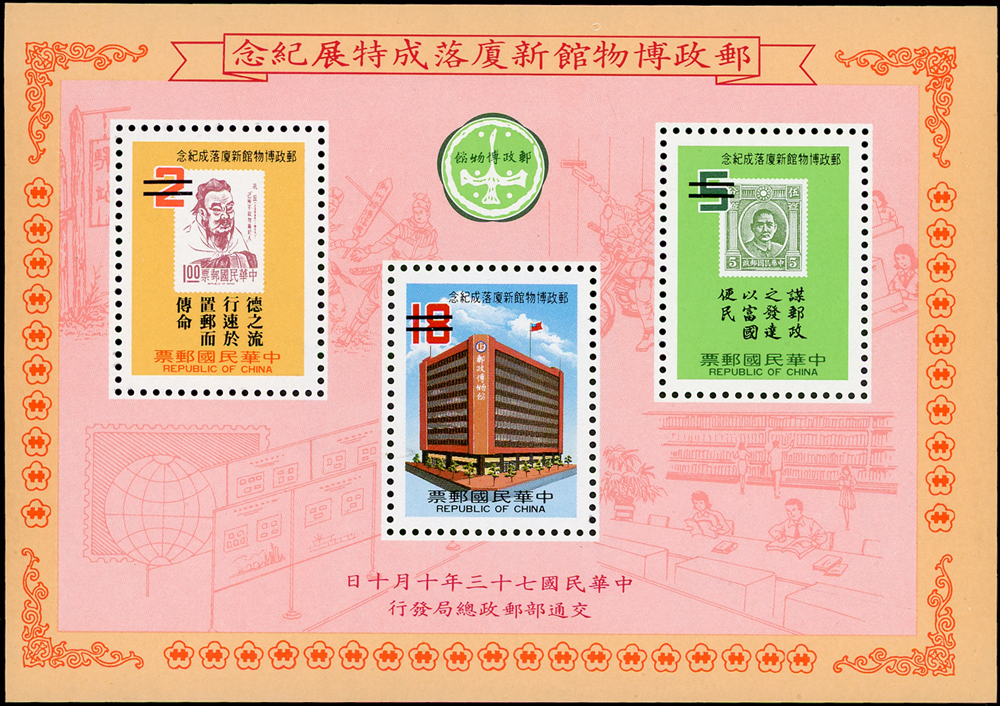 樣票:台灣小全張13枚,包括:中華民國四健會十週年2枚,聯合國兒童基金會成立15週年1枚(背局部黃),宋人羅漢圖古畫1枚,郵政九十週年1枚,郵政博物館新廈落成1枚,童玩(二)1枚,二輪雞.鼠.兔.龍.羊.猴各1枚,除註明外,其餘VF