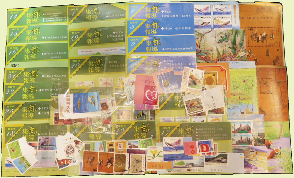 樣票:郵票23套,小全張9枚,不重複,含:民國64年國父紀念館1套,民國73年郵政博物館新廈落成1套,民國87年元世祖出獵圖及其小全張各1套,鍾馗1套,其餘均為民國95及96年票,原膠無黃斑,少數軟印痕,VF-F;附集郵報導(Page 107)