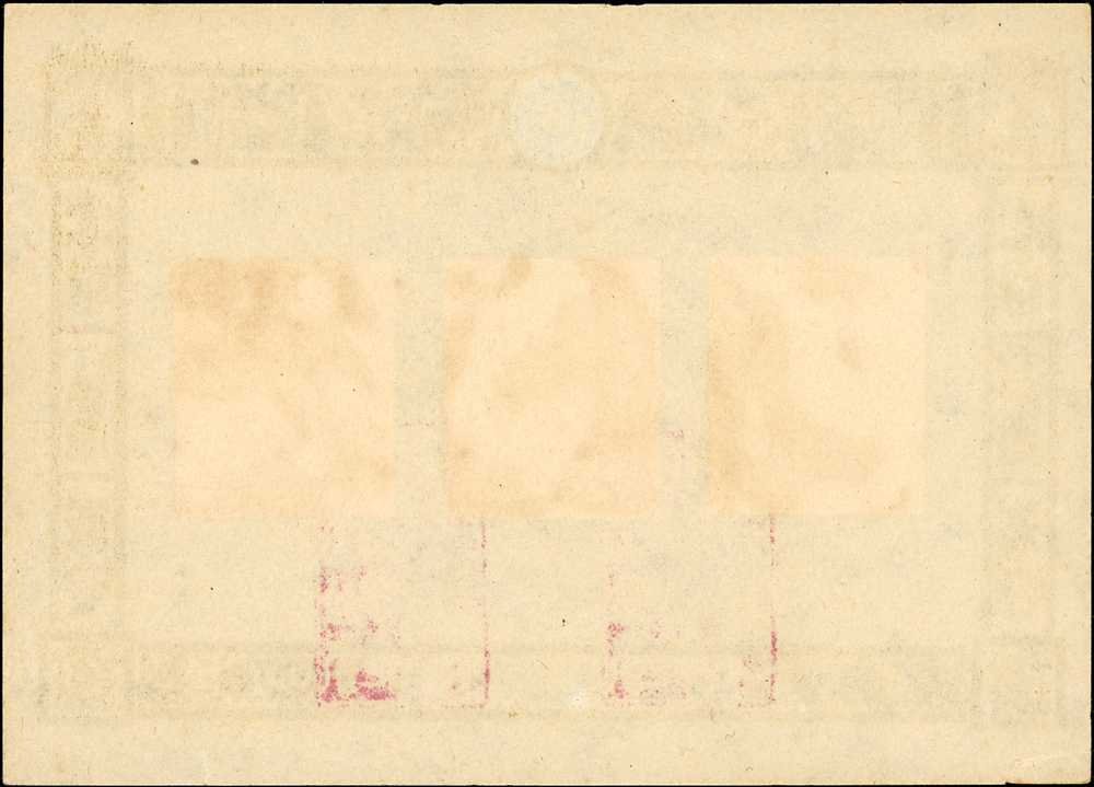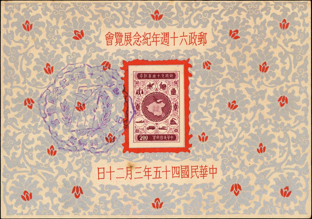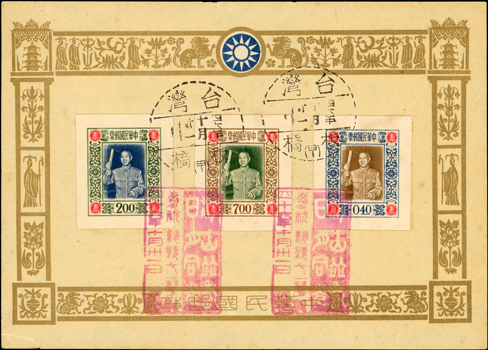 郵品二件:(1)紀47A.郵政60週年展覽會金.銀小全張各1枚,銷郵政60年紀念展覽45.3.20台北臨局戳,數點輕黃,VF-F;(2)局版貼票紙,貼總統像影寫版小全張剪下3全大寬邊,銷板橋46.10.31首日戳,旁另銷總統七一華誕紀戳(Page 109)