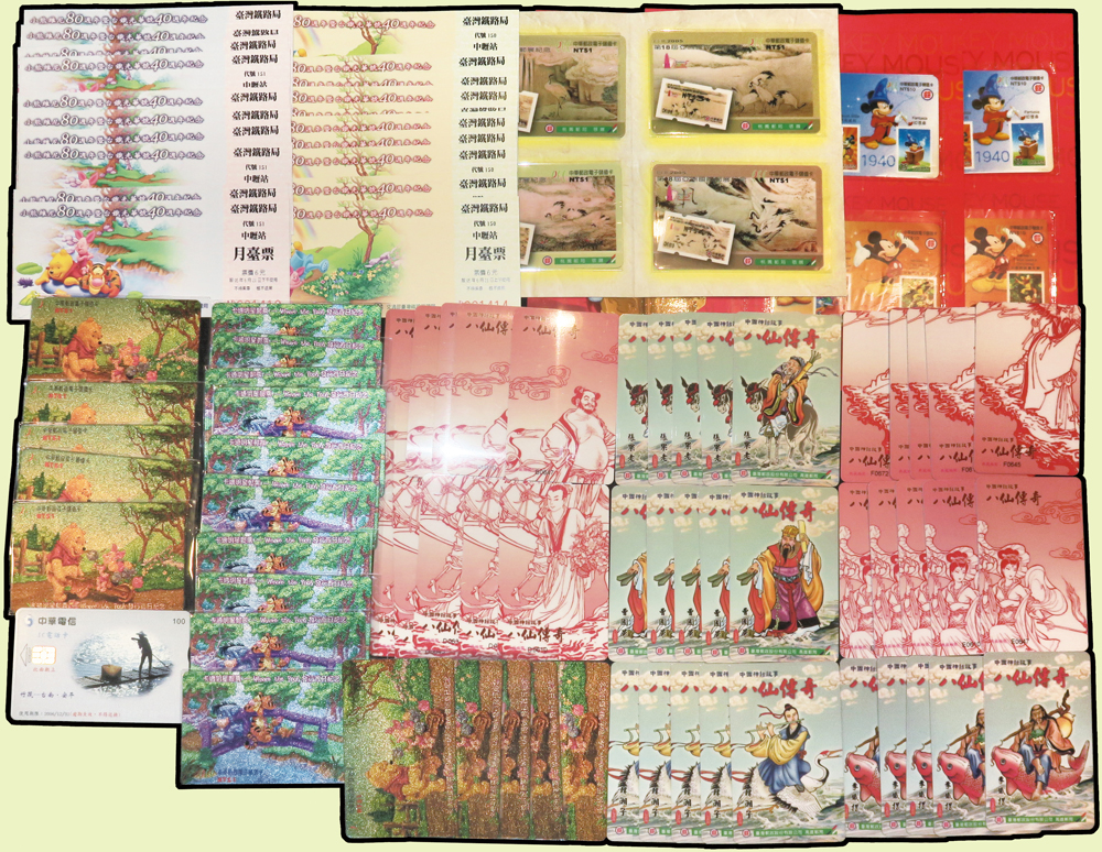 各式卡/票券:(1)高雄郵局贈-八仙過海典藏卡8卡全5組;(2)桃園郵局贈-胎仙圖電子儲值卡4卡全,每卡面值NT$1元;(3)台北郵局贈-米老鼠電子儲值卡2卡全2組,每卡面值NT$10元;(4)中華電信台南安平圖100元IC電話卡1枚;(5)中壢郵局贈-小熊維尼電子儲值卡2卡全及台鐵月台票2張全各10組,每張儲值卡面值NT$1元;以上均全新未使用;林茂興舊藏