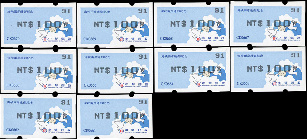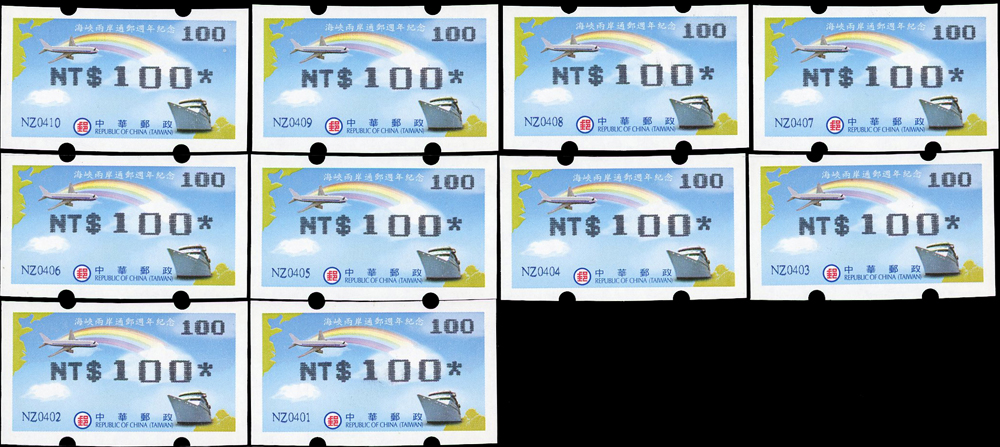 郵資票:(1)資紀9.海峽兩岸通郵紀念連號10枚,機號91#,面值均為NT$100元;(2)資紀11.海峽兩岸通郵週年紀念連號10枚,機號100#,面值均為NT$100元;以上總面值共計NT$2000元,VF