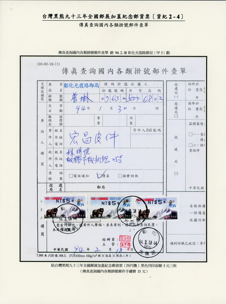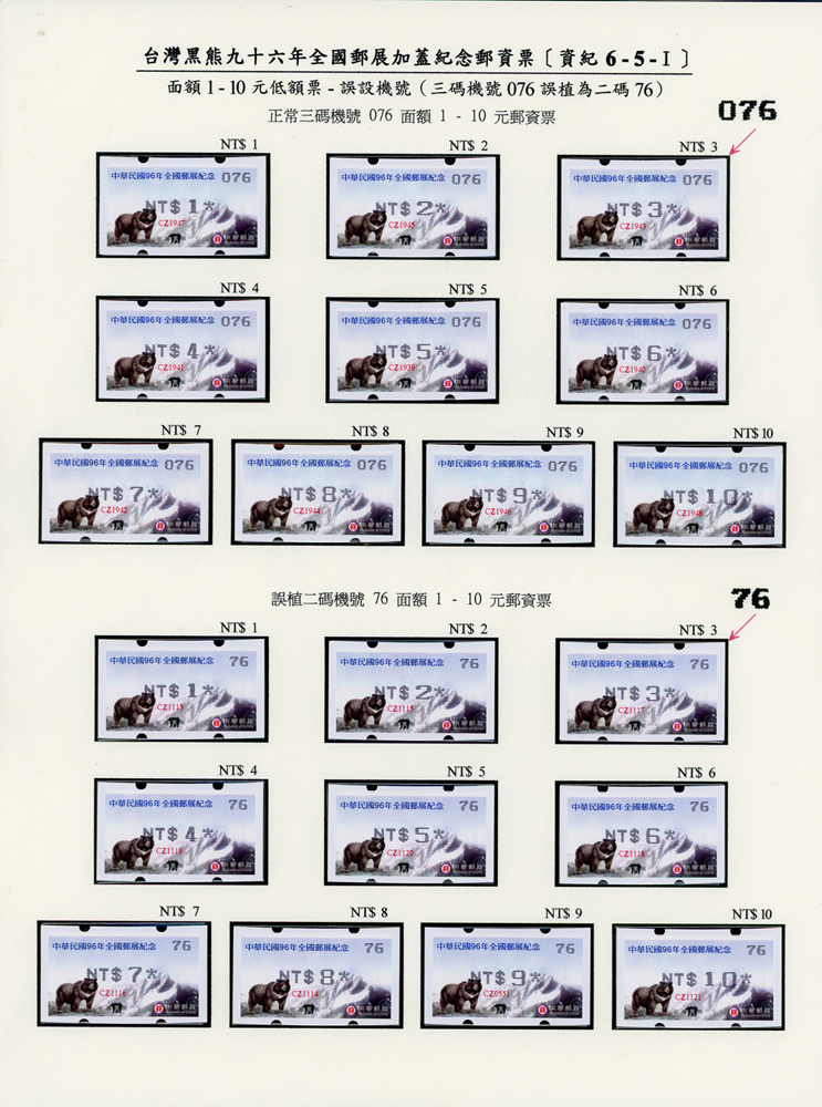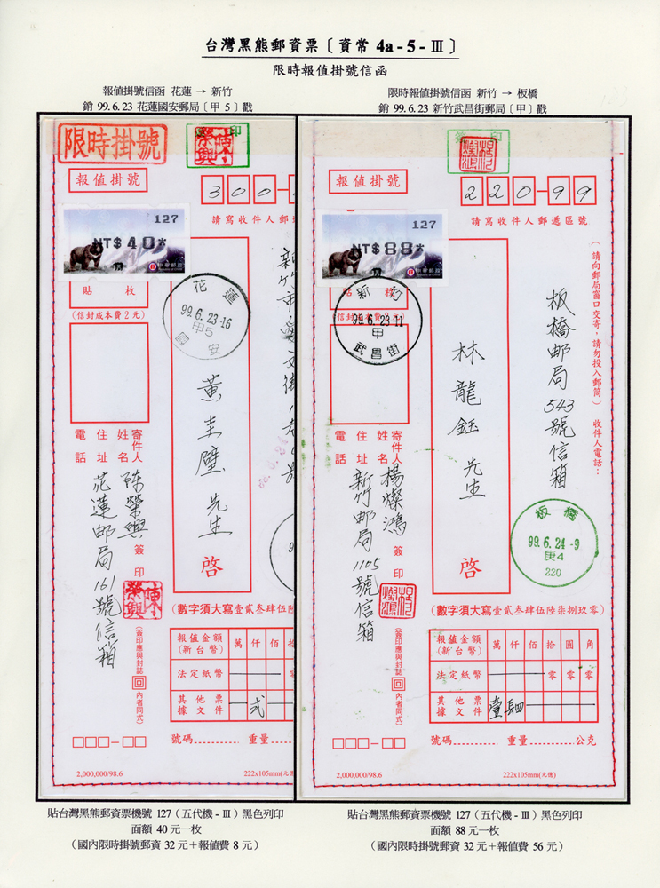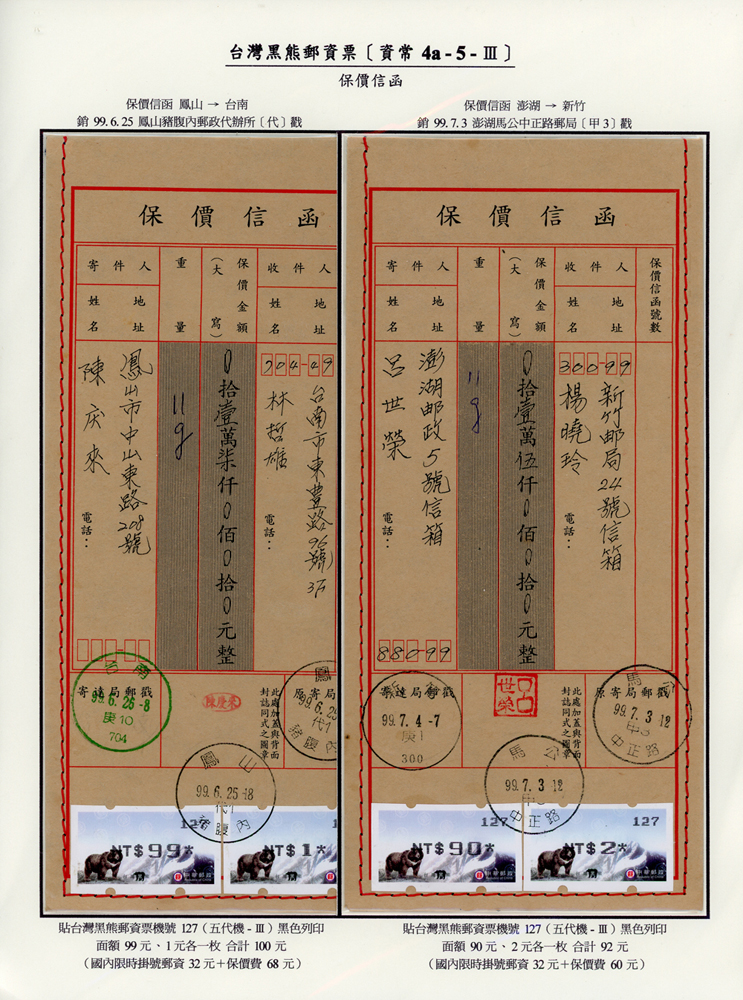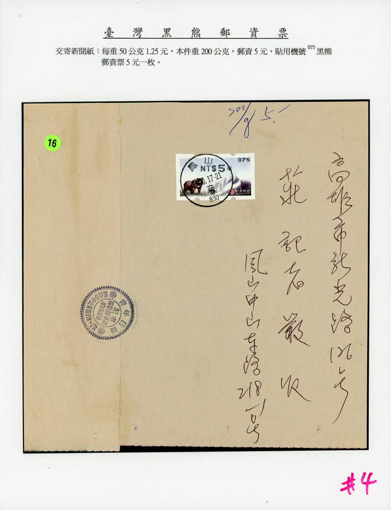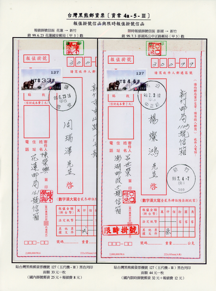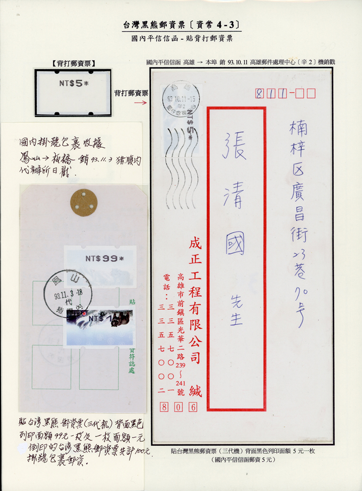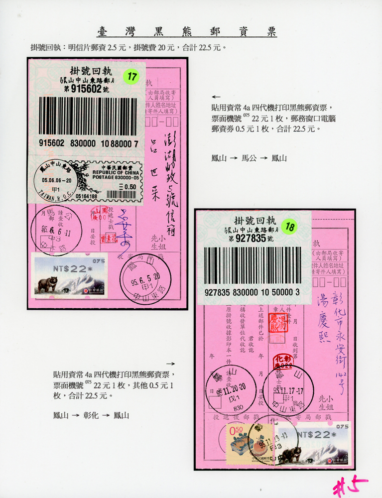 台灣黑熊及其加蓋郵資票小集,共8個貼頁,包括新票20枚,報值掛號實寄封4封,實寄保價信函2封,貼背打印票實寄1封,郵政單據4件(其中1件貼打印倒蓋票1枚,背面打印票1枚),新聞紙封1封,未印黑熊圖白紙打印NT$5*一枚,VF-F(Page 117)
