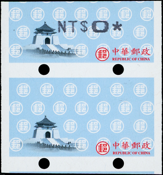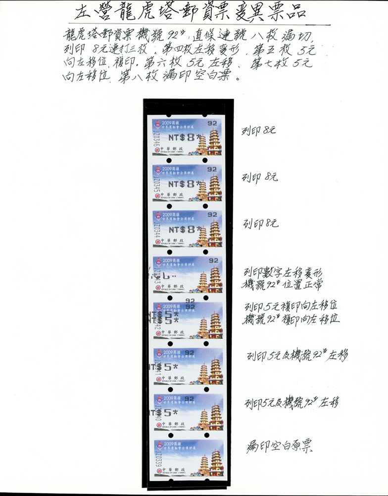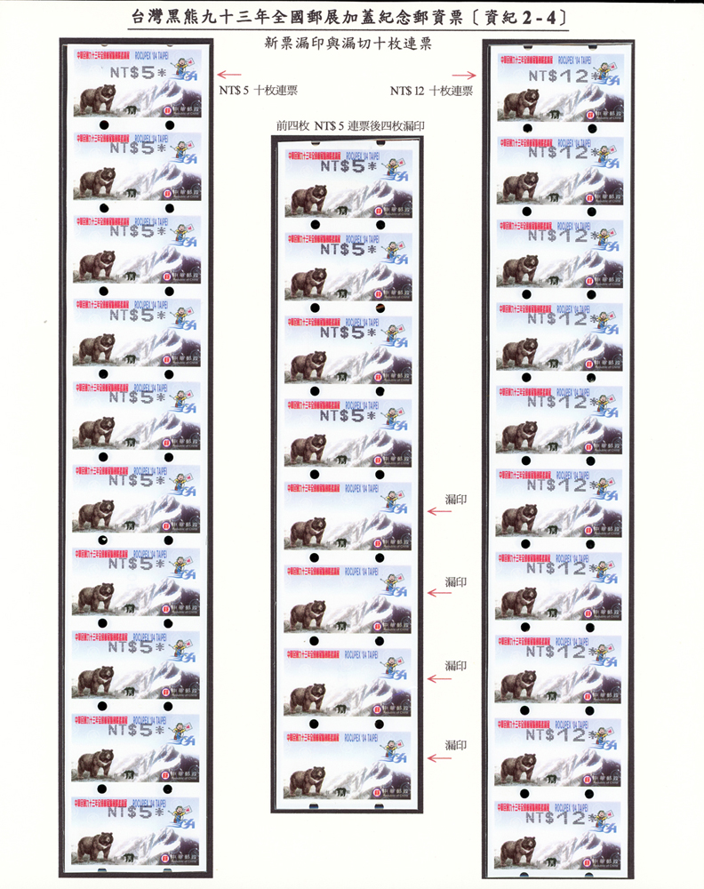 郵資票變體一組:(1)二版中正紀念堂雙連裁切位移,上枚打印『NT$0*』,下枚未打印空白,VF;(2)龍虎塔未裁切8連,含:打印左移字體變形,打印左移兼複打,未打印空白等,VF;(3)台灣黑熊加印中華民國九十三年全國郵展紀念未裁切10連2組(分別打印5元及12元).8連1組(上4枚打印5元,下4枚未打印空白),VF(Page 118)