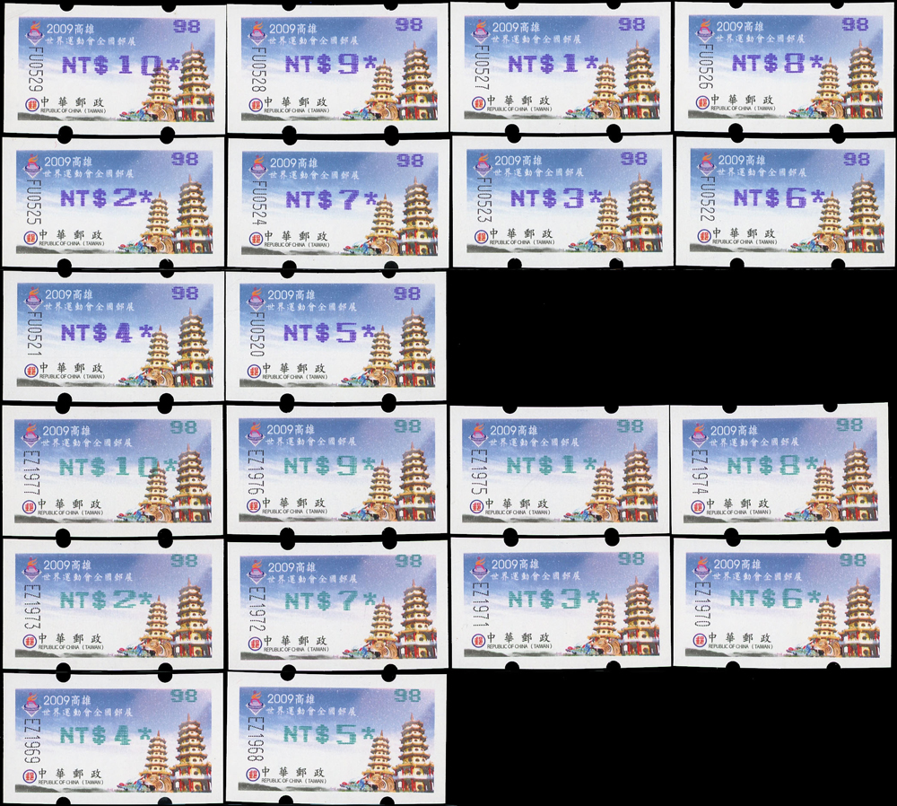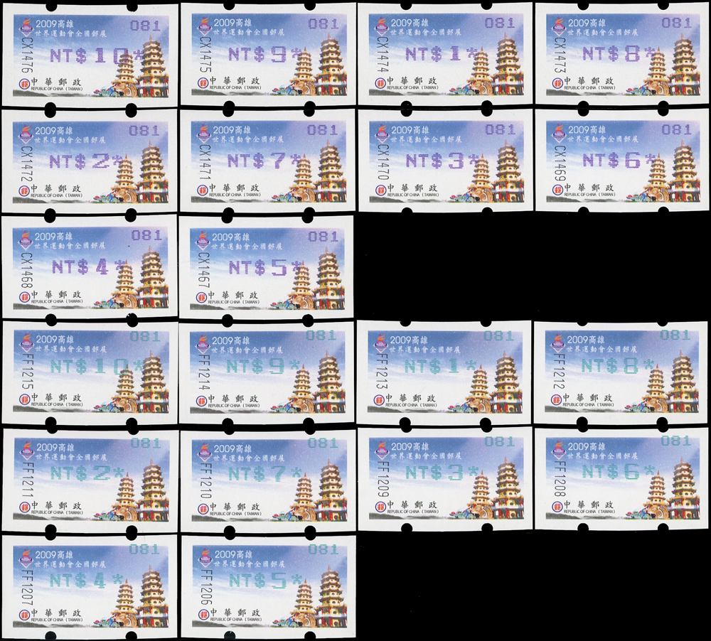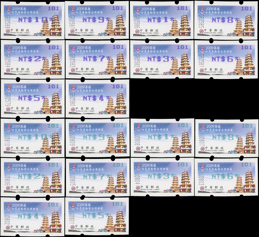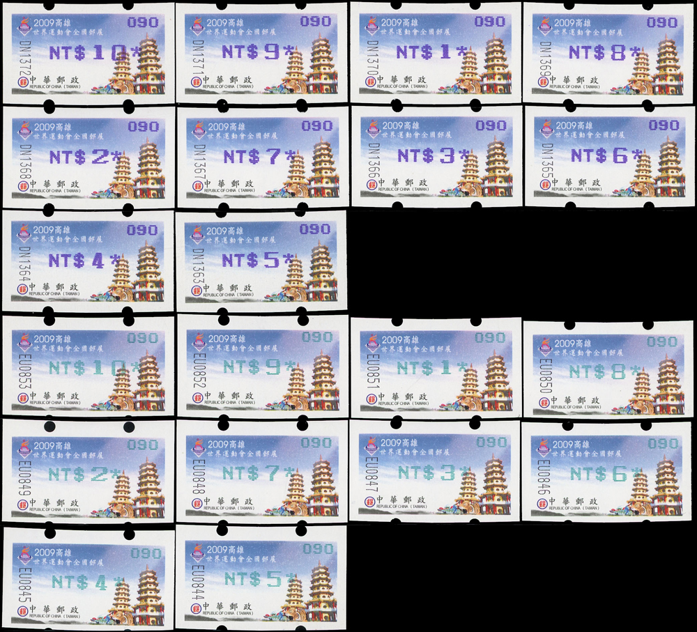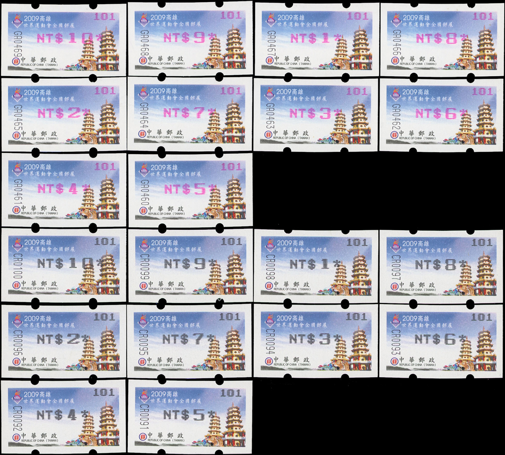 資紀10.龍虎塔加印2009高雄世運郵展郵資票,紅.黑.藍.綠色連號打印NT$1~10元,機號#077.#081.#090.#96.#97.#98.#101.#103各一組,共計320枚,8機4色集全少,總面值共計NT$1760元,VF