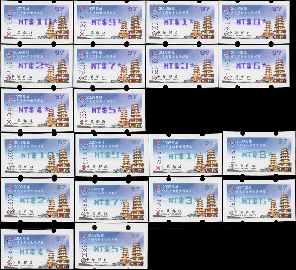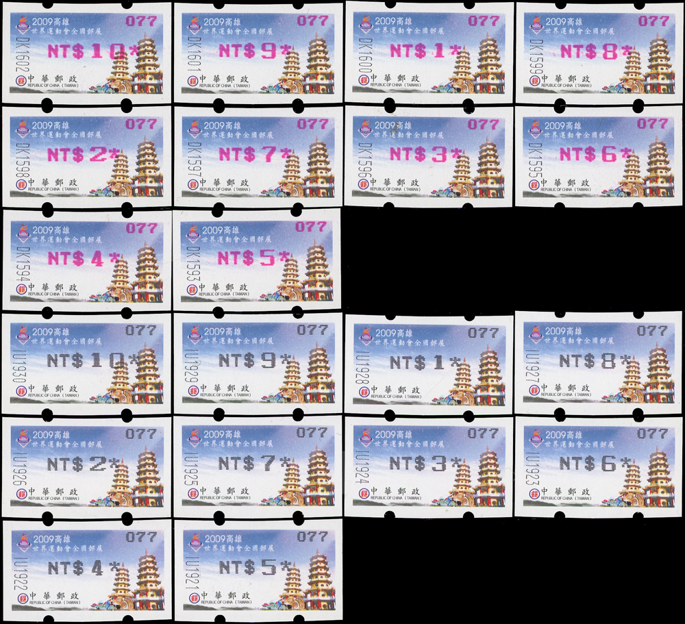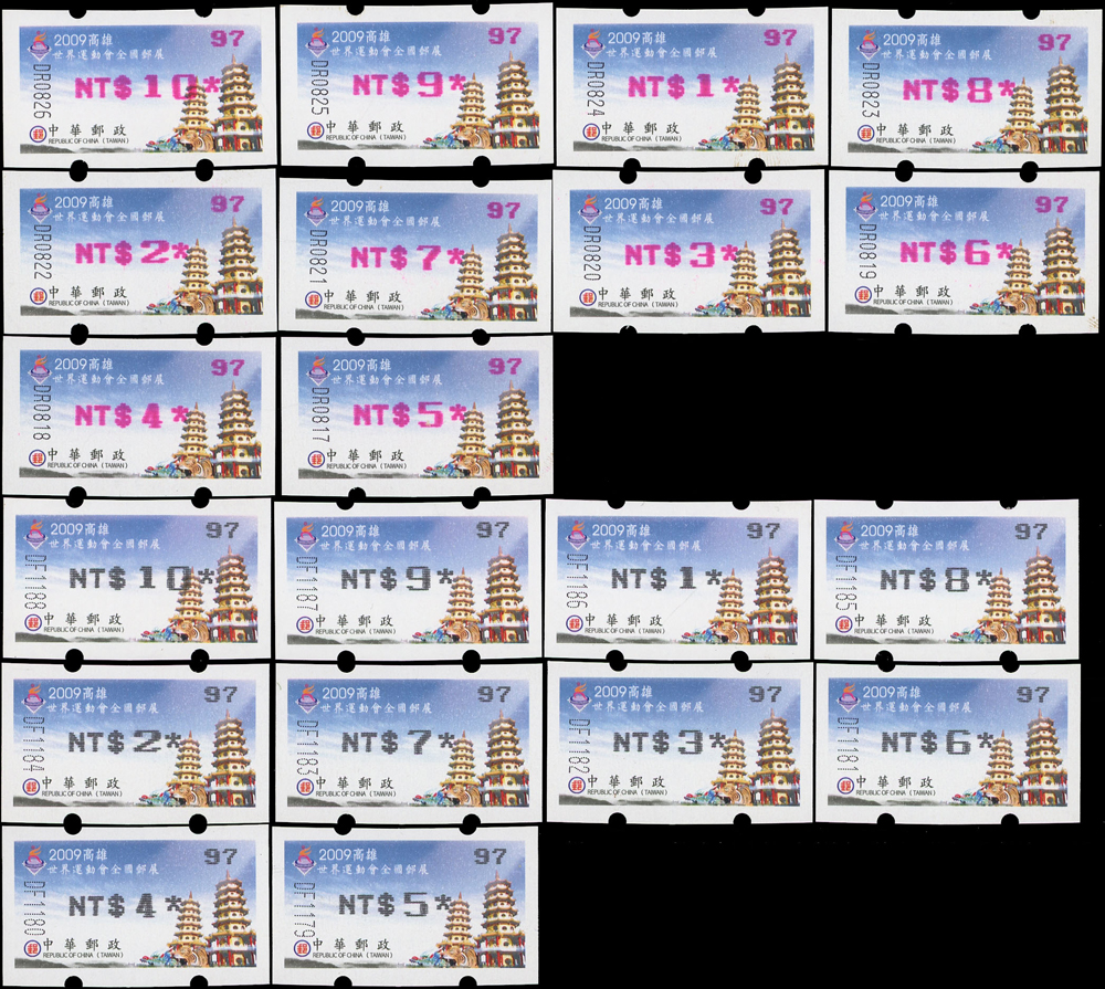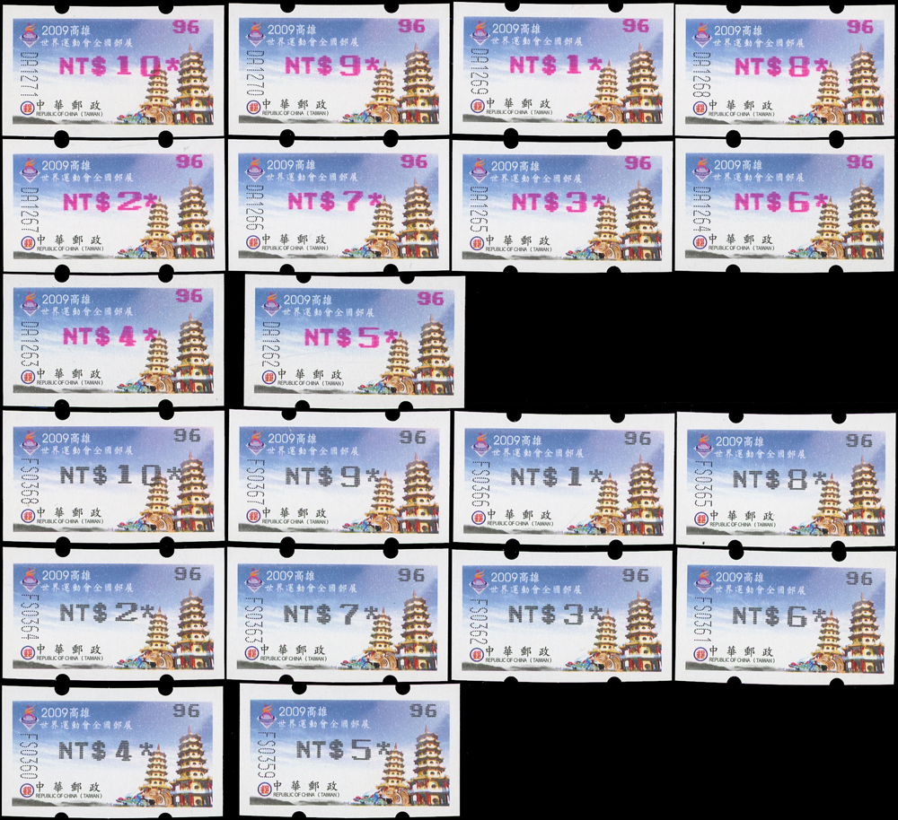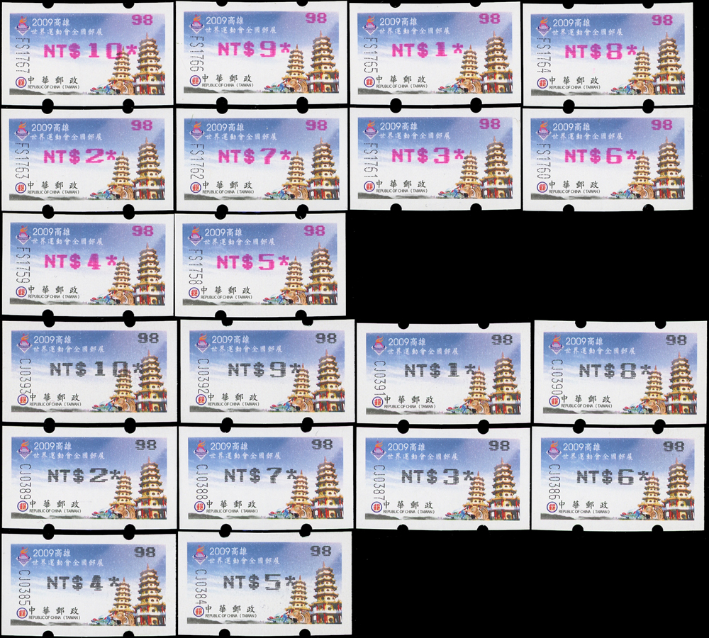 資紀10.龍虎塔加印2009高雄世運郵展郵資票,紅.黑.藍.綠色連號打印NT$1~10元,機號#077.#081.#090.#96.#97.#98.#101.#103各一組,共計320枚,8機4色集全少,總面值共計NT$1760元,VF
