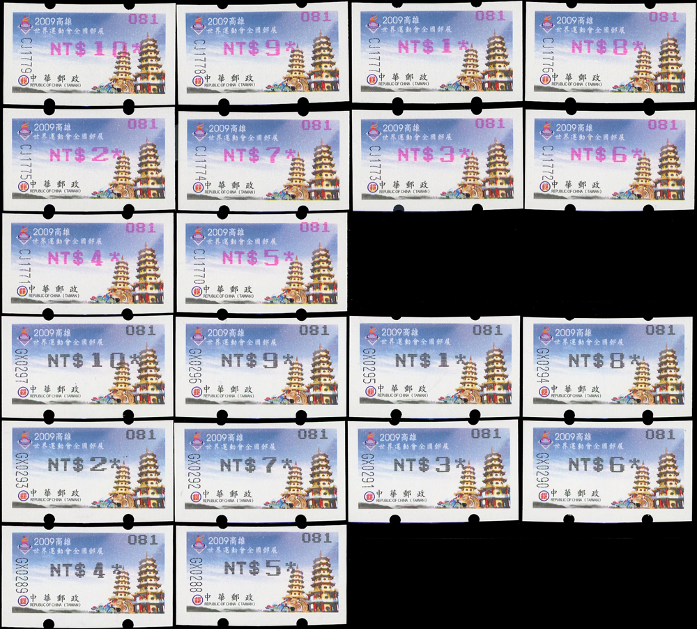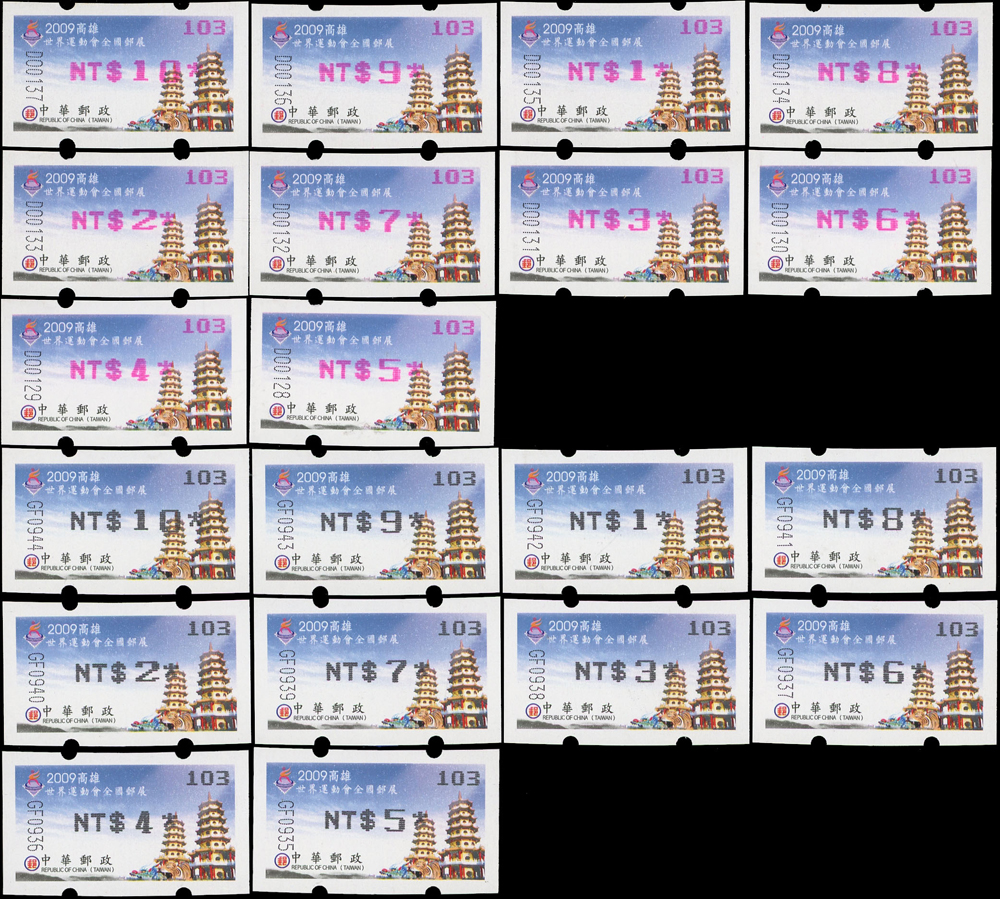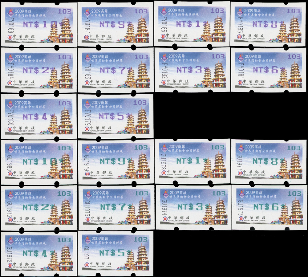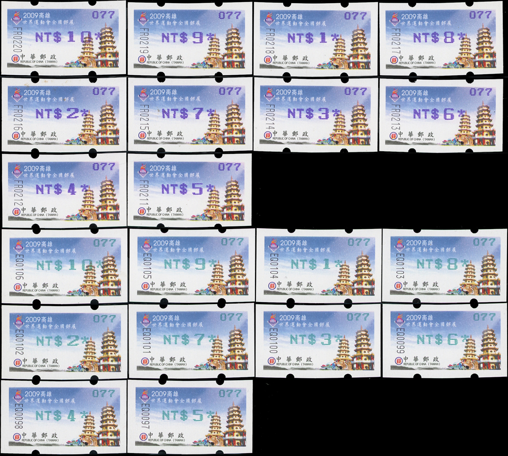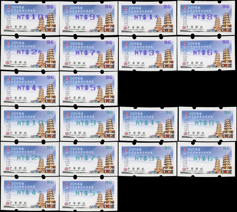 資紀10.龍虎塔加印2009高雄世運郵展郵資票,紅.黑.藍.綠色連號打印NT$1~10元,機號#077.#081.#090.#96.#97.#98.#101.#103各一組,共計320枚,8機4色集全少,總面值共計NT$1760元,VF