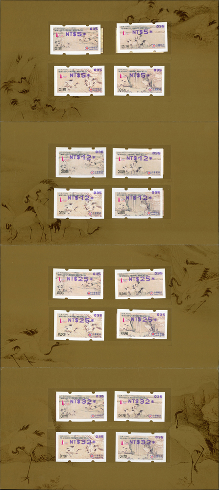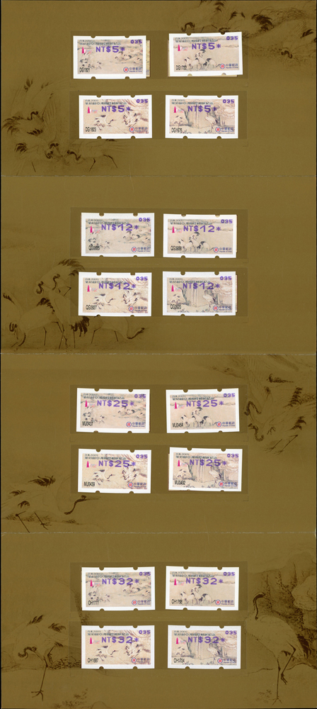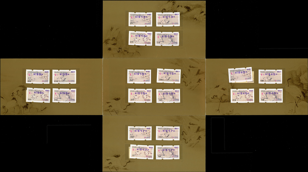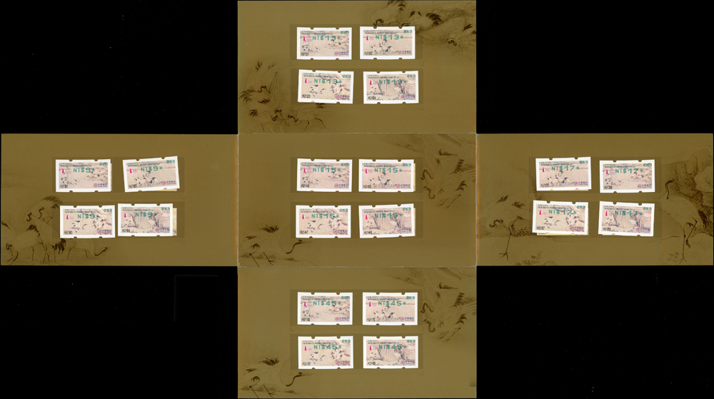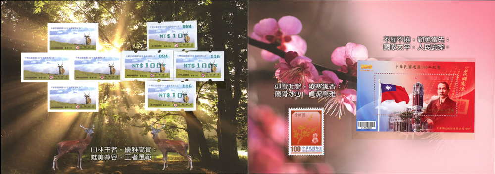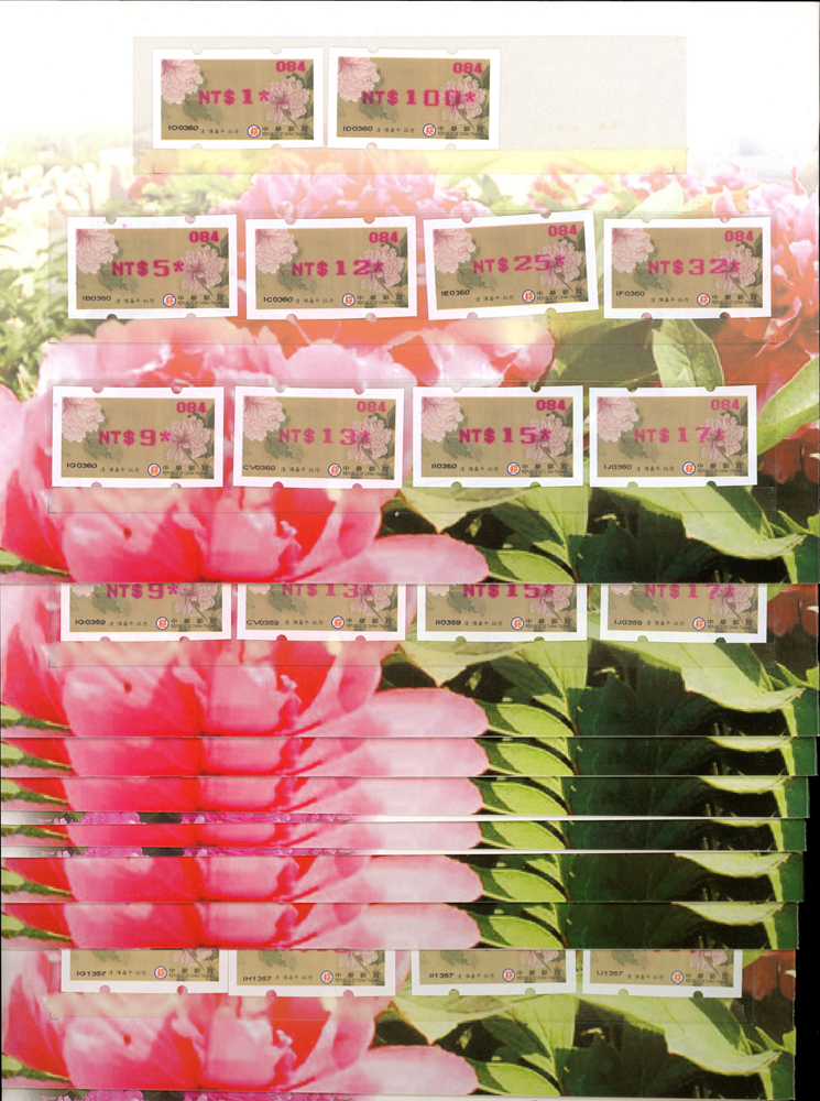 郵資票郵摺一組,總面值共計NT$3561元:(1)清惲壽平牡丹8本,每本內均含票號相同1元~100元共10枚,VF;(2)中華民國建國100年紀念-水鹿1本,內含100元.10元各2枚,國花100元1枚,中華民國建國100年小全張1枚,VF;(3)台北2005第18屆亞洲國際郵展紀念國內.國際郵資各2冊,內各為胎仙圖4全4組及5組,VF