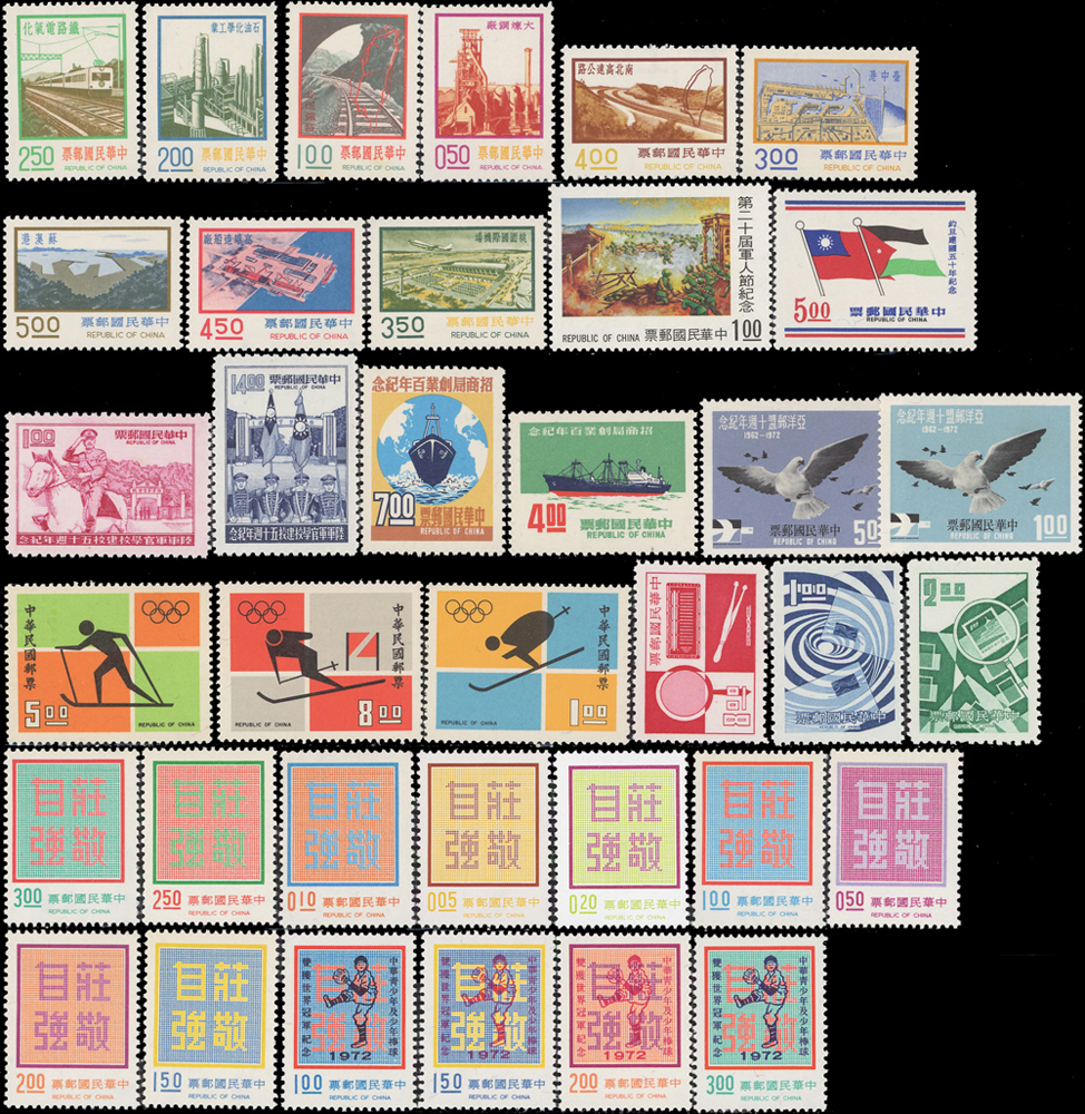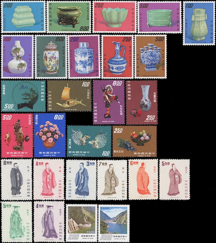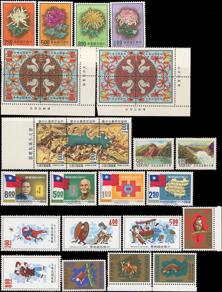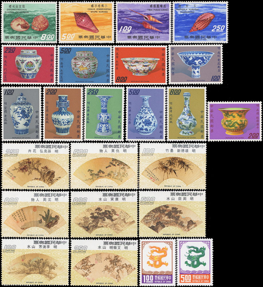 民國60~64年台灣郵票67套不同,無連刷古畫票及小全張,幾近全年度,包括有:臺灣貝殼.臺灣獸類.建國六十年國慶.十駿犬.一輪鼠.清瓷.莊敬自強.先聖先賢.明瓷.民俗(62年版).臺灣手工藝產品.曾文水庫落成.駿馬圖古畫(連刷撕開).扇面古畫等等,除中國民間故事(63年版)背嚴重黃斑外,其他少數套齒緣淡黃,多數保存佳,VF-F;歡迎至官網瀏覽全貌