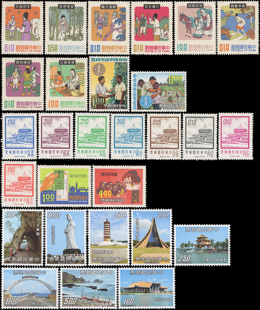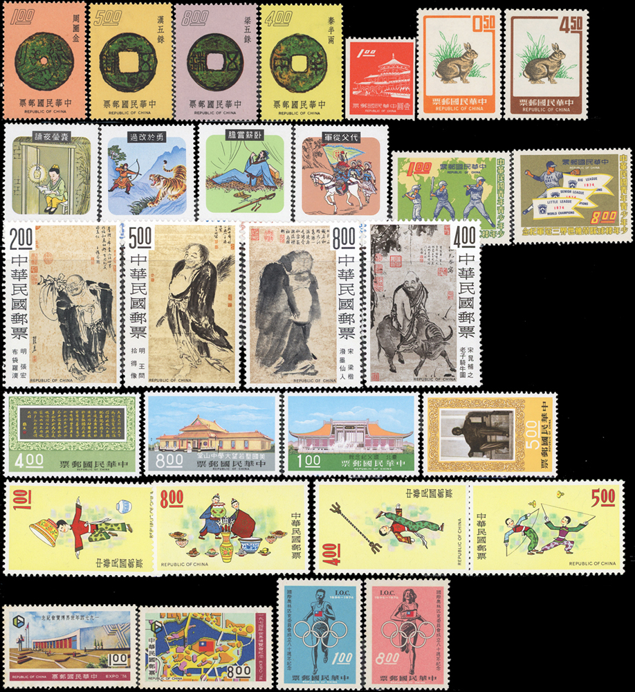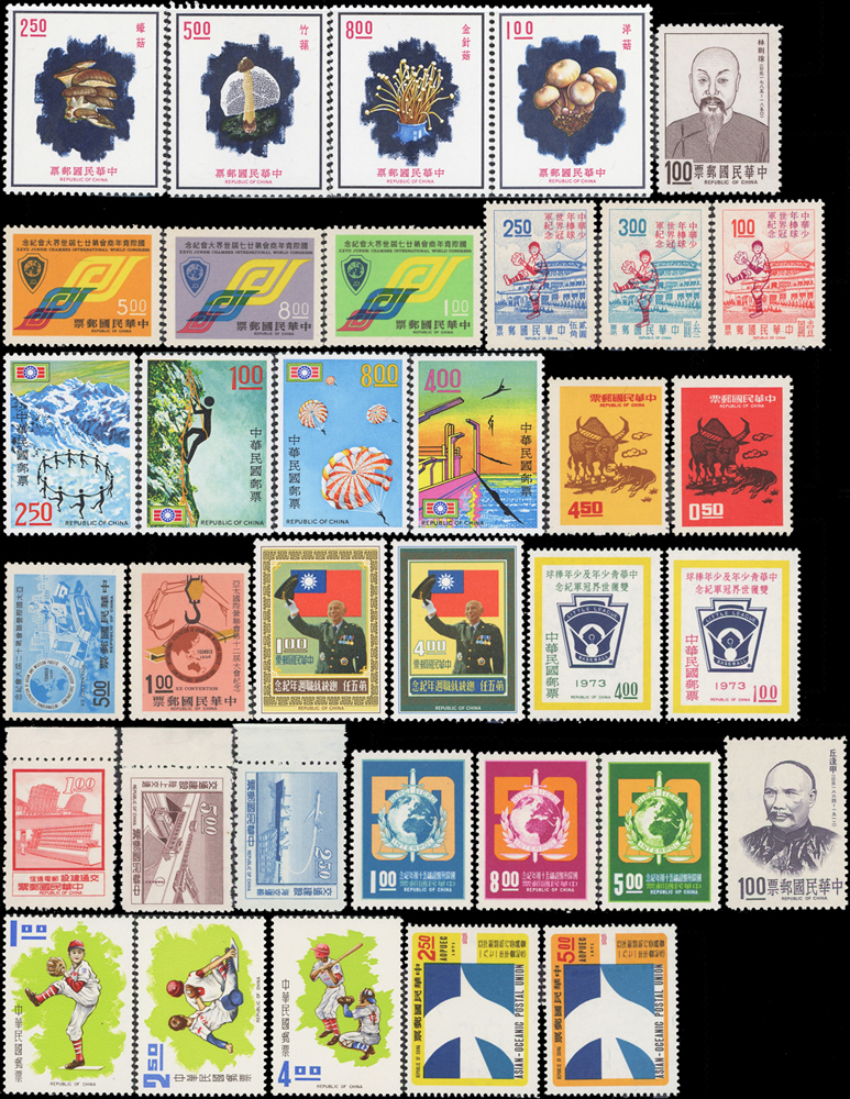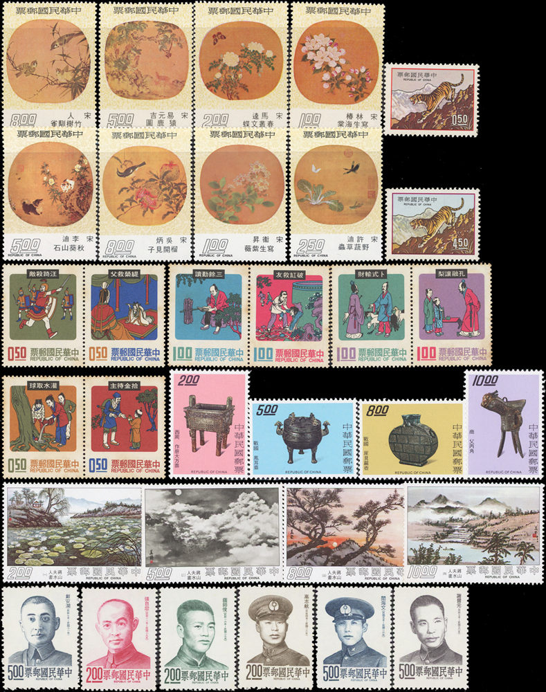 民國60~64年台灣郵票67套不同,無連刷古畫票及小全張,幾近全年度,包括有:臺灣貝殼.臺灣獸類.建國六十年國慶.十駿犬.一輪鼠.清瓷.莊敬自強.先聖先賢.明瓷.民俗(62年版).臺灣手工藝產品.曾文水庫落成.駿馬圖古畫(連刷撕開).扇面古畫等等,除中國民間故事(63年版)背嚴重黃斑外,其他少數套齒緣淡黃,多數保存佳,VF-F;歡迎至官網瀏覽全貌