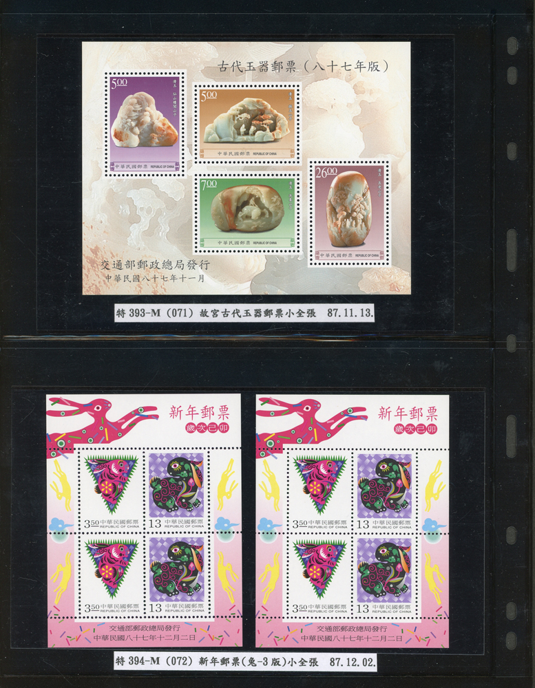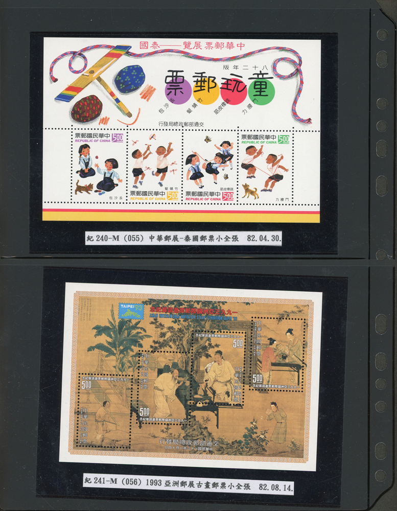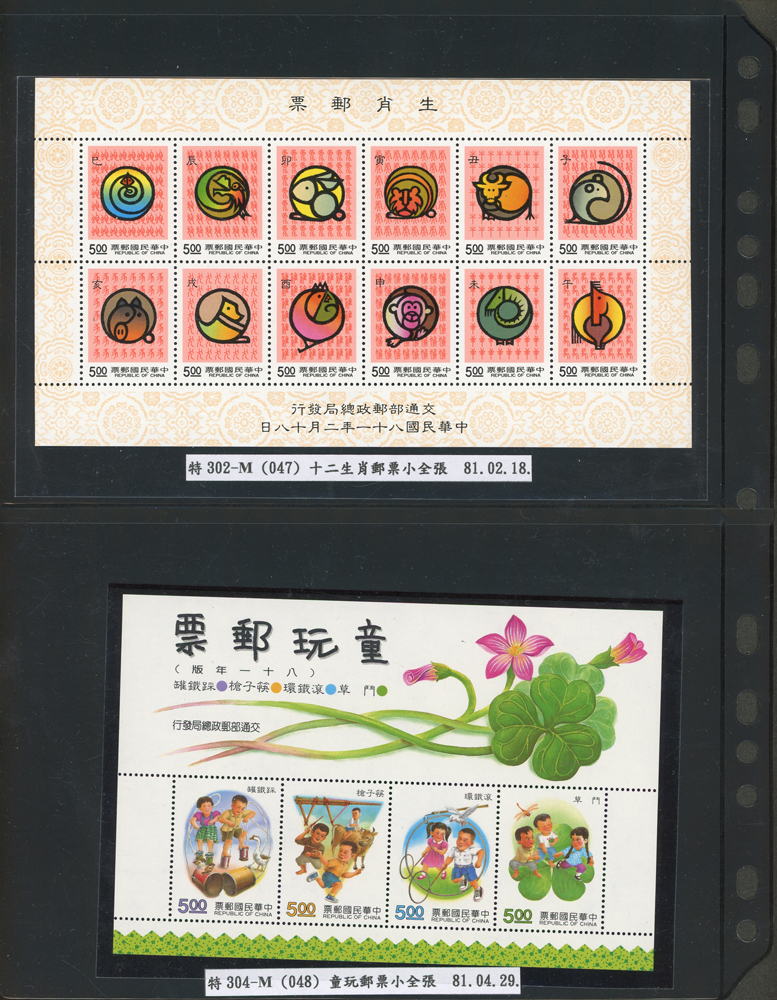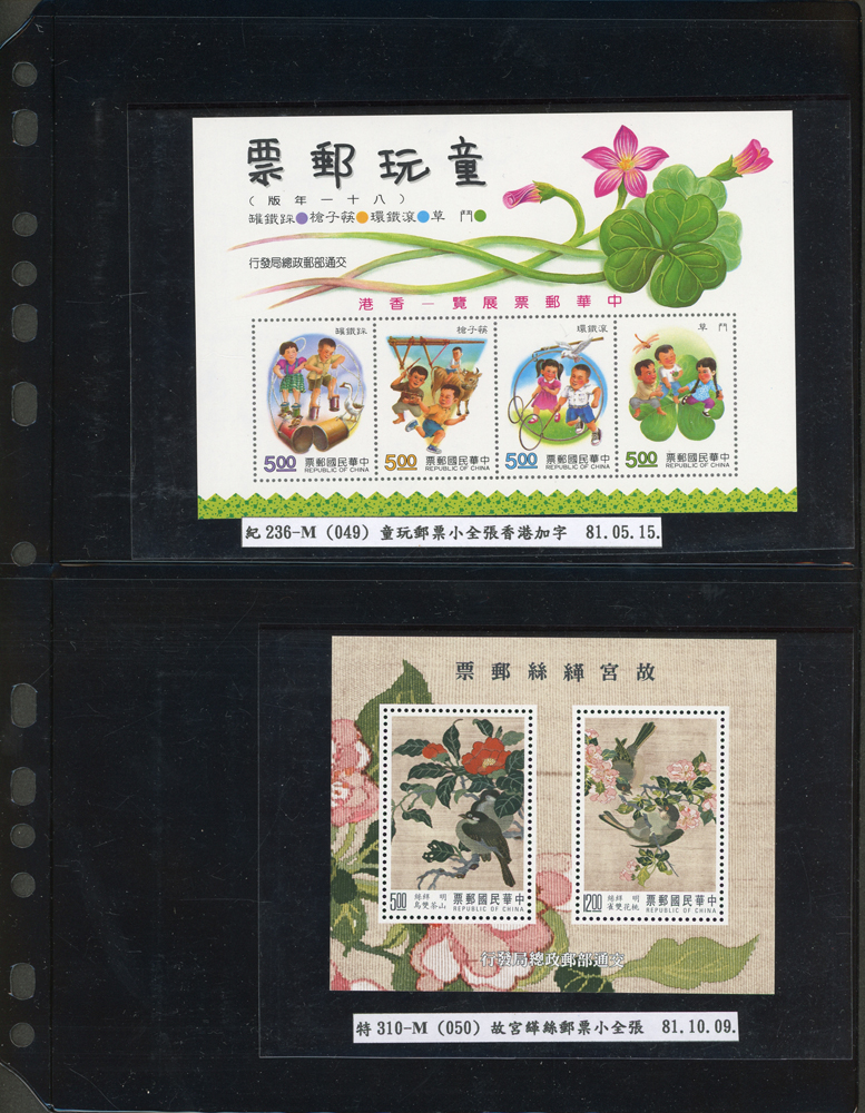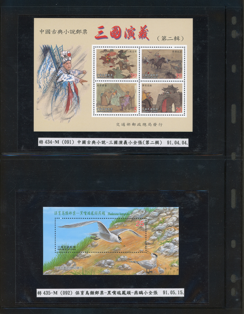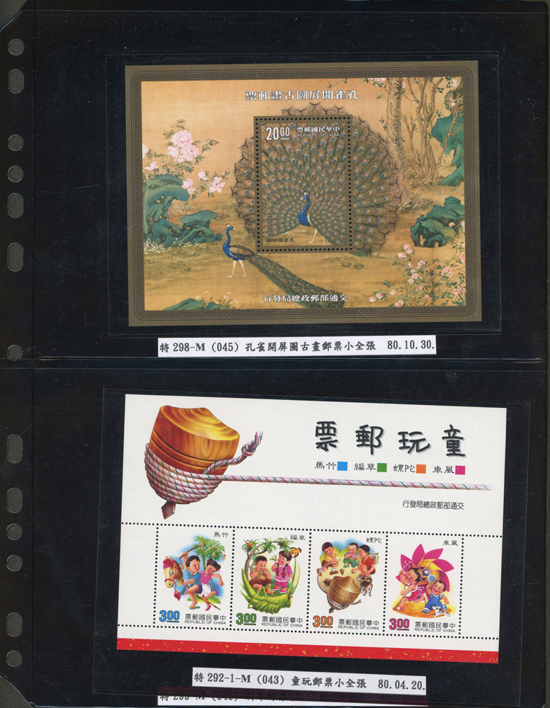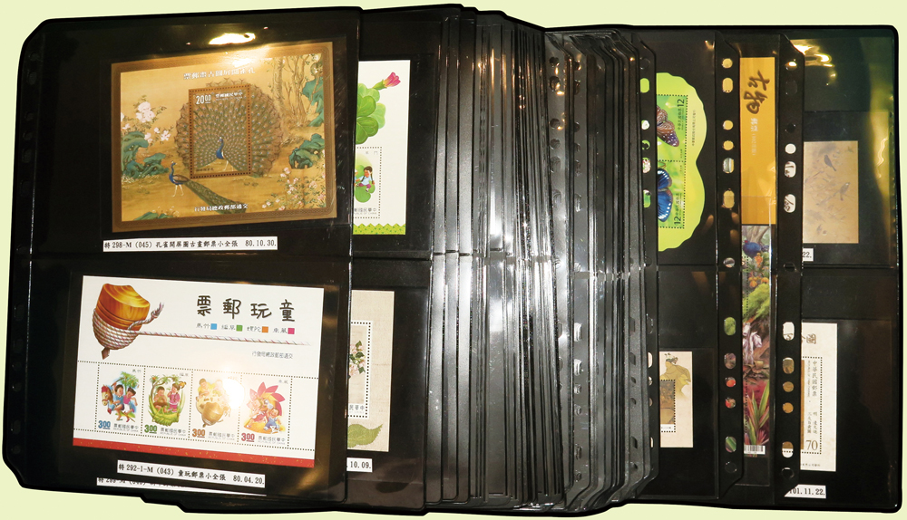 台灣1991~2021年新票小全張共223枚,總面值共計NT$7725.5元,包括有:孔雀,童玩(1-4輯)及其加字,緙絲,三輪生肖12枚全,1993亞洲國際郵票邀請展,麗人行,1996年第十屆亞洲國際郵展,古代玉器,中國古典戲劇,921賑災附捐,三國演義,聽阮圖,台北2005年第18屆郵展(1-8輯),高雄2005國際郵票邀請展,四輪生肖(缺鼠年),五輪生肖(雞~虎),宋代書畫,蝴蝶,古物(2009.2010.2013年版),莫拉克颱風賑災附捐,香山九老圖,慶典煙火,情人節,三友百禽圖,清代刺繡,古代文物,臺北2015第30屆亞洲國際郵展(4枚不同),清郎世寧古畫,龍藏經,扇面書畫,臺北2016世界郵展(6枚不同),青花瓷,故宮早春圖,殷墟,感恩等等,品種豐富或有重複,品像混合,多數保存佳,VF-F;歡迎至官網瀏覽全貌