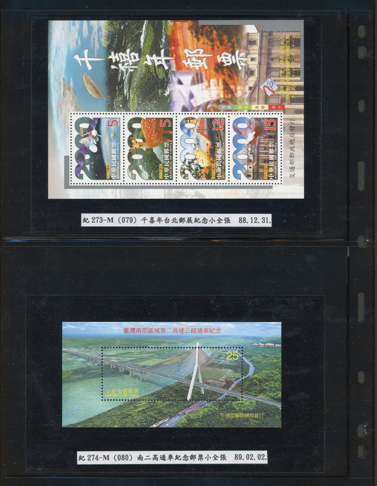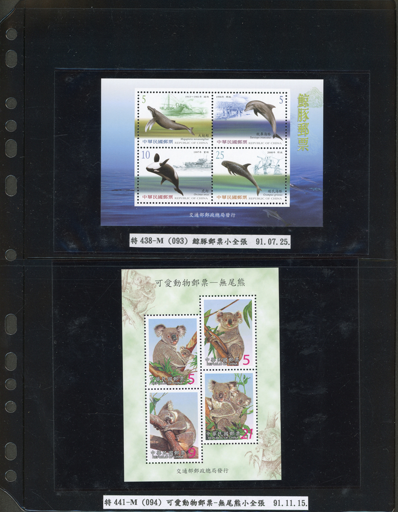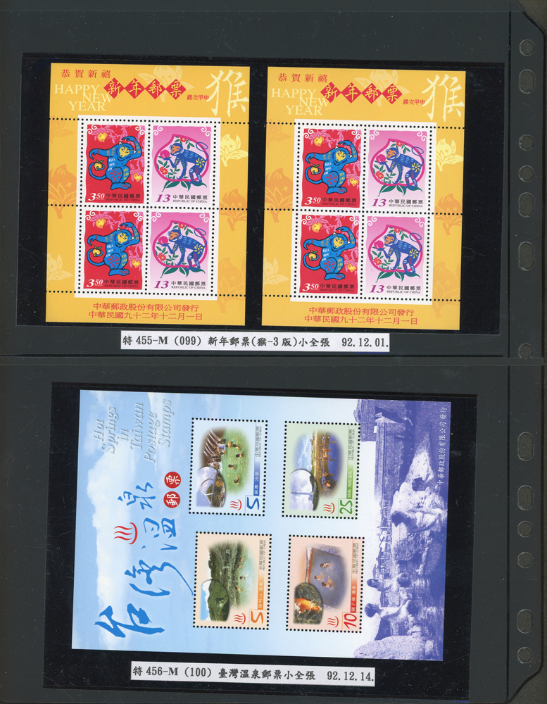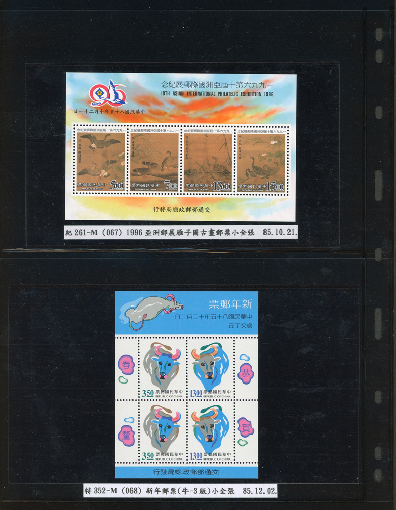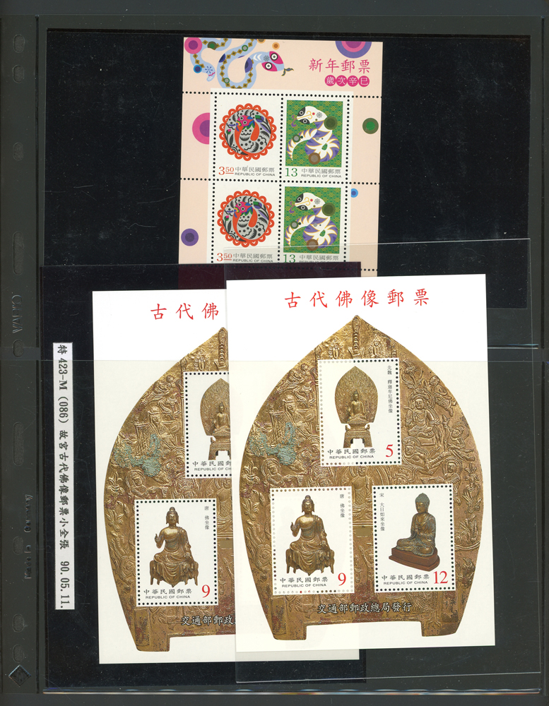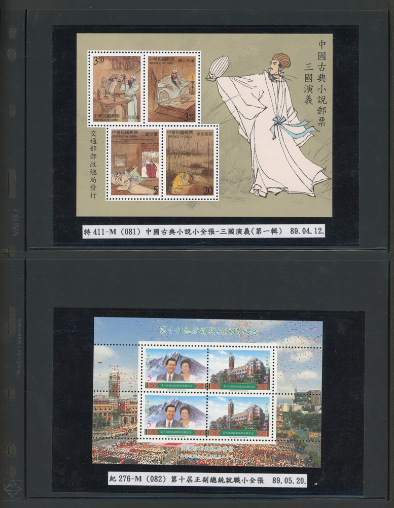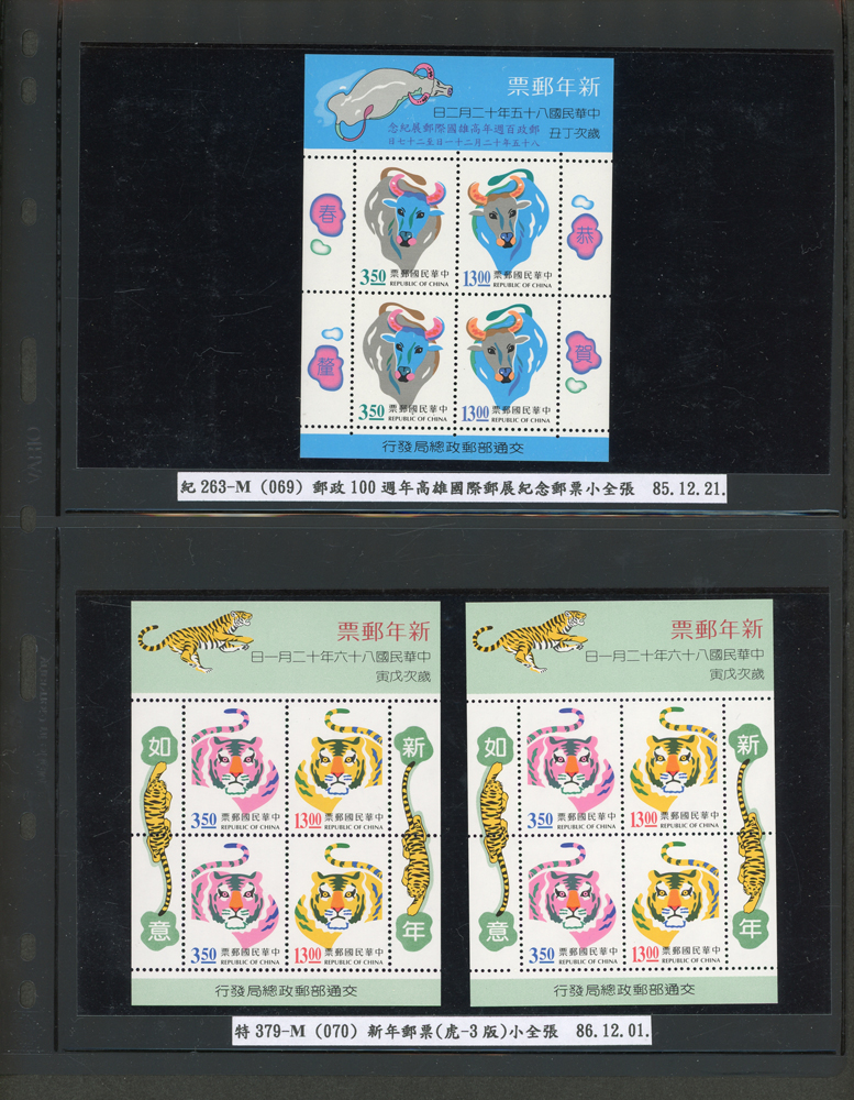 台灣1991~2021年新票小全張共223枚,總面值共計NT$7725.5元,包括有:孔雀,童玩(1-4輯)及其加字,緙絲,三輪生肖12枚全,1993亞洲國際郵票邀請展,麗人行,1996年第十屆亞洲國際郵展,古代玉器,中國古典戲劇,921賑災附捐,三國演義,聽阮圖,台北2005年第18屆郵展(1-8輯),高雄2005國際郵票邀請展,四輪生肖(缺鼠年),五輪生肖(雞~虎),宋代書畫,蝴蝶,古物(2009.2010.2013年版),莫拉克颱風賑災附捐,香山九老圖,慶典煙火,情人節,三友百禽圖,清代刺繡,古代文物,臺北2015第30屆亞洲國際郵展(4枚不同),清郎世寧古畫,龍藏經,扇面書畫,臺北2016世界郵展(6枚不同),青花瓷,故宮早春圖,殷墟,感恩等等,品種豐富或有重複,品像混合,多數保存佳,VF-F;歡迎至官網瀏覽全貌