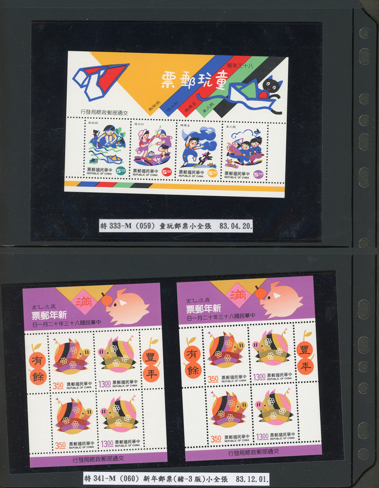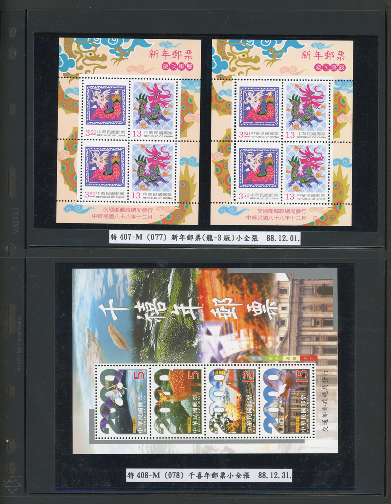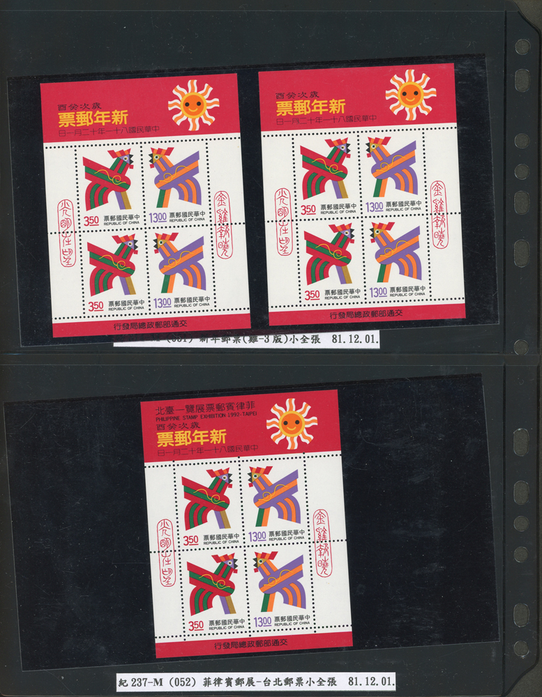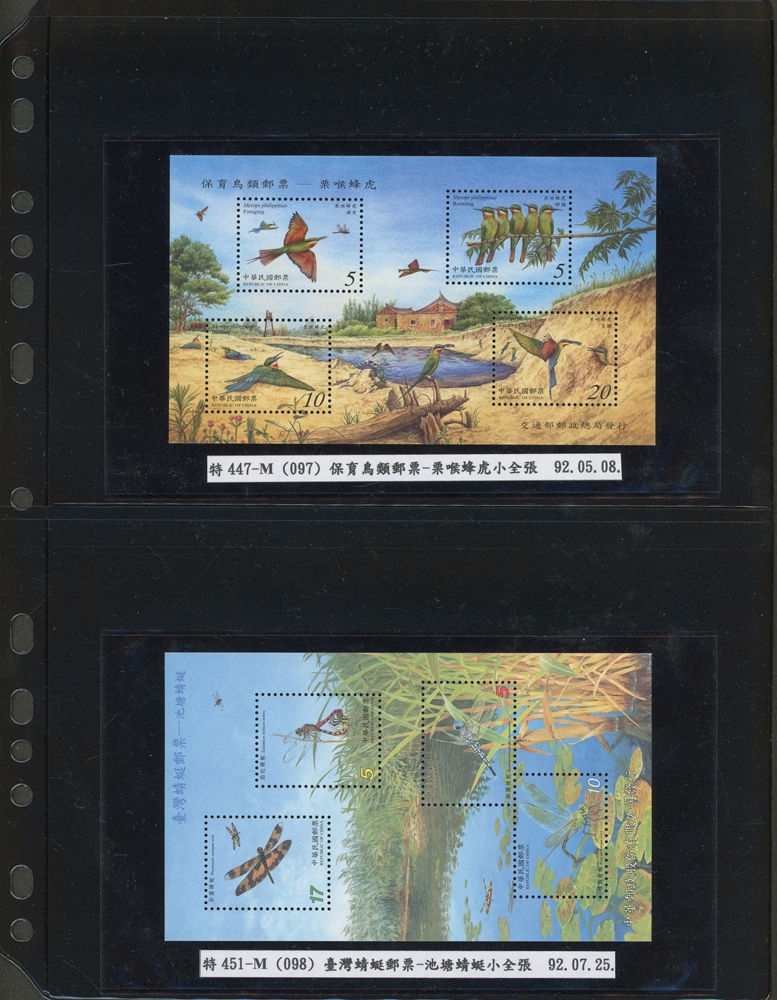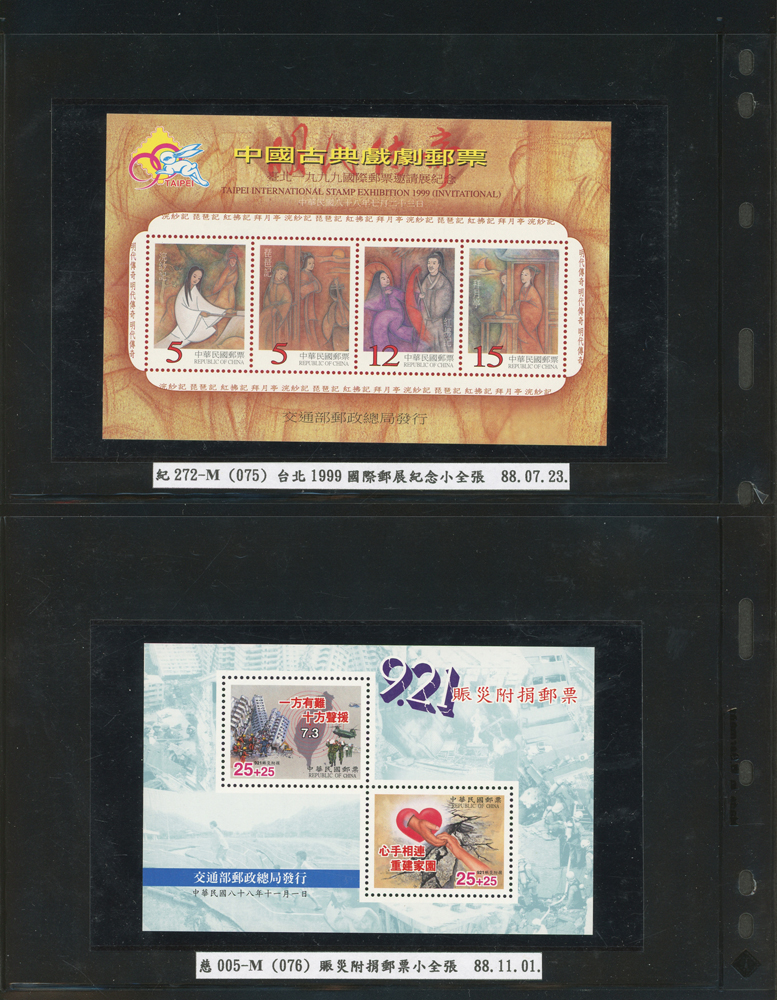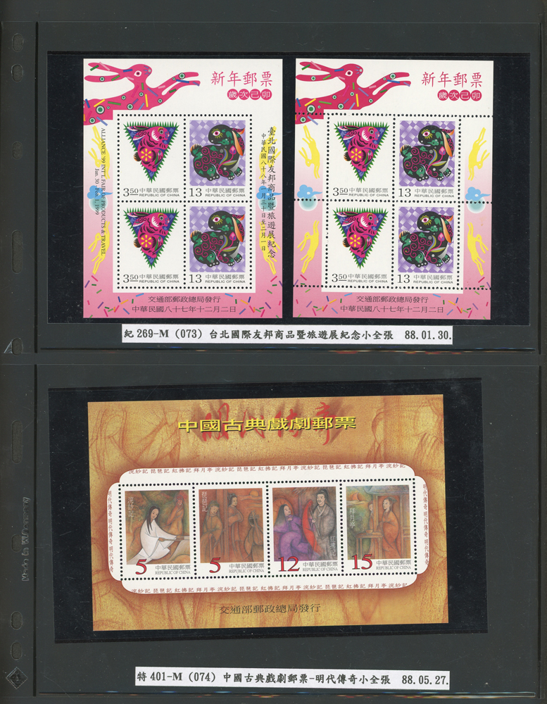 台灣1991~2021年新票小全張共223枚,總面值共計NT$7725.5元,包括有:孔雀,童玩(1-4輯)及其加字,緙絲,三輪生肖12枚全,1993亞洲國際郵票邀請展,麗人行,1996年第十屆亞洲國際郵展,古代玉器,中國古典戲劇,921賑災附捐,三國演義,聽阮圖,台北2005年第18屆郵展(1-8輯),高雄2005國際郵票邀請展,四輪生肖(缺鼠年),五輪生肖(雞~虎),宋代書畫,蝴蝶,古物(2009.2010.2013年版),莫拉克颱風賑災附捐,香山九老圖,慶典煙火,情人節,三友百禽圖,清代刺繡,古代文物,臺北2015第30屆亞洲國際郵展(4枚不同),清郎世寧古畫,龍藏經,扇面書畫,臺北2016世界郵展(6枚不同),青花瓷,故宮早春圖,殷墟,感恩等等,品種豐富或有重複,品像混合,多數保存佳,VF-F;歡迎至官網瀏覽全貌