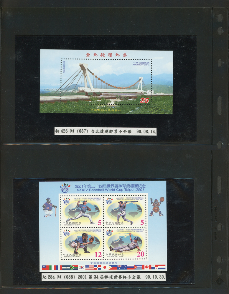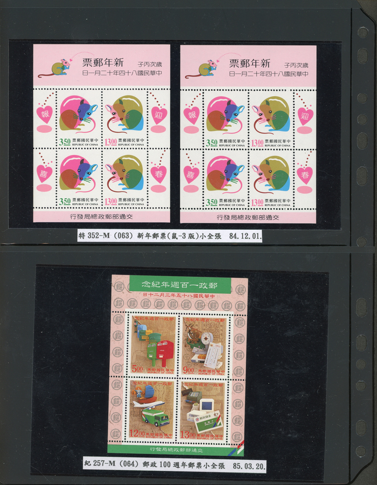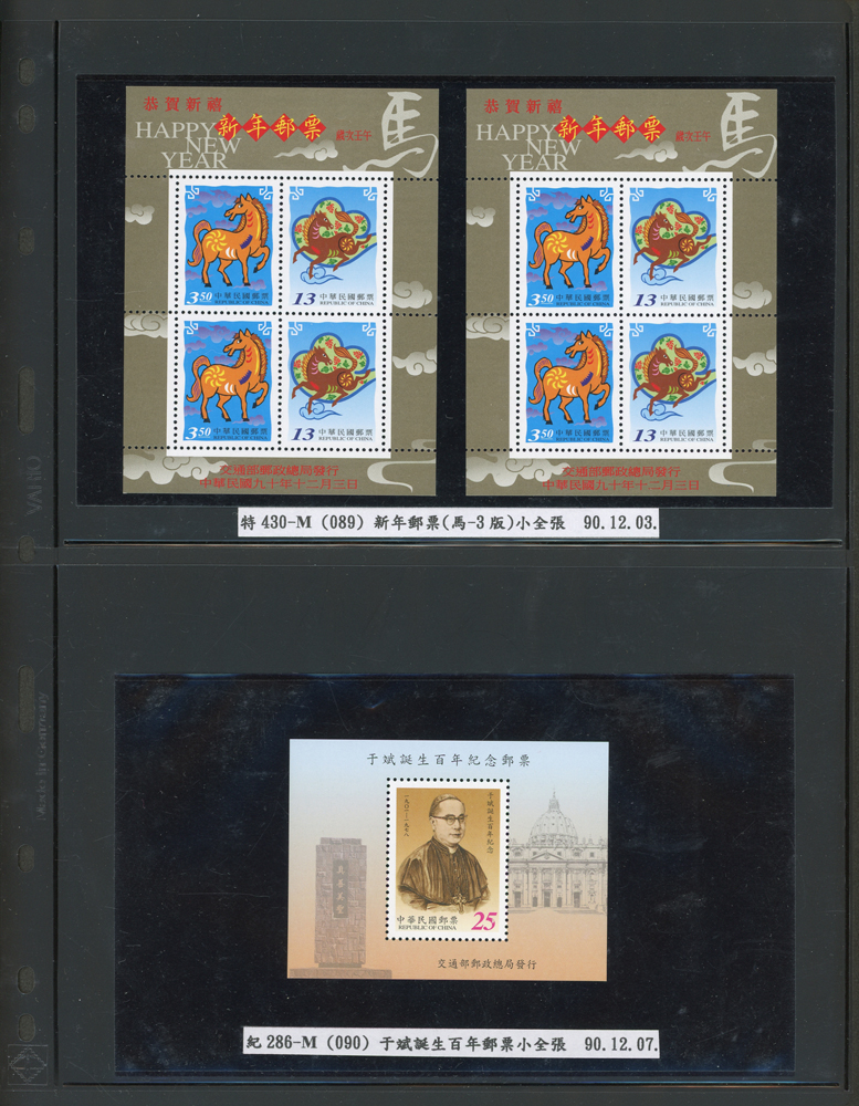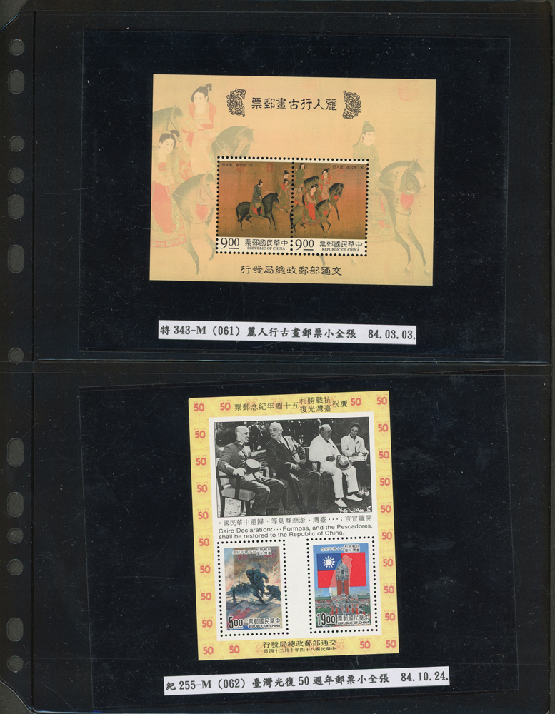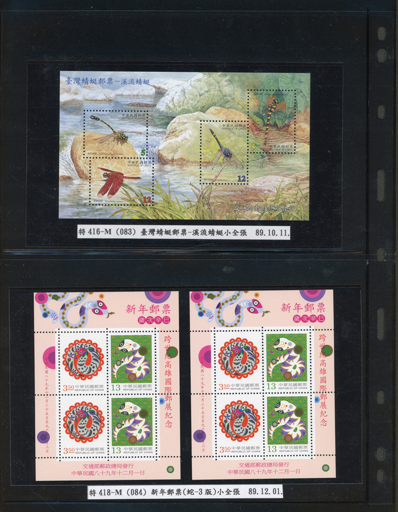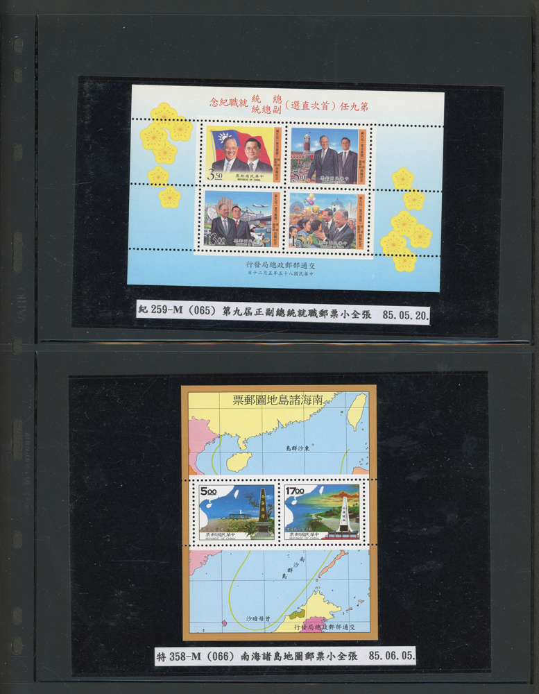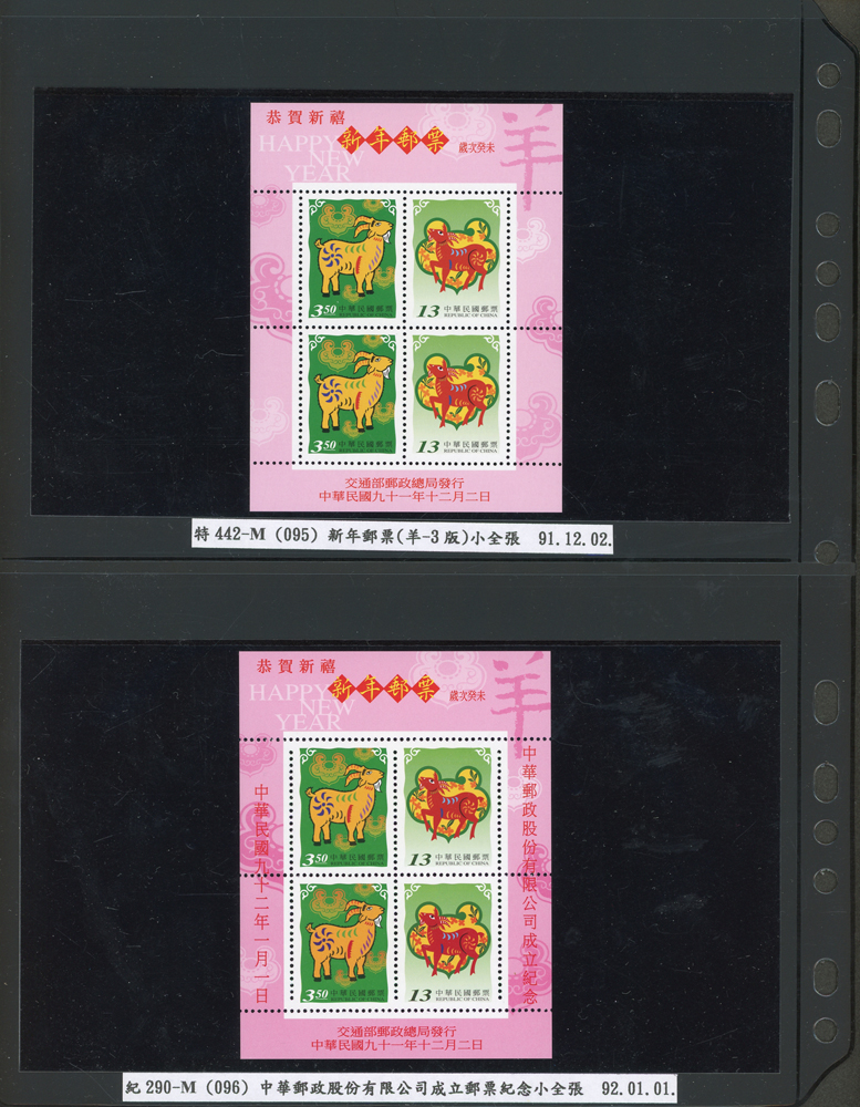 台灣1991~2021年新票小全張共223枚,總面值共計NT$7725.5元,包括有:孔雀,童玩(1-4輯)及其加字,緙絲,三輪生肖12枚全,1993亞洲國際郵票邀請展,麗人行,1996年第十屆亞洲國際郵展,古代玉器,中國古典戲劇,921賑災附捐,三國演義,聽阮圖,台北2005年第18屆郵展(1-8輯),高雄2005國際郵票邀請展,四輪生肖(缺鼠年),五輪生肖(雞~虎),宋代書畫,蝴蝶,古物(2009.2010.2013年版),莫拉克颱風賑災附捐,香山九老圖,慶典煙火,情人節,三友百禽圖,清代刺繡,古代文物,臺北2015第30屆亞洲國際郵展(4枚不同),清郎世寧古畫,龍藏經,扇面書畫,臺北2016世界郵展(6枚不同),青花瓷,故宮早春圖,殷墟,感恩等等,品種豐富或有重複,品像混合,多數保存佳,VF-F;歡迎至官網瀏覽全貌