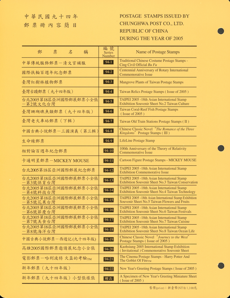郵票分類 大清郵政 1911年以前清代~海關大龍及小龍郵票(1001-1028)清代~慈壽/紅印花及蟠龍郵票(1029-1065)清代~蟠龍郵戳/宣統及其他郵票(1066-1081)清代~商埠郵票(1136-1155)在華客郵郵票(1159-1167)中華民國郵政 1912~1949年民國~整批/整冊郵票(1189-1201)民國~常用郵票&變體票.趣味品(1202-1323)民國~紀念郵票(1324-1347)民國~專題/航空/欠資/附捐/儲金(1348-1366)民國~加蓋限省貼用/單位銀元郵票/郵戳(1367-1388)民國~郵票小冊(1389-1423)日偽政權~郵票(1704-1713)台灣 1888~2020年台灣~整批/整冊郵票(3501-3553)清代~台灣官用郵票(3584-3593)清代~台灣龍馬票(3594-3595)清代~台灣民主國獨虎票(3596-3600)台灣~老台幣時期郵票&變體票1945~1949(3696-3737)台灣~新台幣時期郵票&變體票1950~2000年(3816-4062)台灣~大全張(4063-4384)台灣~生肖筒(4385-4399)台灣~樣票(4400-4453)台灣~小全張(4454-4595)台灣~郵政贈品/紀念品(4596-4601)台灣~郵票小冊(4602-4621)台灣~自動化郵資券(4622-4645)台灣~年度郵票/年度錦冊/專冊(4648-4673)中國人民郵政 1949~2018年新中國~解放區郵票(6123-6127)新中國~普通/改值郵票(6141-6171)新中國~紀念/編號/特種郵票(6172-6187)新中國~J、T字頭郵票(6188-6229)新中國~小型張/小本票(6230-6253)新中國~編年票(6254-6276)中國香港及澳門~郵票(6305-6313)世界各國郵票日本郵票(6317-6326)外國郵票(A~Z)(6335-6349) 大清郵政 1911年以前 ↳清代~海關大龍及小龍郵票(1001-1028) ↳清代~慈壽/紅印花及蟠龍郵票(1029-1065) ↳清代~蟠龍郵戳/宣統及其他郵票(1066-1081) ↳清代~商埠郵票(1136-1155) ↳在華客郵郵票(1159-1167)中華民國郵政 1912~1949年 ↳民國~整批/整冊郵票(1189-1201) ↳民國~常用郵票&變體票.趣味品(1202-1323) ↳民國~紀念郵票(1324-1347) ↳民國~專題/航空/欠資/附捐/儲金(1348-1366) ↳民國~加蓋限省貼用/單位銀元郵票/郵戳(1367-1388) ↳民國~郵票小冊(1389-1423) ↳日偽政權~郵票(1704-1713)台灣 1888~2020年 ↳台灣~整批/整冊郵票(3501-3553) ↳清代~台灣官用郵票(3584-3593) ↳清代~台灣龍馬票(3594-3595) ↳清代~台灣民主國獨虎票(3596-3600) ↳台灣~老台幣時期郵票&變體票1945~1949(3696-3737) ↳台灣~新台幣時期郵票&變體票1950~2000年(3816-4062) ↳台灣~大全張(4063-4384) ↳台灣~生肖筒(4385-4399) ↳台灣~樣票(4400-4453) ↳台灣~小全張(4454-4595) ↳台灣~郵政贈品/紀念品(4596-4601) ↳台灣~郵票小冊(4602-4621) ↳台灣~自動化郵資券(4622-4645) ↳台灣~年度郵票/年度錦冊/專冊(4648-4673)中國人民郵政 1949~2018年 ↳新中國~解放區郵票(6123-6127) ↳新中國~普通/改值郵票(6141-6171) ↳新中國~紀念/編號/特種郵票(6172-6187) ↳新中國~J、T字頭郵票(6188-6229) ↳新中國~小型張/小本票(6230-6253) ↳新中國~編年票(6254-6276) ↳中國香港及澳門~郵票(6305-6313)世界各國郵票 ↳日本郵票(6317-6326) ↳外國郵票(A~Z)(6335-6349) 點大圖放大展示,點小圖切換 台灣2004年全年度精裝年度冊,2005年三孔精裝年度冊各1本,共2本,均含郵票.型張,總面值共計NT$1683元,VF;總重約1990公克 結標時間 2025-12-16 16:26:00 拍品編號:4659 起拍價:NT$800 當前價:NT$800 自動出價 直接出價 出價 系統將按出價級數,依序為您比(出)價至上限金額 提醒您:直接出價後不可將金額改低,只能改高,蟠龍無法降低您的出價,最高出價者無法取消出價 (查看出價說明) 得標說明:需按得標價另加10%佣金 當前加價幅度:NT$0元 (查看加價級數表) 回上頁 線上出價記錄 線上 0 人次,書面 0 人次 競價客戶 所在地 出價時間 出價金額 出價方式 問與答 目前尚無提問 我要提問 請先登入會員