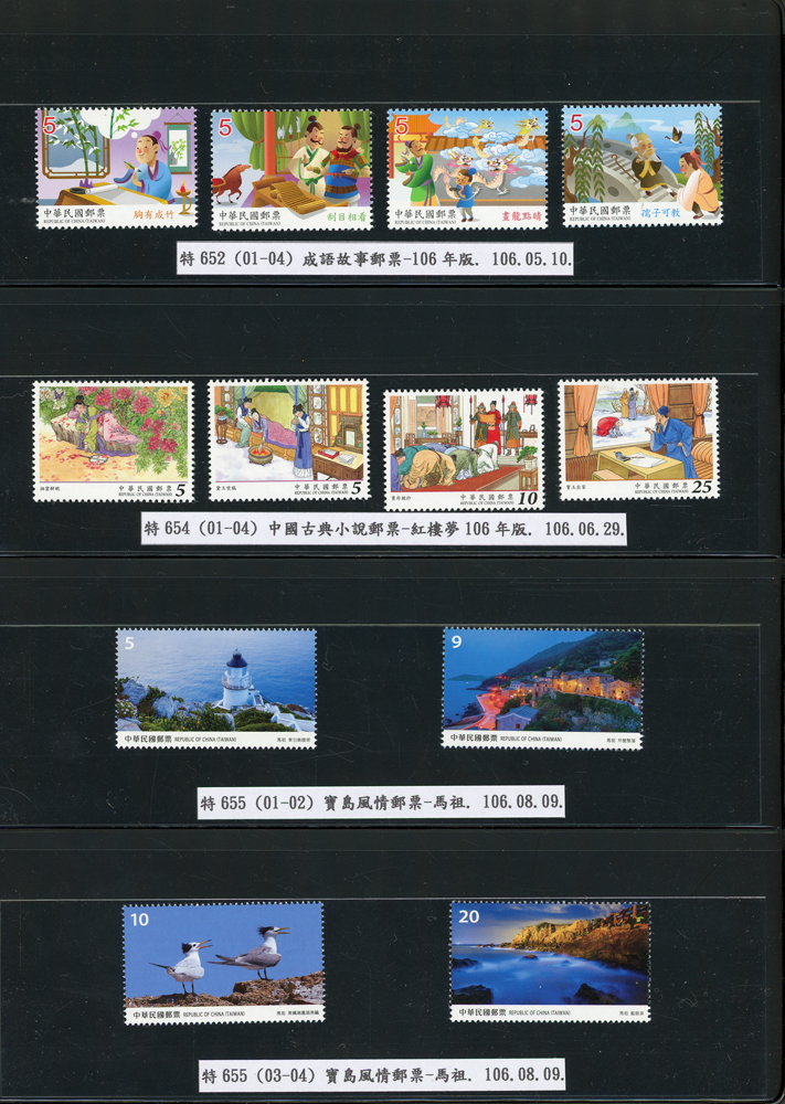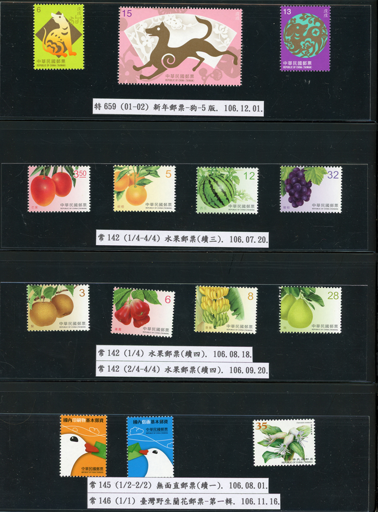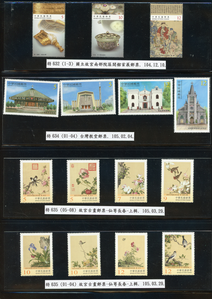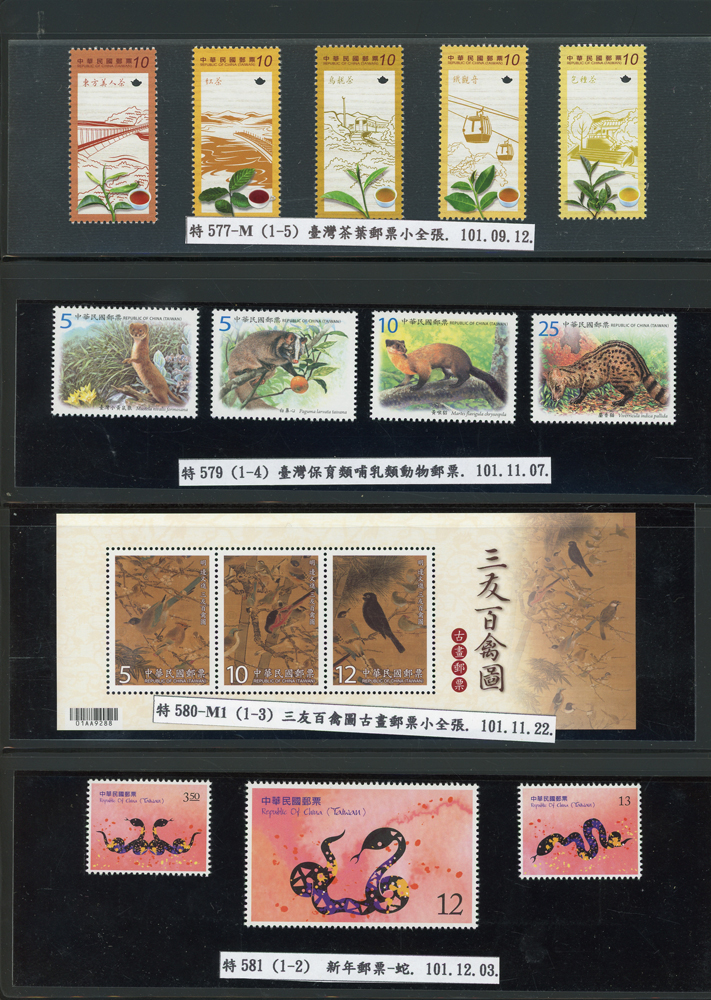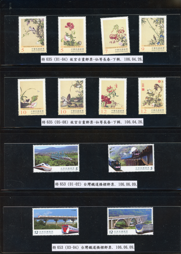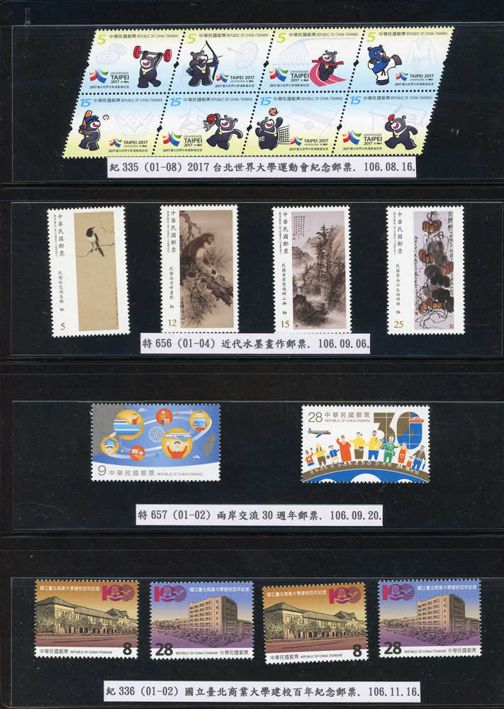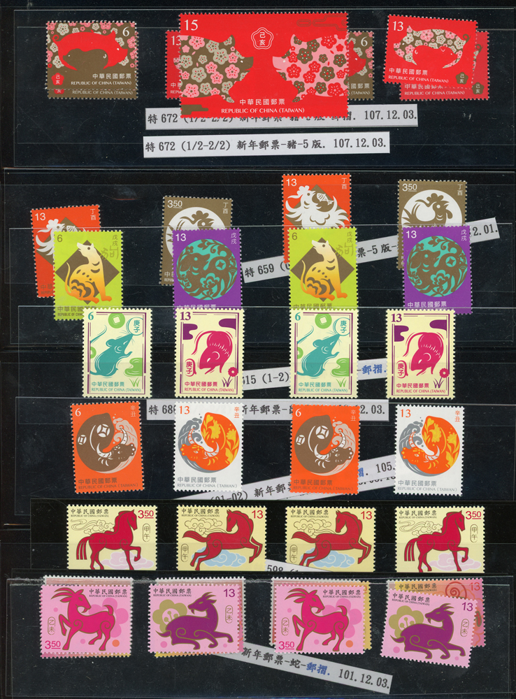 台灣2007~2018年成套新票一組,整理整齊於黑卡中,新票總面值共計NT$6939元,每套均包覆護袋,旁加註說明,包括有:世界童軍百週年.生肖(鼠.牛.虎.豬.狗.雞.馬.羊).台北2008第21屆亞洲國際郵展.節慶.蝴蝶.蔣故總統國先生百年誕辰.大貓熊.欠資.台灣近代畫作.古物.歡樂時光.香山九老小全張.台北國際花卉博覽會.慶典煙火.情人節.三友百禽圖小全張.清代刺繡.古代文物.戲嬰圖.文會樂雅集.台灣史前文物.郎世寧古畫.仙萼長春.近代水墨畫作等等,品種豐富或有重複,VF;歡迎至官網瀏覽全貌