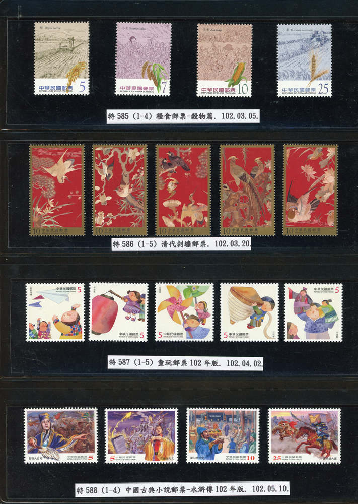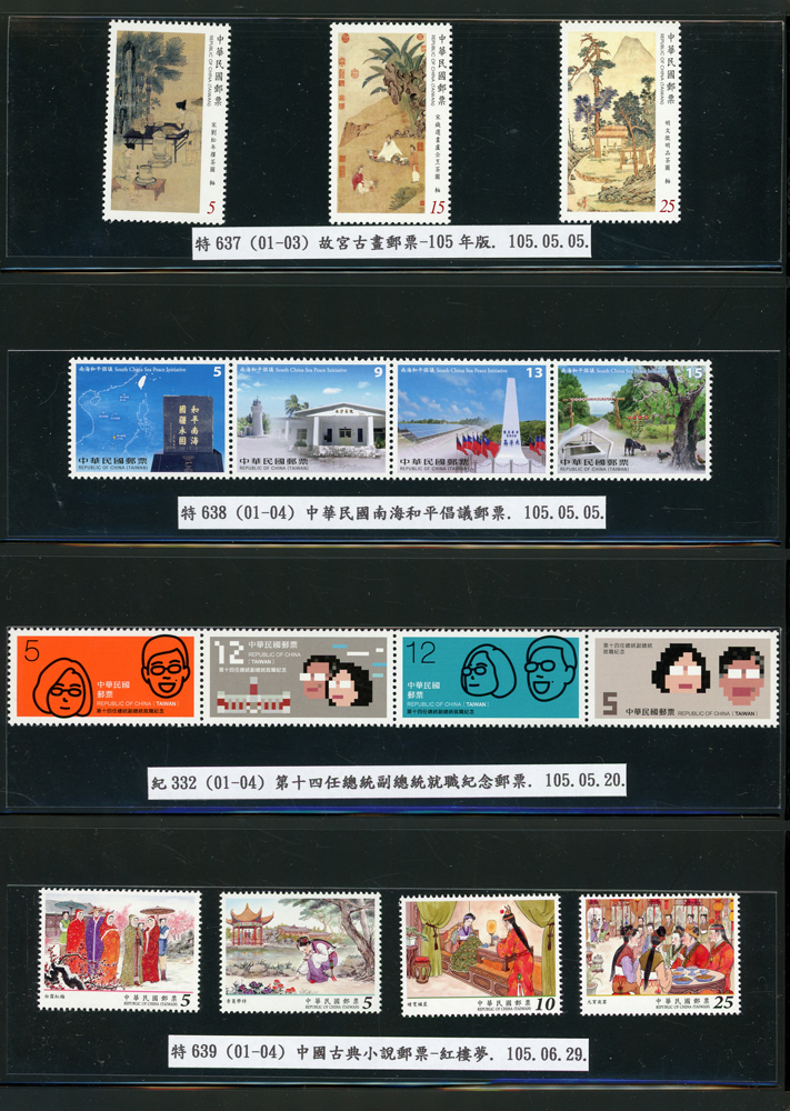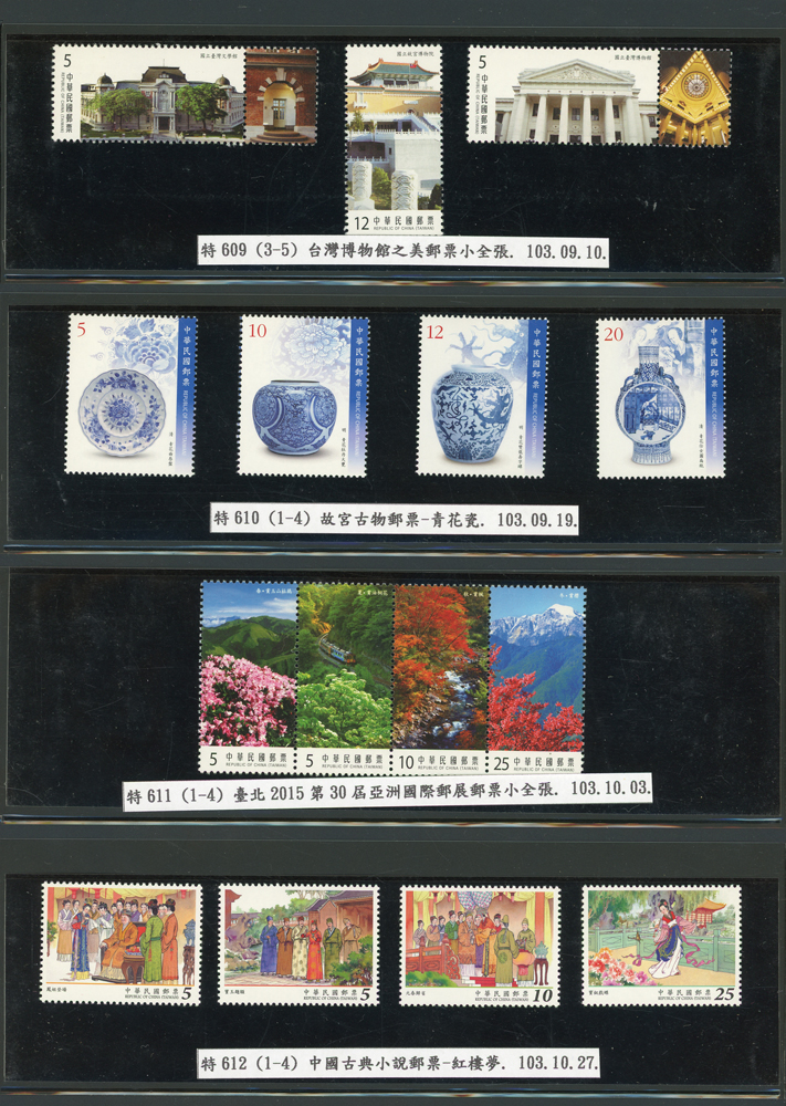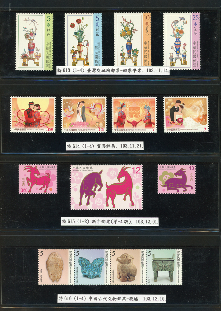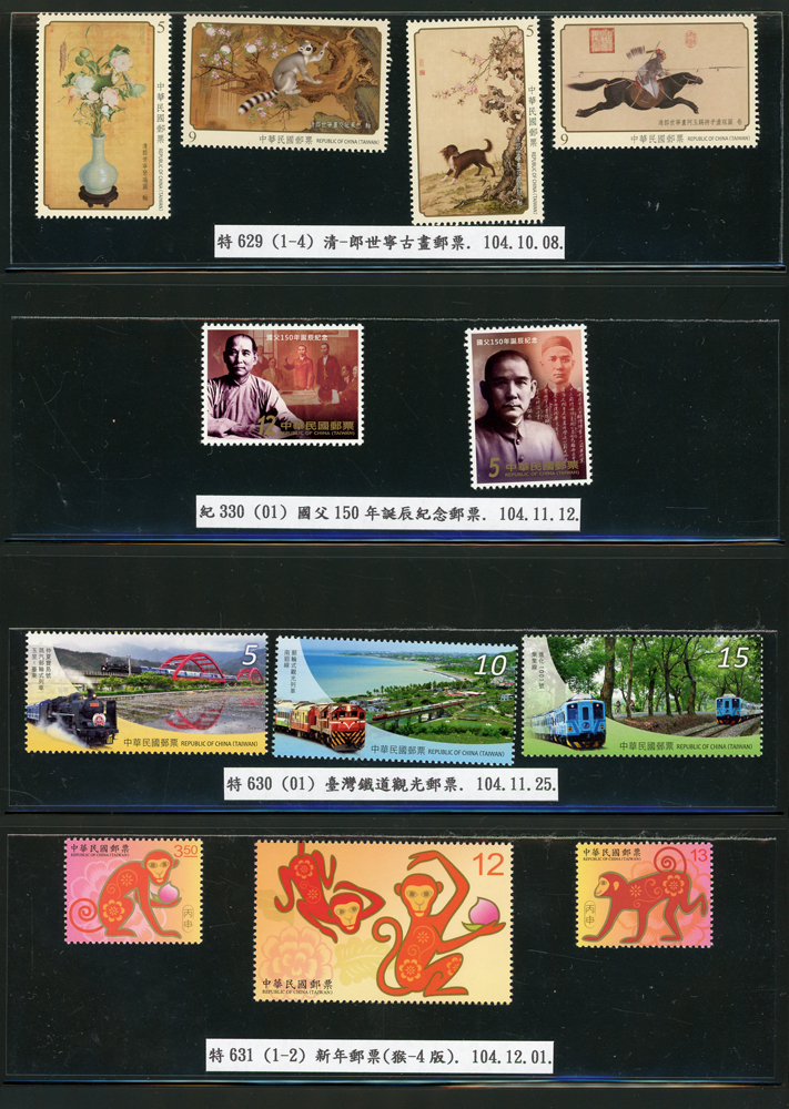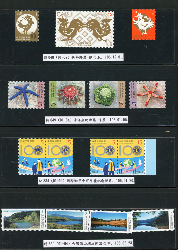 台灣2007~2018年成套新票一組,整理整齊於黑卡中,新票總面值共計NT$6939元,每套均包覆護袋,旁加註說明,包括有:世界童軍百週年.生肖(鼠.牛.虎.豬.狗.雞.馬.羊).台北2008第21屆亞洲國際郵展.節慶.蝴蝶.蔣故總統國先生百年誕辰.大貓熊.欠資.台灣近代畫作.古物.歡樂時光.香山九老小全張.台北國際花卉博覽會.慶典煙火.情人節.三友百禽圖小全張.清代刺繡.古代文物.戲嬰圖.文會樂雅集.台灣史前文物.郎世寧古畫.仙萼長春.近代水墨畫作等等,品種豐富或有重複,VF;歡迎至官網瀏覽全貌