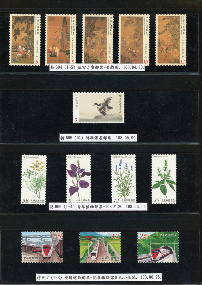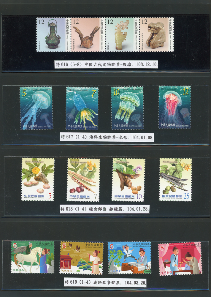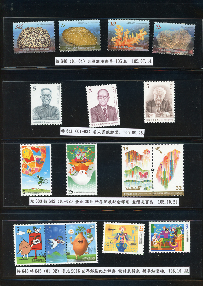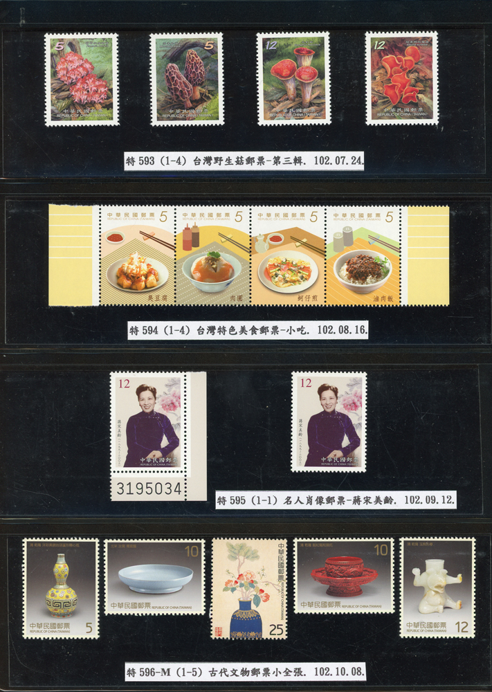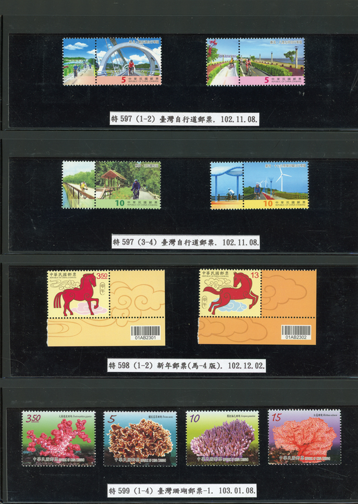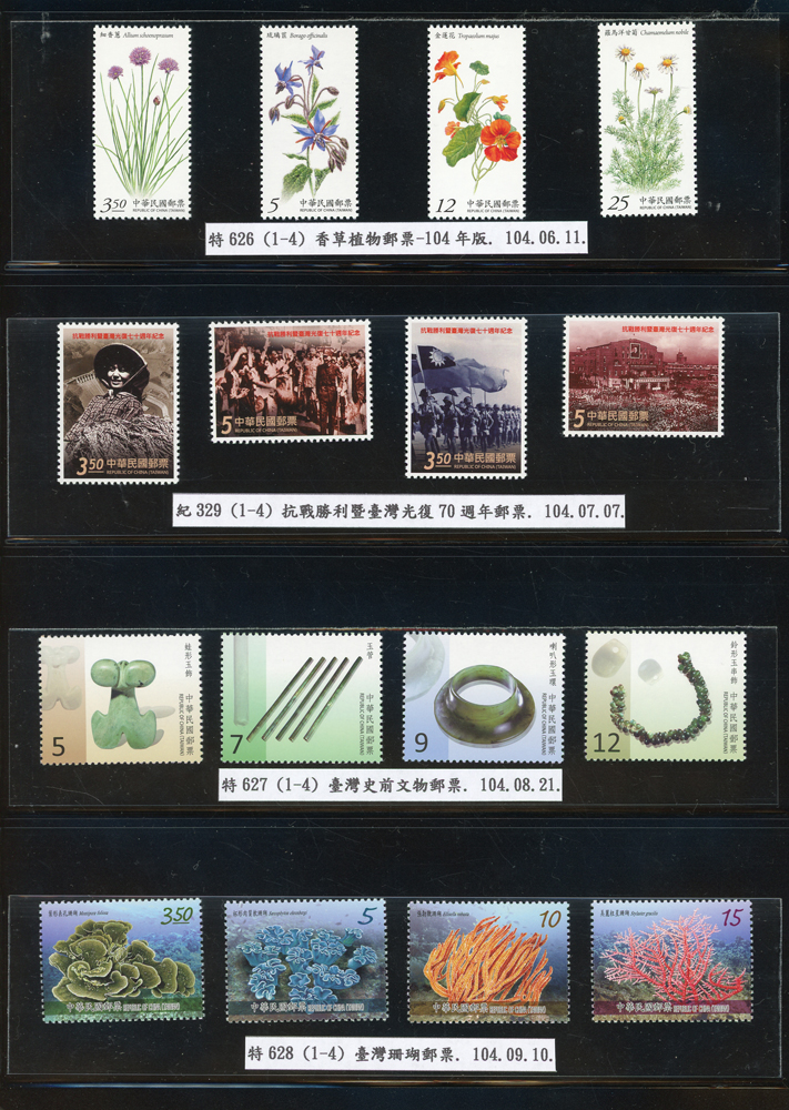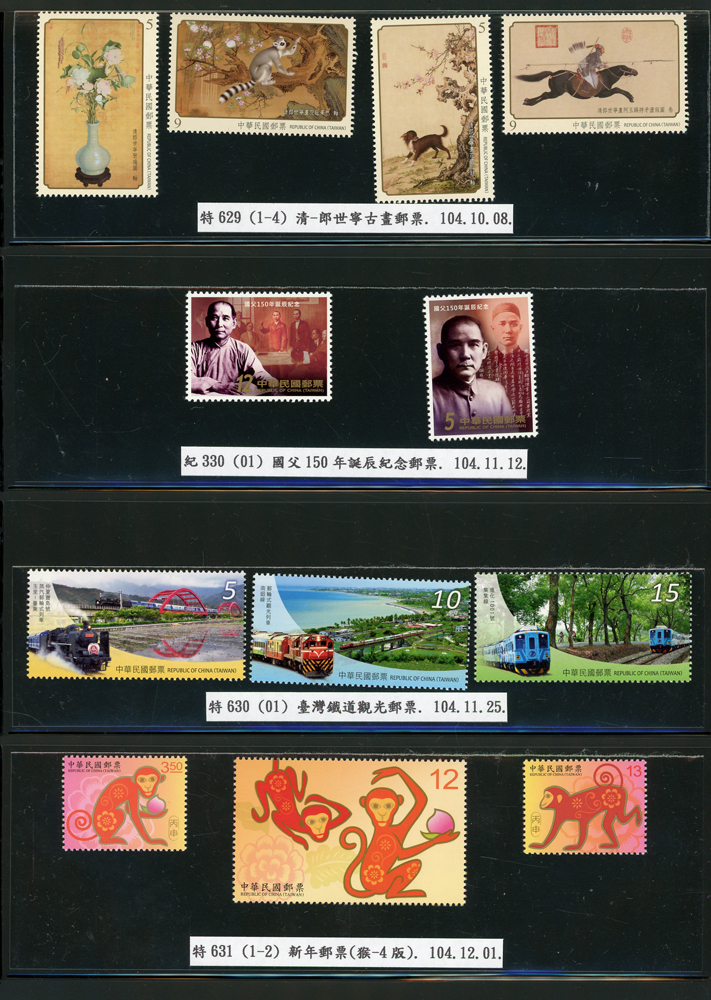 台灣2007~2018年成套新票一組,整理整齊於黑卡中,新票總面值共計NT$6939元,每套均包覆護袋,旁加註說明,包括有:世界童軍百週年.生肖(鼠.牛.虎.豬.狗.雞.馬.羊).台北2008第21屆亞洲國際郵展.節慶.蝴蝶.蔣故總統國先生百年誕辰.大貓熊.欠資.台灣近代畫作.古物.歡樂時光.香山九老小全張.台北國際花卉博覽會.慶典煙火.情人節.三友百禽圖小全張.清代刺繡.古代文物.戲嬰圖.文會樂雅集.台灣史前文物.郎世寧古畫.仙萼長春.近代水墨畫作等等,品種豐富或有重複,VF;歡迎至官網瀏覽全貌