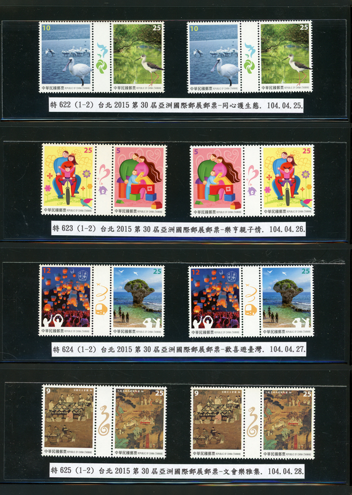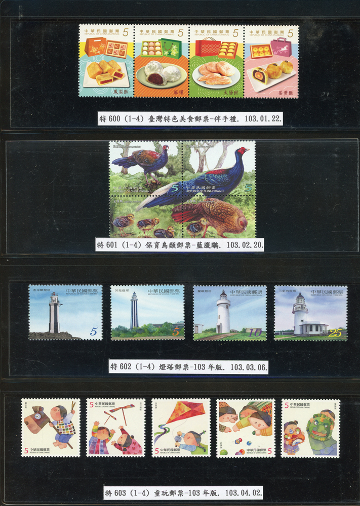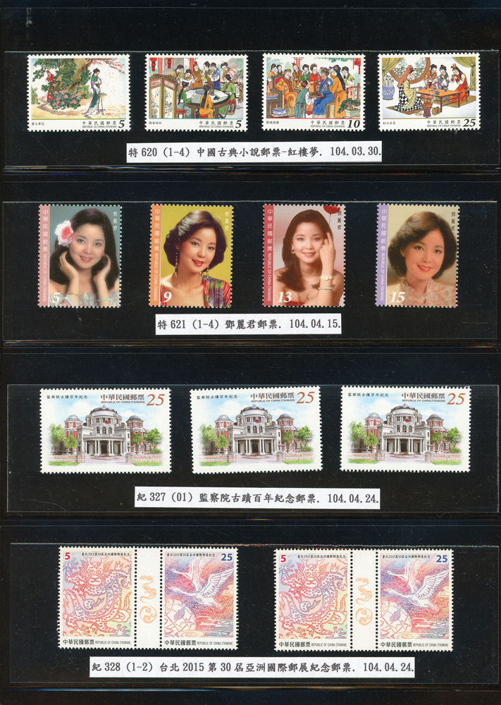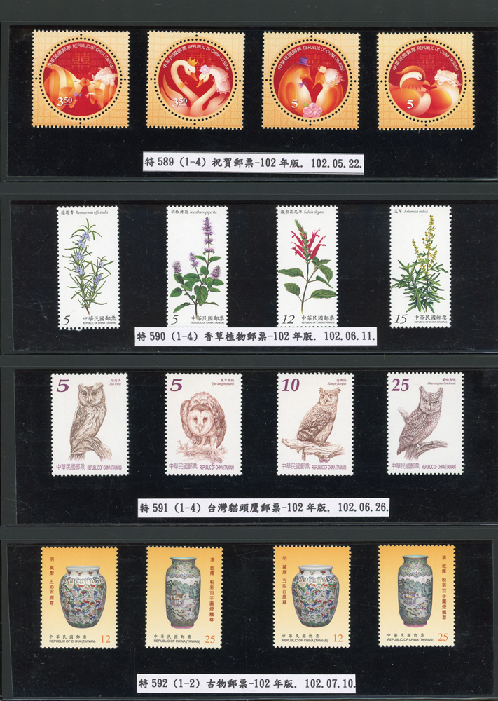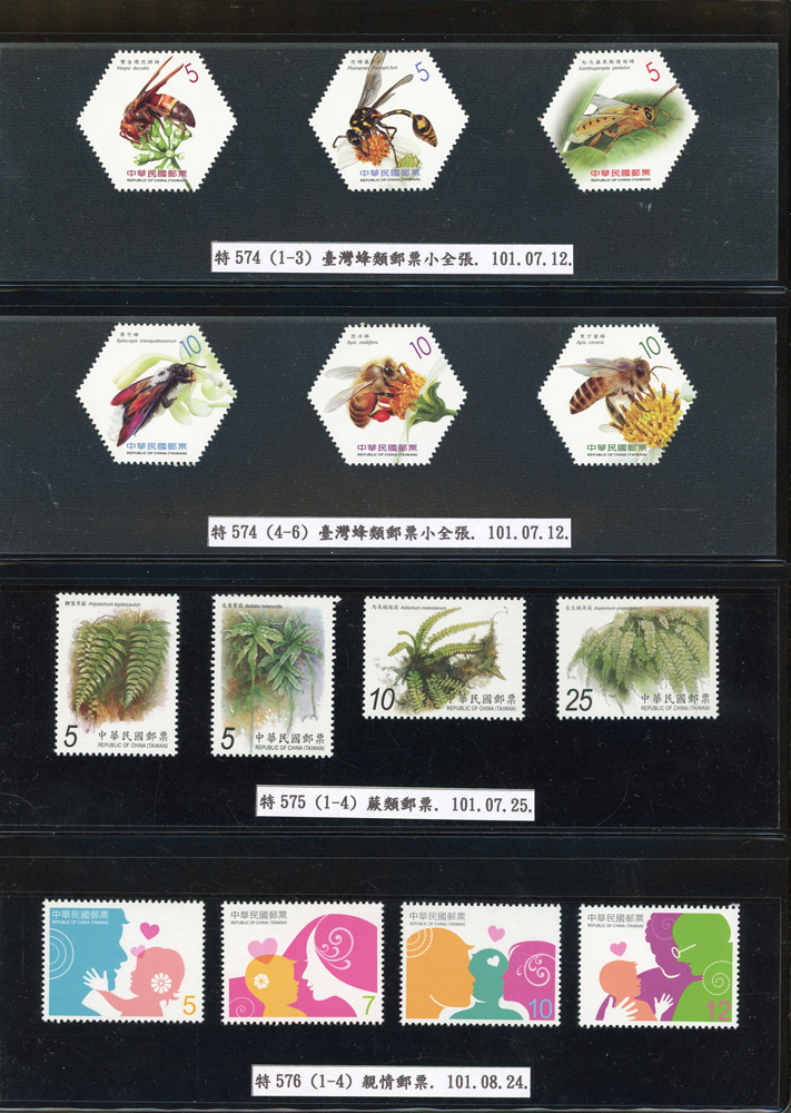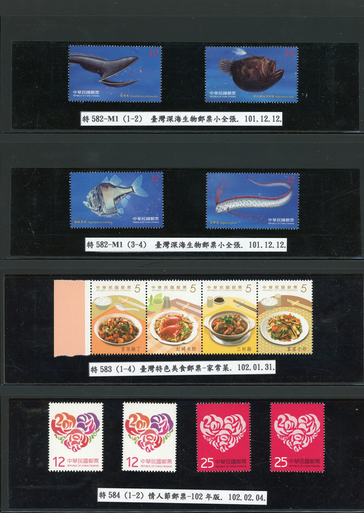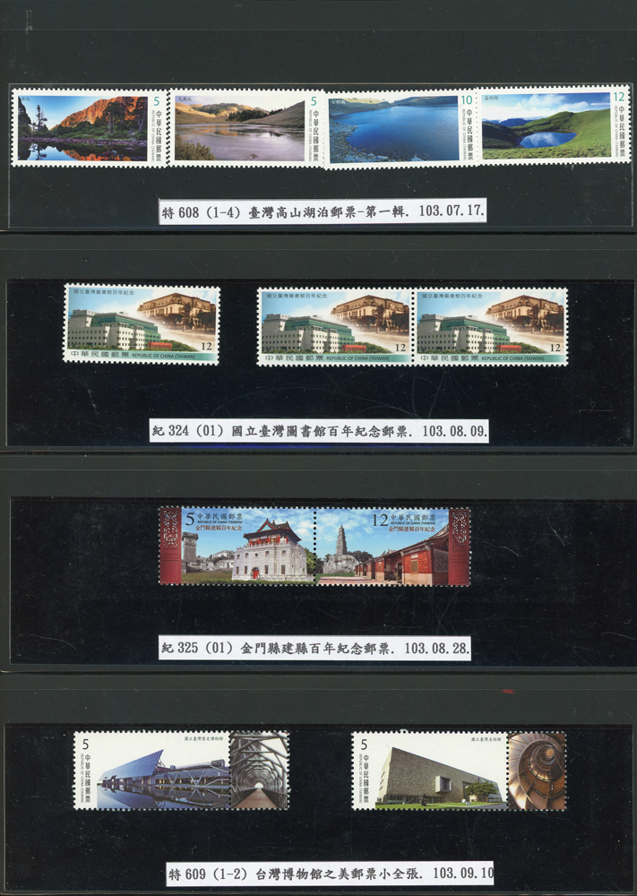 台灣2007~2018年成套新票一組,整理整齊於黑卡中,新票總面值共計NT$6939元,每套均包覆護袋,旁加註說明,包括有:世界童軍百週年.生肖(鼠.牛.虎.豬.狗.雞.馬.羊).台北2008第21屆亞洲國際郵展.節慶.蝴蝶.蔣故總統國先生百年誕辰.大貓熊.欠資.台灣近代畫作.古物.歡樂時光.香山九老小全張.台北國際花卉博覽會.慶典煙火.情人節.三友百禽圖小全張.清代刺繡.古代文物.戲嬰圖.文會樂雅集.台灣史前文物.郎世寧古畫.仙萼長春.近代水墨畫作等等,品種豐富或有重複,VF;歡迎至官網瀏覽全貌