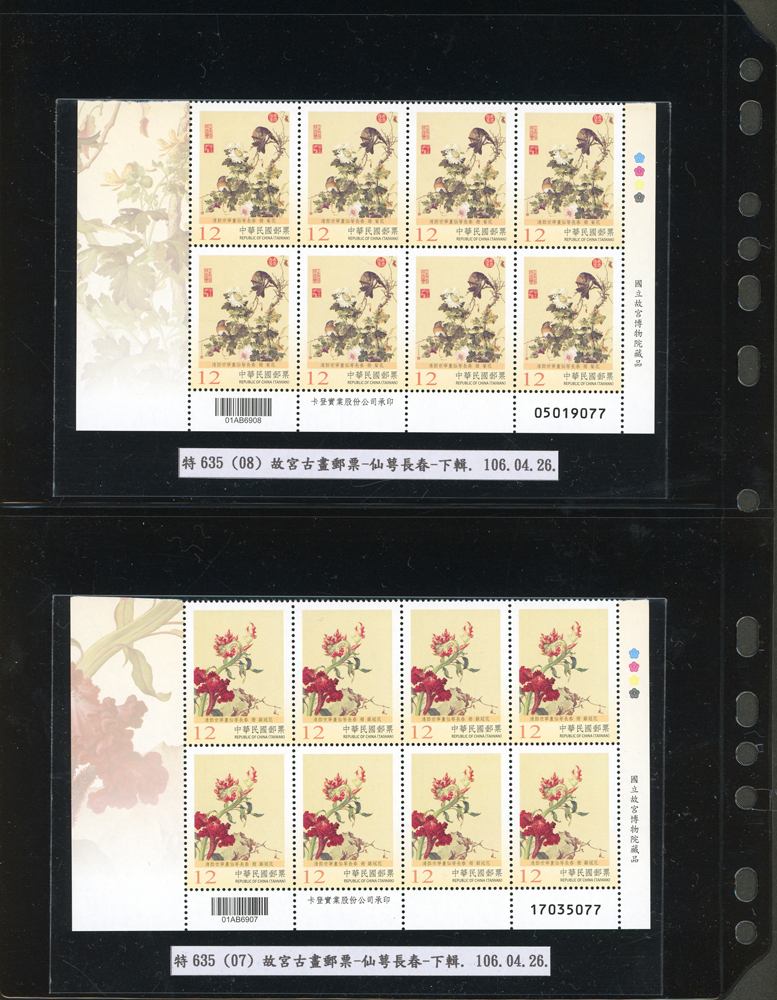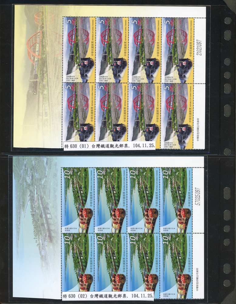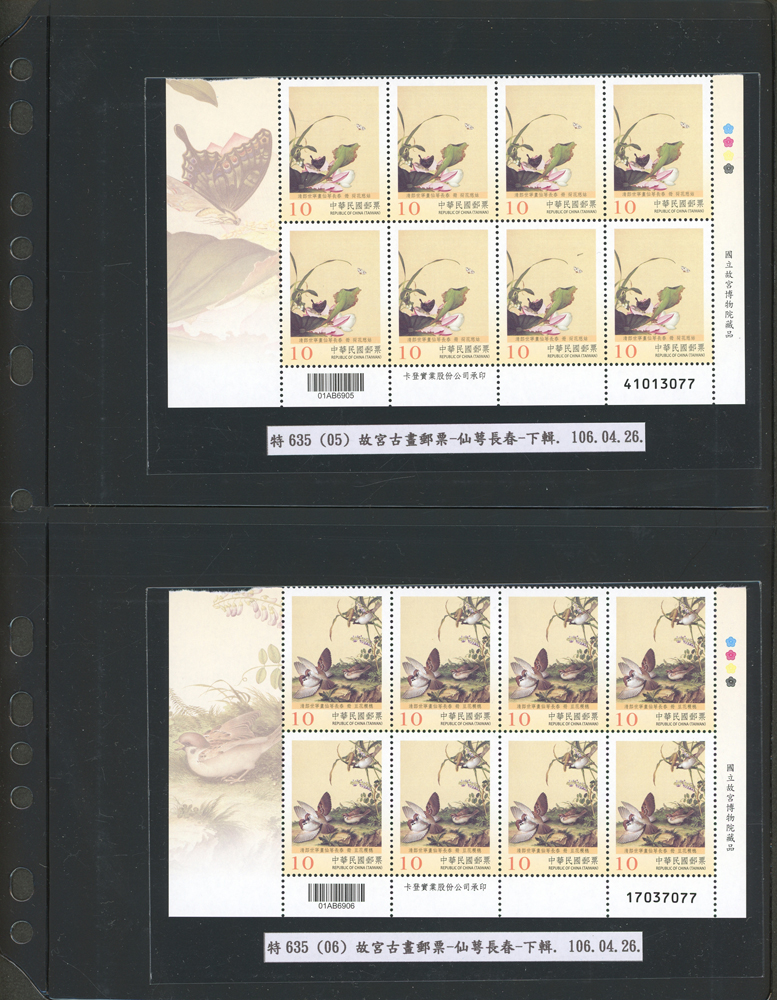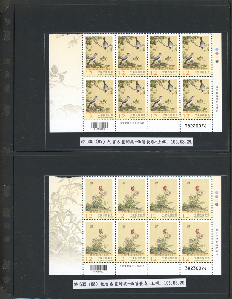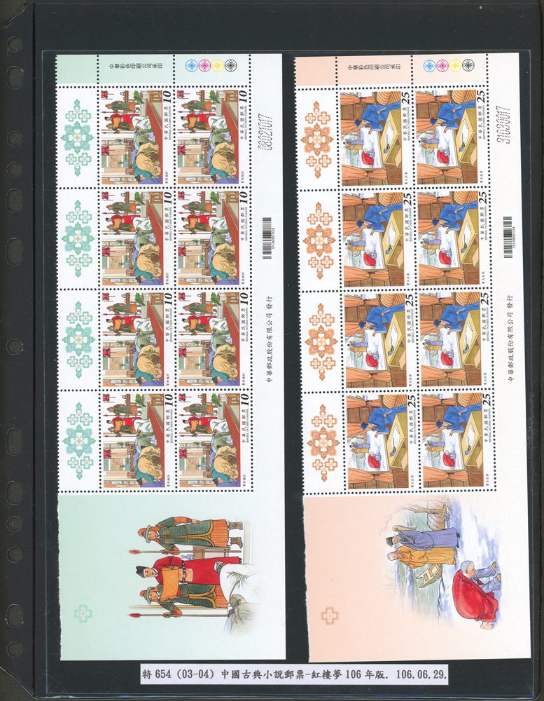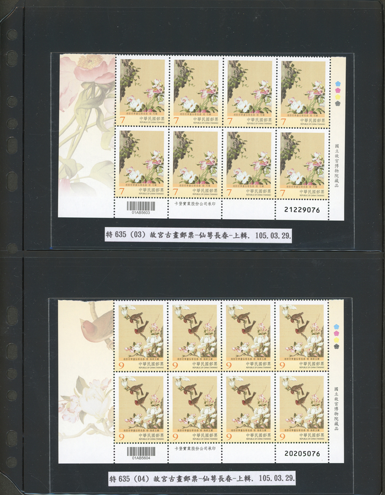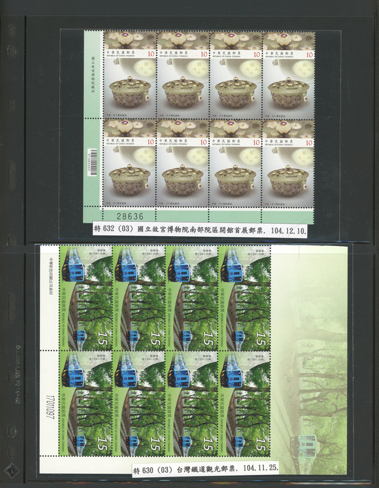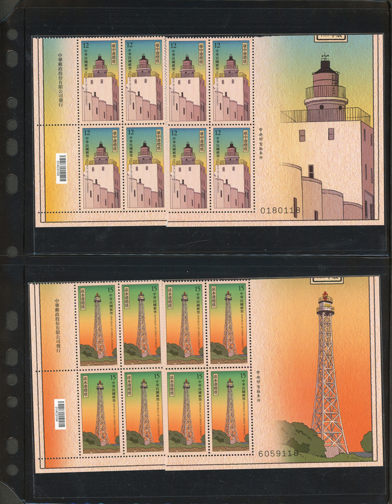 台灣2015~2021年成套新票一組,多數為八方連帶三邊紙廠銘或張號或色標,總面值共計NT$5024元,包括有:清郎世寧古畫,寶島風情-台中市,紅樓夢(2017年版),抗戰勝利暨臺灣光復70週年,臺灣史前文物(2015年版),臺灣珊瑚(2018年),國父150年誕辰,四輪生肖猴.鼠,台灣鐵道觀光,國立故宮博物院南部院區開館首展,仙萼長春(上.下輯),燈塔(2018-2019年版),東沙環礁國家公園,防疫等,品種豐富,品像混合,多數保存佳,VF-F;歡迎至官網瀏覽全貌