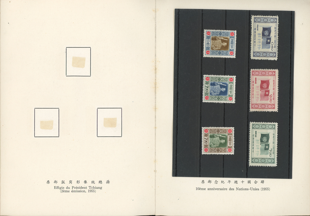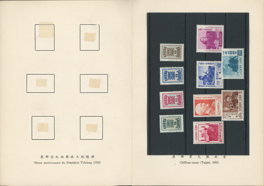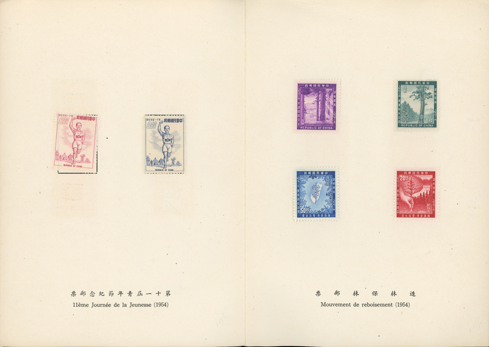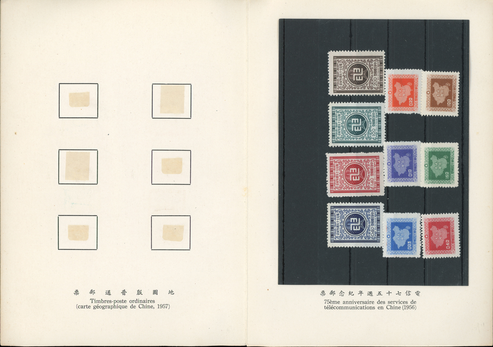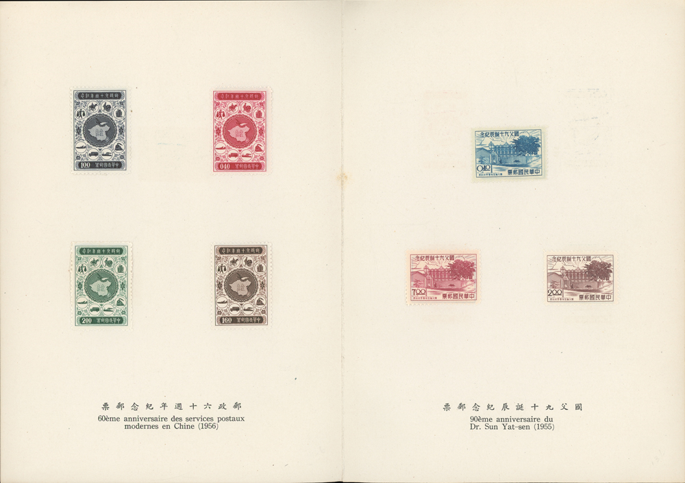 郵政總局贈外賓專冊『協和萬邦』精裝本1本,內貼有1954~1957年套票19套,小全張2枚,包括:造林保林.第十一屆青年節.台北版航空.救助越北僑胞附捐郵票.第二屆華僑節.反共義士.第二任總統就職週年.軍人節.聯合國十週年.蔣總統像影寫版.國父九十誕辰.郵政六十週年.郵政六十週年紀念展覽會小全張2全.兒童節.鐵路七十五週年.臺北版欠資.蔣總統七秩華誕.電信七十五週年.平版中華民國地圖.偉大的母教;品像混合,保存不錯,部分票脫落採護卡存放,VF-F;歡迎至官網瀏覽全貌(Page 118)
