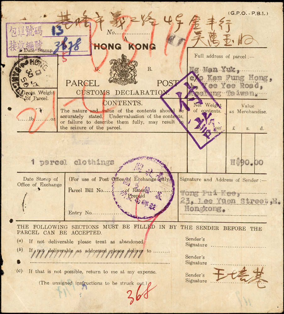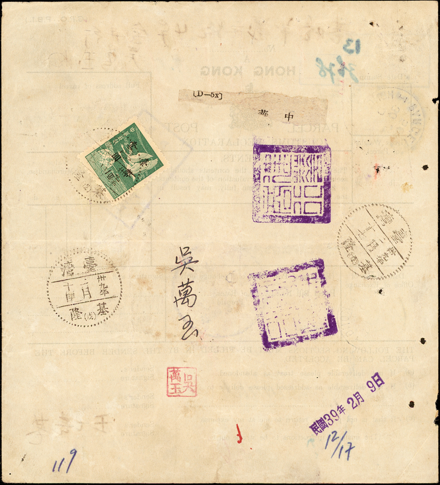 1950年香港寄基隆包裹報關單,背貼一版飛雁窄距1元1枚,銷臺灣基隆(戊)39.2.17戳;有裝訂孔,源自檔案(Page 119)