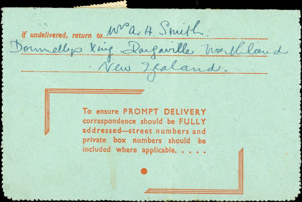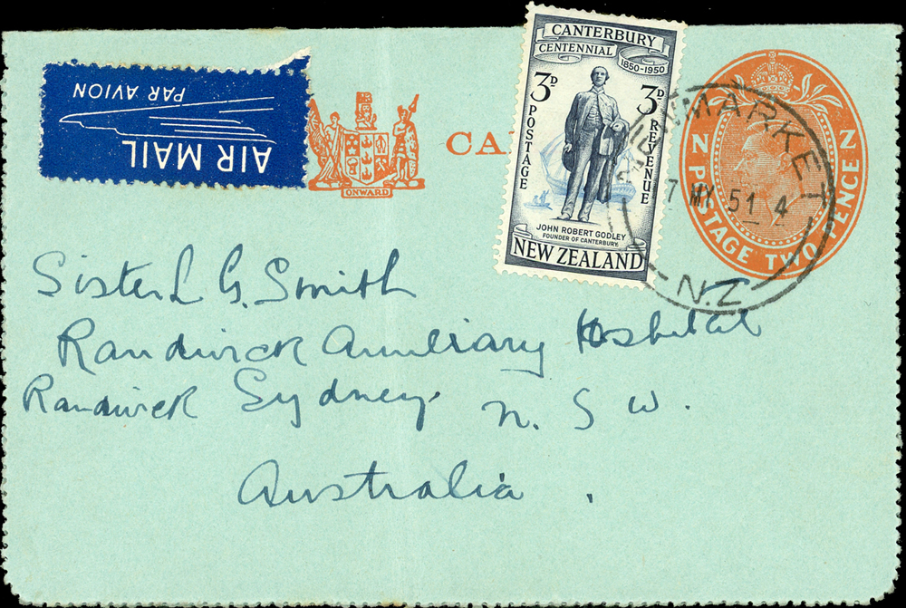 郵簡二件:(1)1957年丹麥寄埔里航空郵簡,貼丹麥郵票2枚銷納克斯科夫1957.10.3戳,背銷台北1957.10.11戳,埔里1957.10.12到戳;(2)1951年紐西蘭2便士郵簡加貼3D票1枚寄澳洲;林茂興舊藏(Page 120)