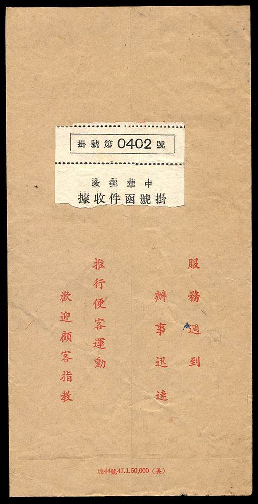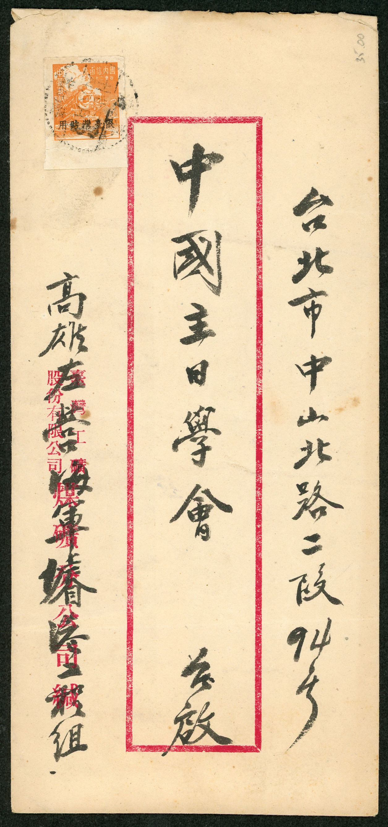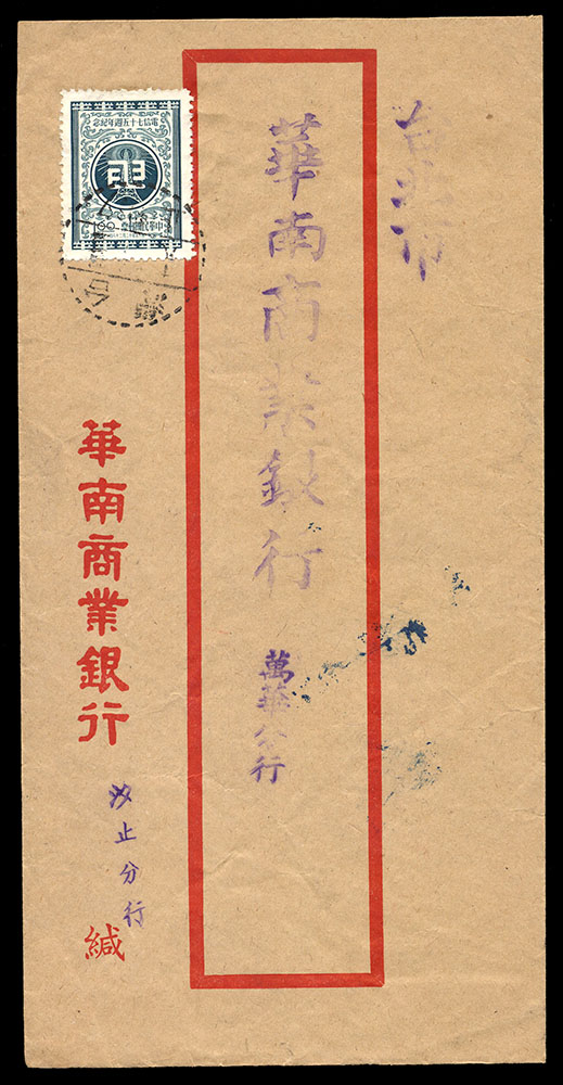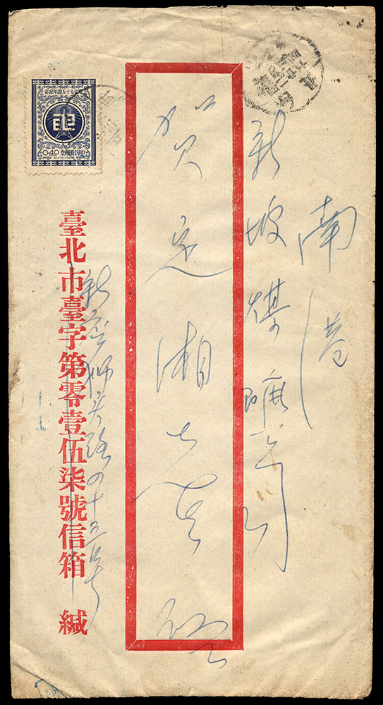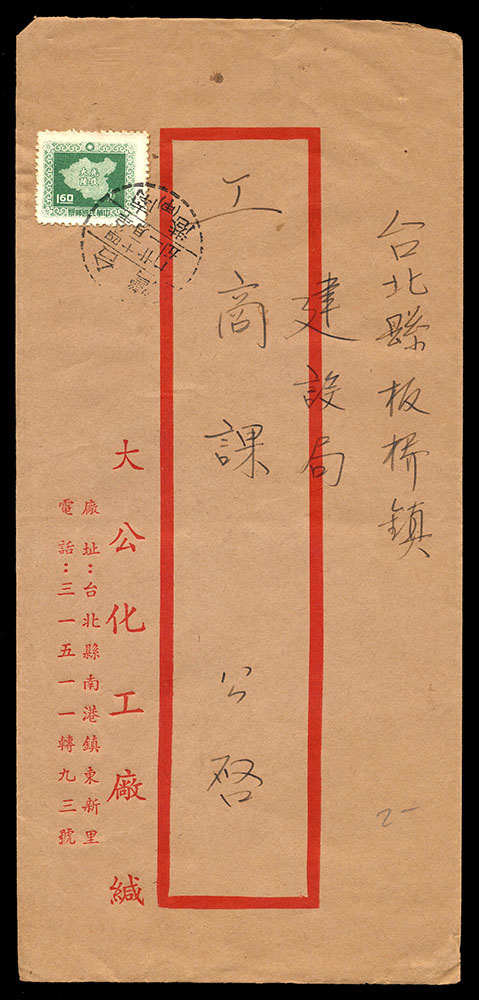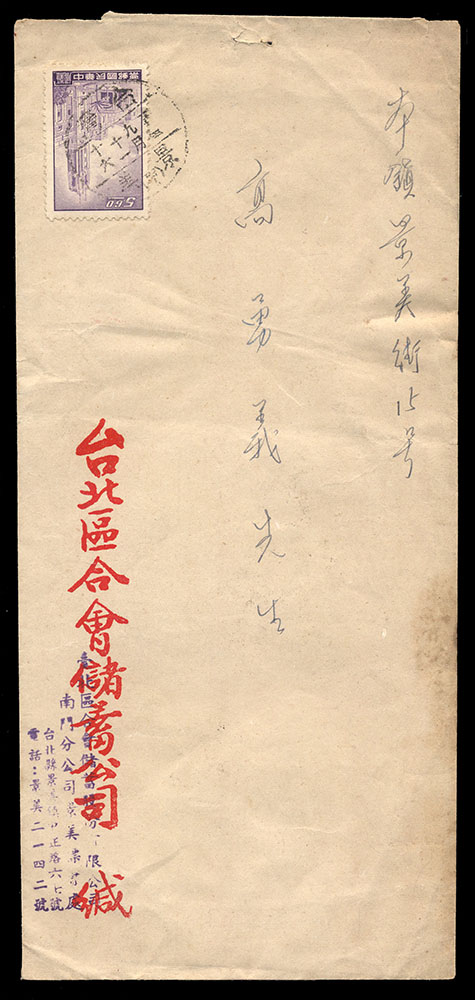 國內封五件:(1)1957年寄台北本市中式封,貼電信75週年4角一枚,銷戳戳不清,另銷台北到戳;(2)自台北汐止寄萬華中式掛號封,貼電信75週年1.6元一枚,銷台灣汐止戳(日期不清);(3)1959年自台北南港寄板橋中式掛號封,貼平版地圖1.6元一枚,銷台灣南港(甲)戳,另銷台灣板橋到戳;(4)自高雄寄台北中式封,貼國內信函費單位票線台灣貼用一枚,銷戳不清;(5)1962年自台北區合會儲蓄公司寄本地中式封,貼總統府5.6元一枚,銷台灣景美戳,背隔日到戳