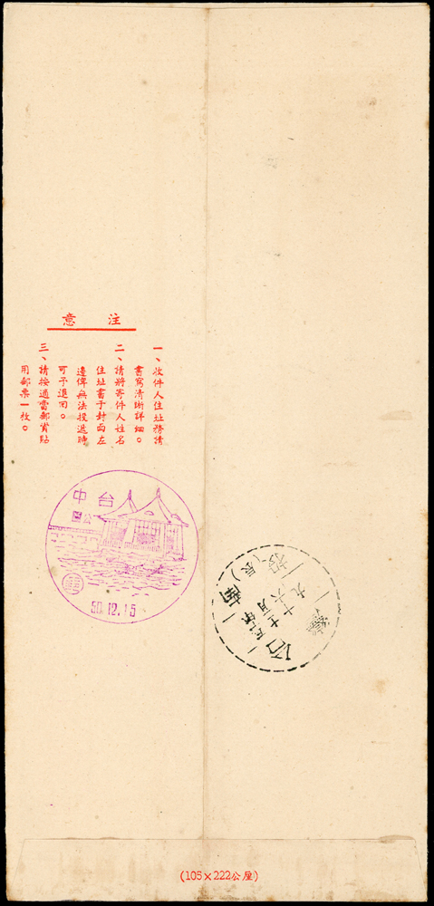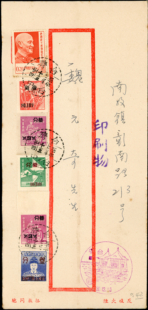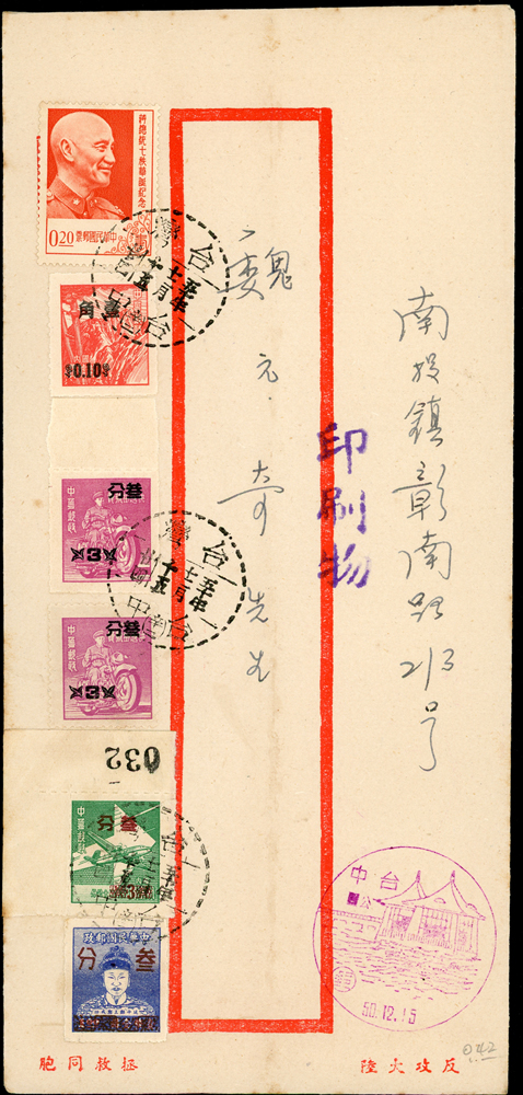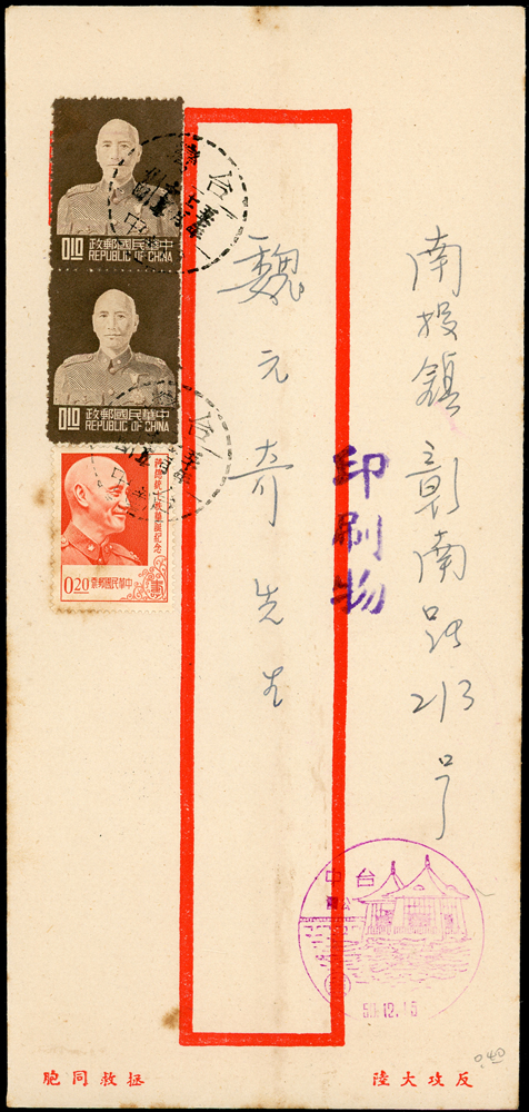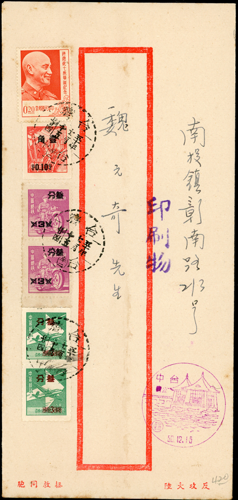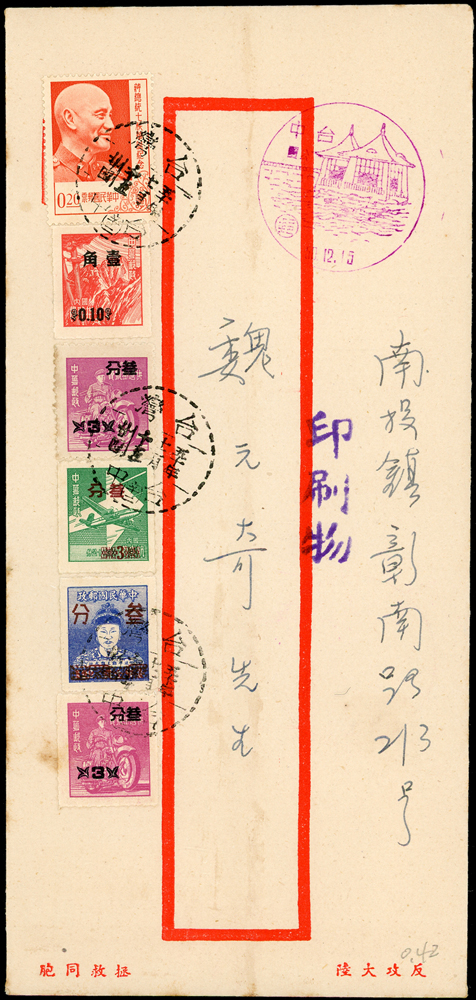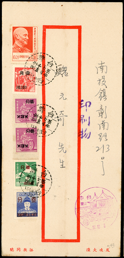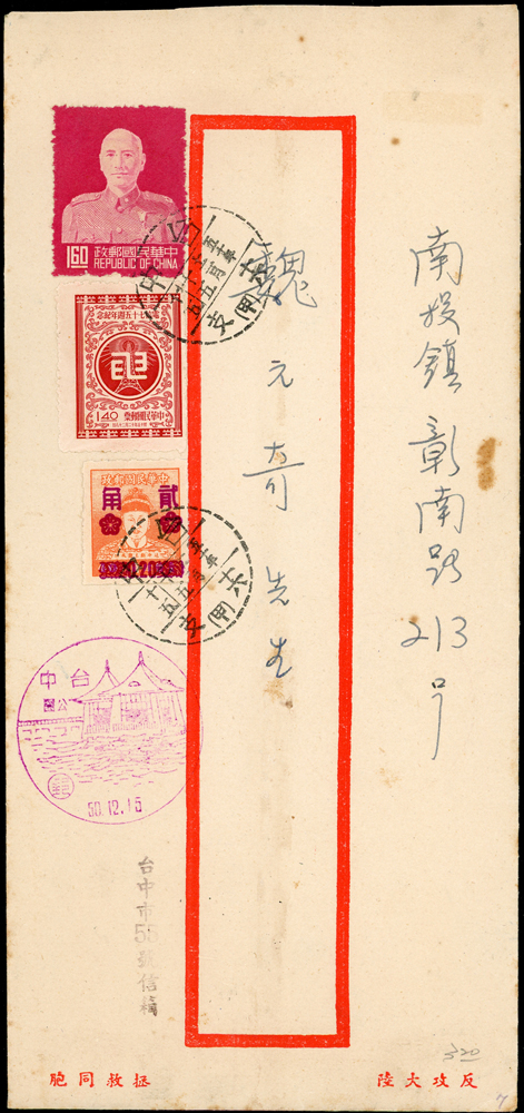 1961年台中寄南投限掛中式封2封,印刷品中式封7封,共9封,分別貼復行視事,台北版玉照,鄭成功像及其加蓋,七秩華誕,單位票改值等票,均銷台中50.12.15戳及台中公園紀戳,南投50.12.16到達戳(Page 121)
