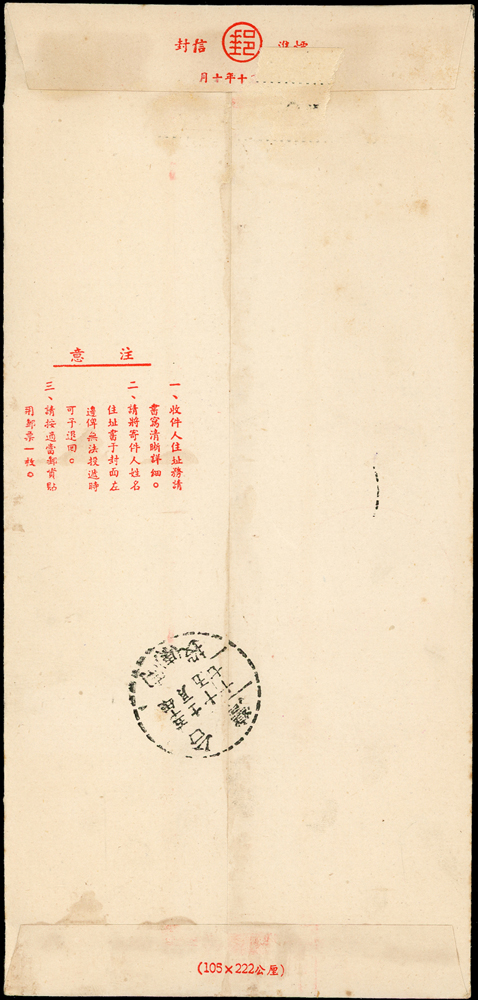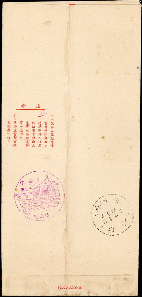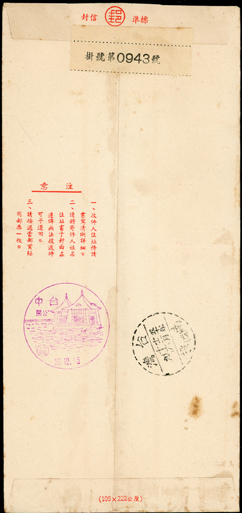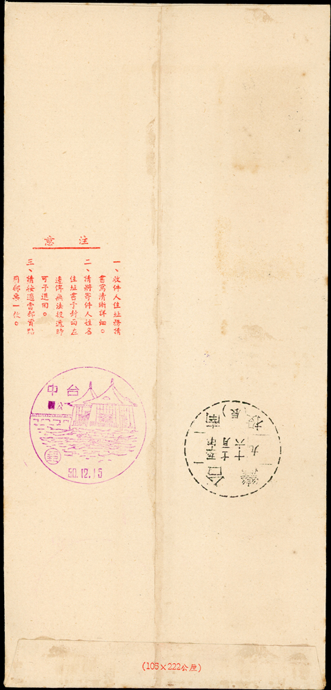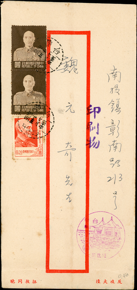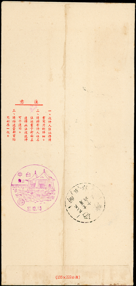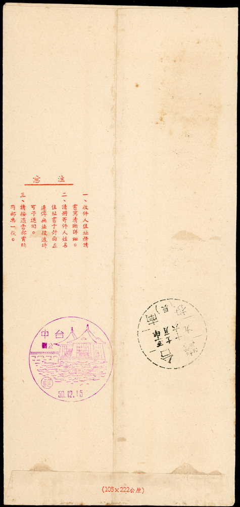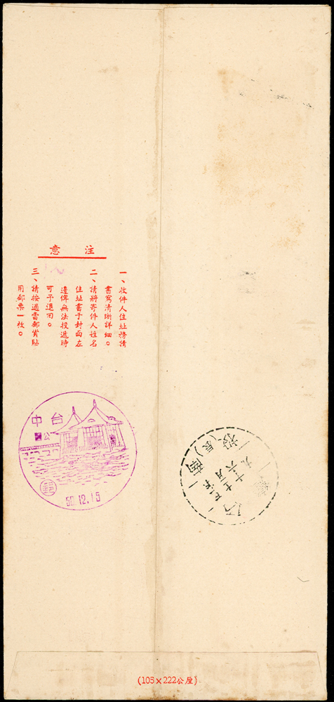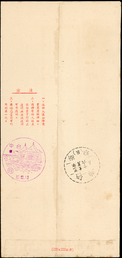 1961年台中寄南投限掛中式封2封,印刷品中式封7封,共9封,分別貼復行視事,台北版玉照,鄭成功像及其加蓋,七秩華誕,單位票改值等票,均銷台中50.12.15戳及台中公園紀戳,南投50.12.16到達戳(Page 121)